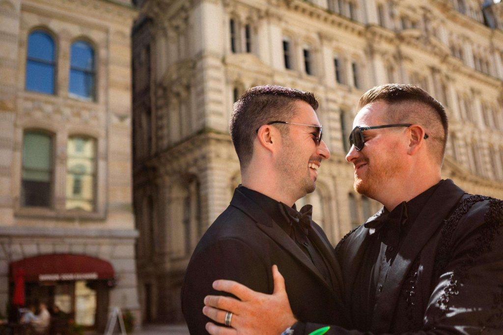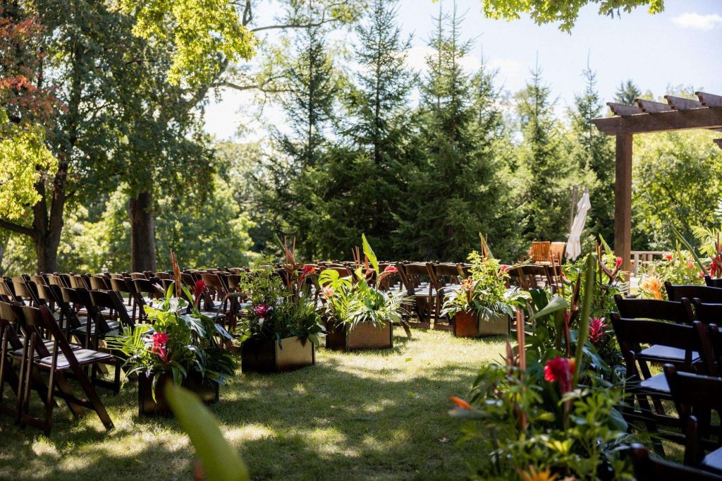 “The building of our custom tent in Andy’s Nana’s home in Wisconsin – We live in San Diego! A few other favorites included; the Ombre Rainbow friends table, outdoor ceremony under the pergola, the candles, the tropical floral and live elements and custom dance floor. WE LOVED EVERYTHING! It was the coldest day in September, but also was okay with us.”
