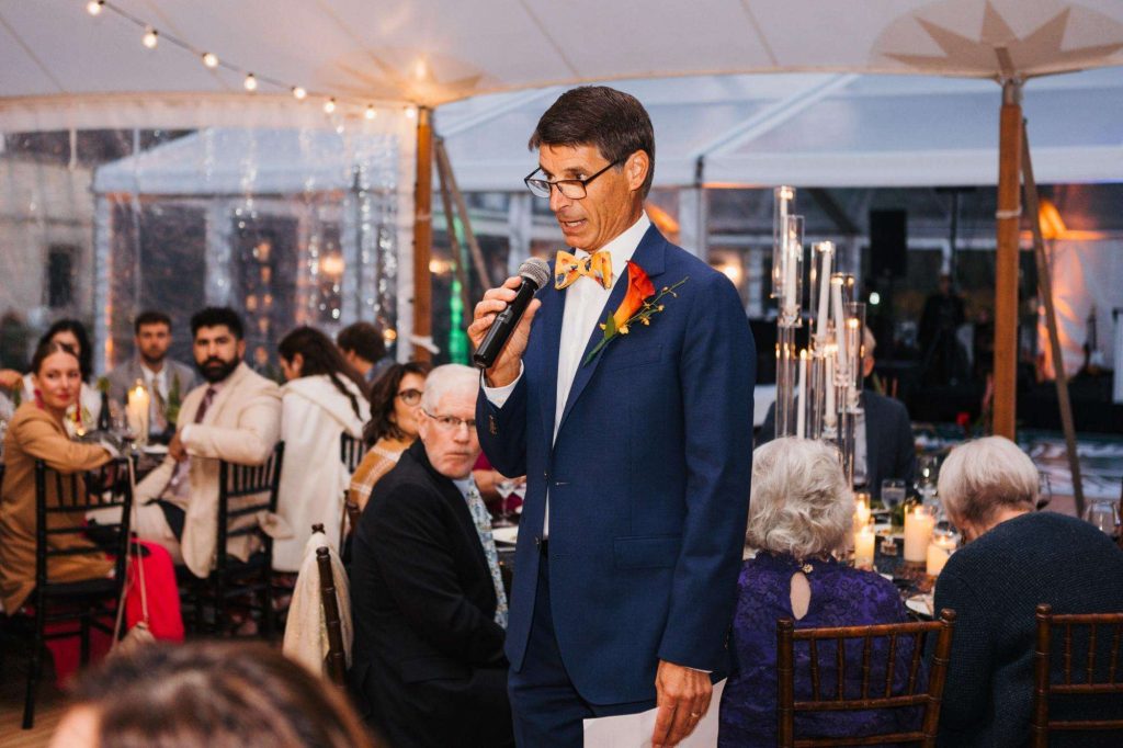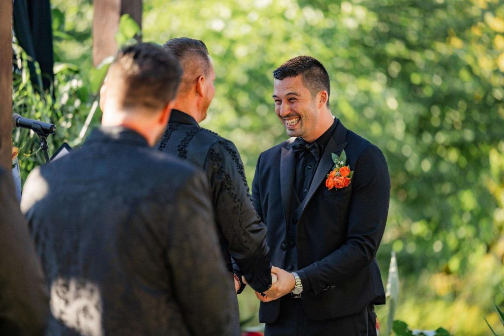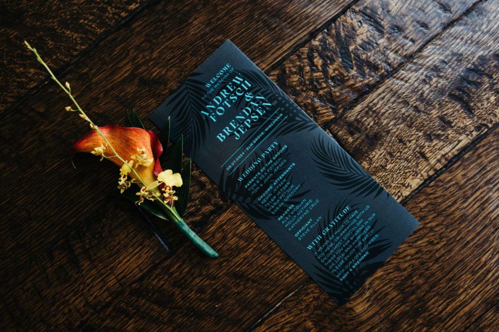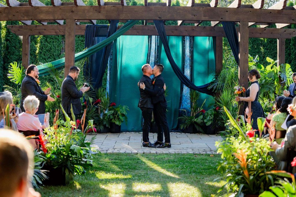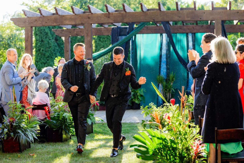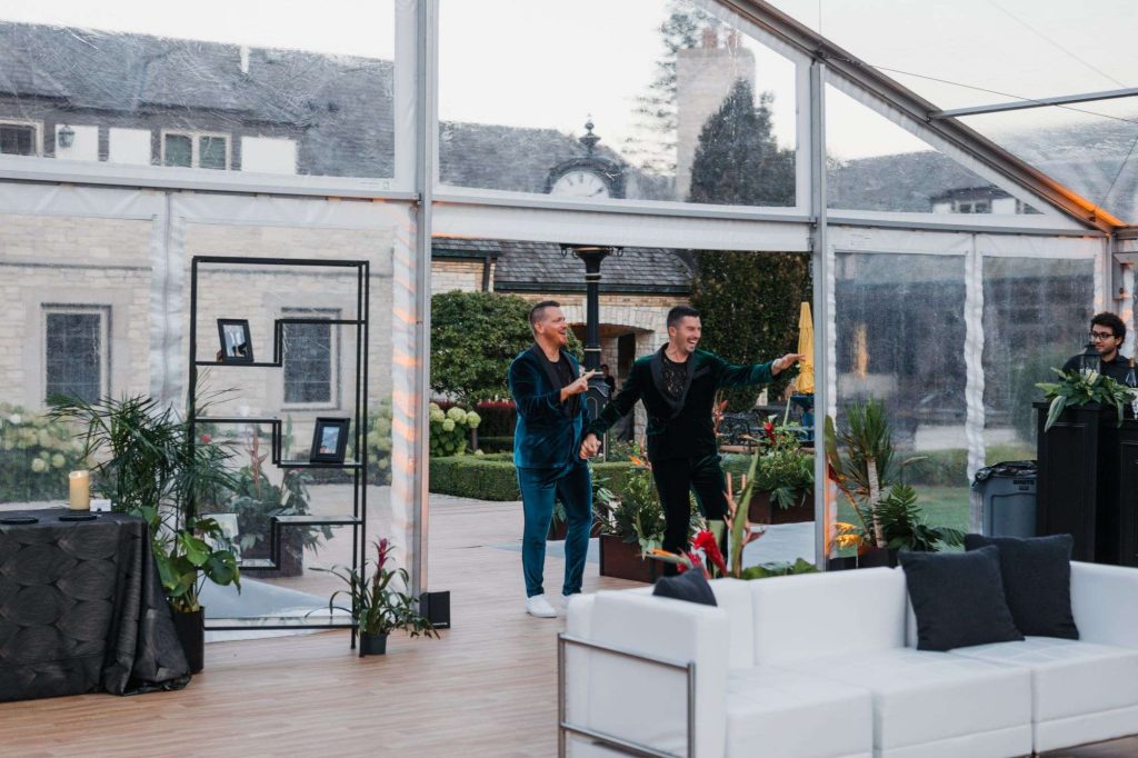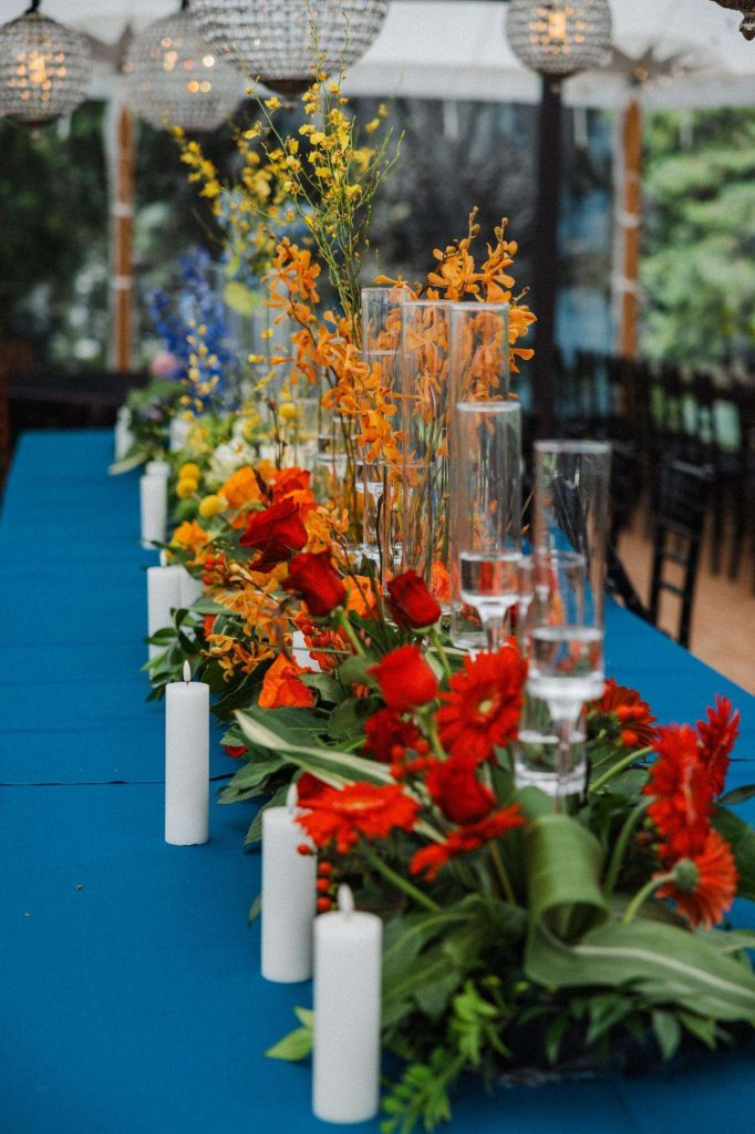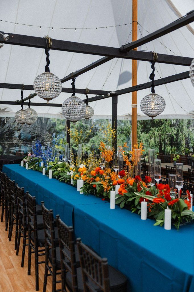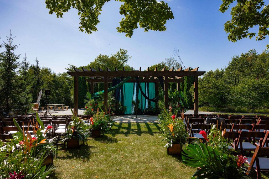 “The building of our custom tent in Andy’s Nana’s home in Wisconsin – We live in San Diego! A few other favorites included; the Ombre Rainbow friends table, outdoor ceremony under the pergola, the candles, the tropical floral and live elements and custom dance floor. WE LOVED EVERYTHING! It was the coldest day in September, but also was okay with us.”