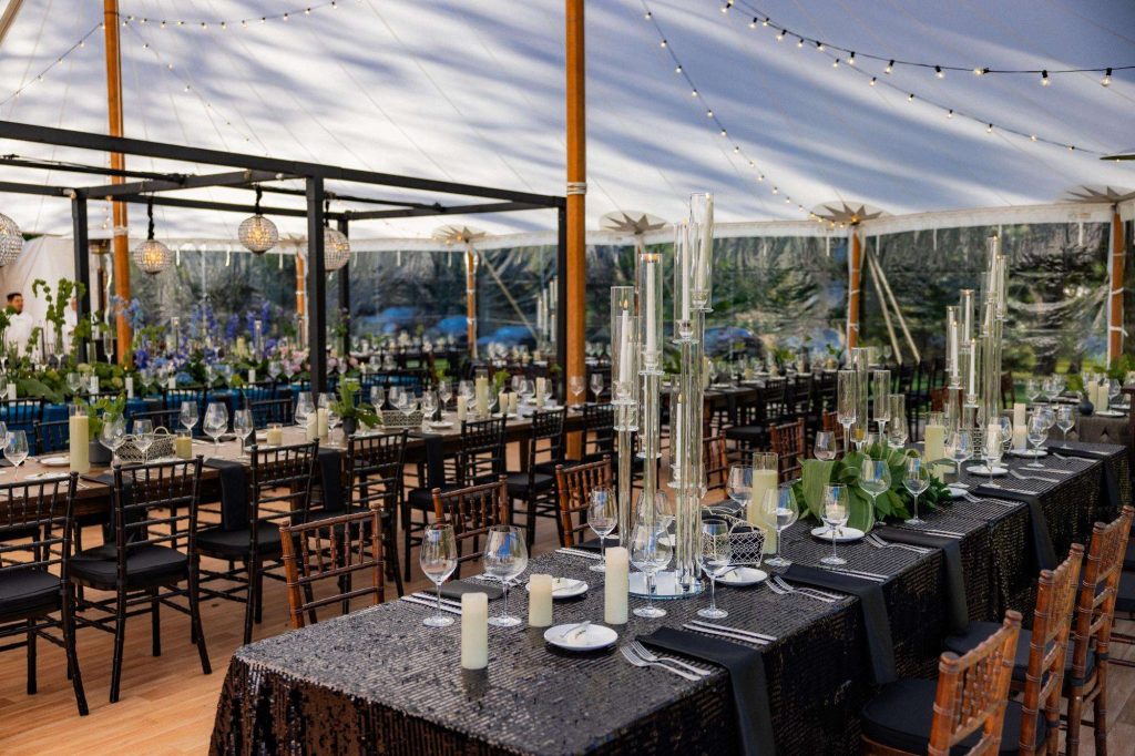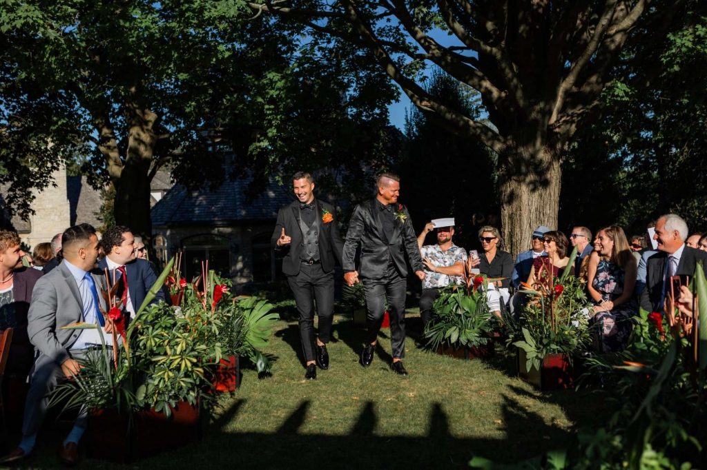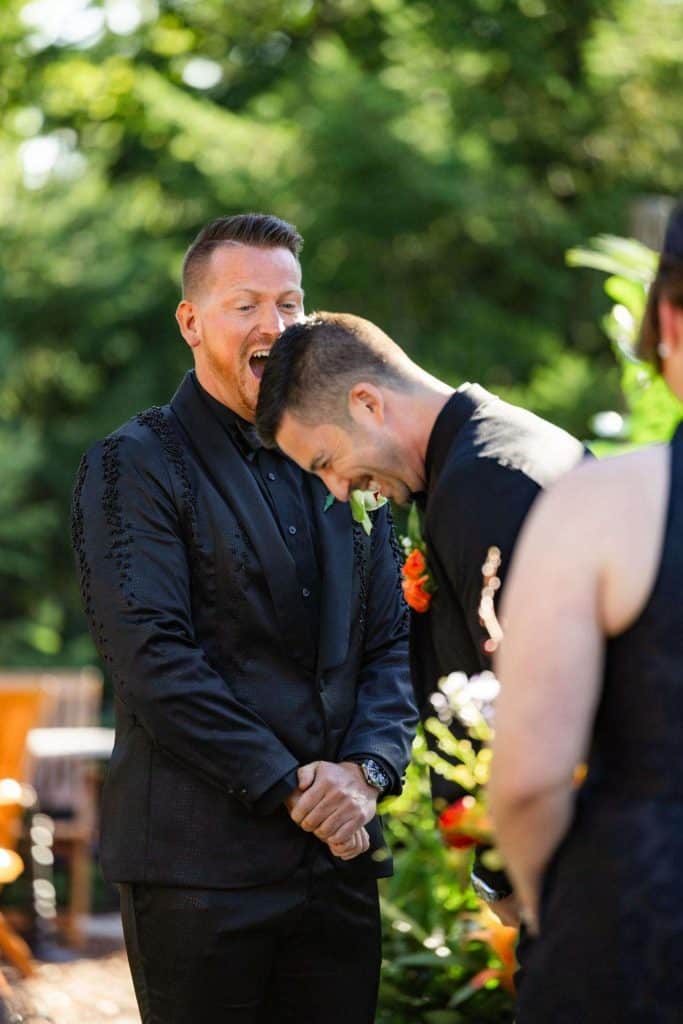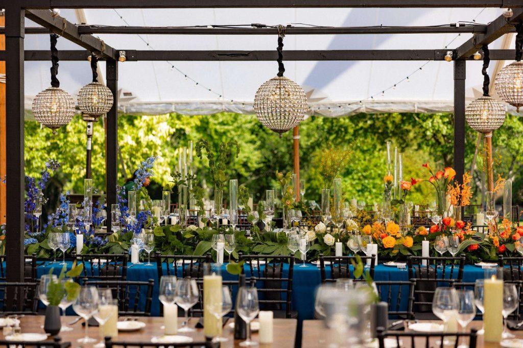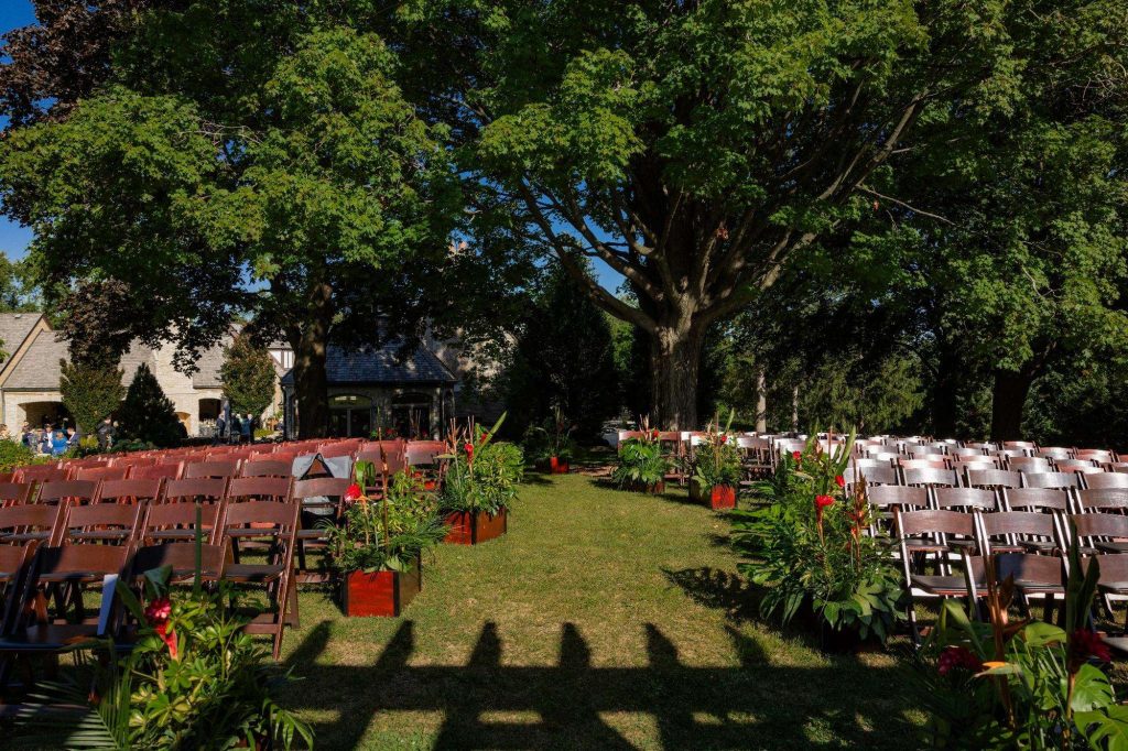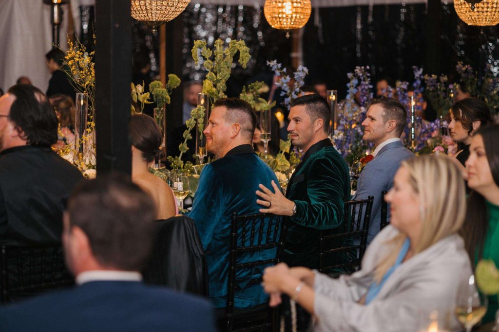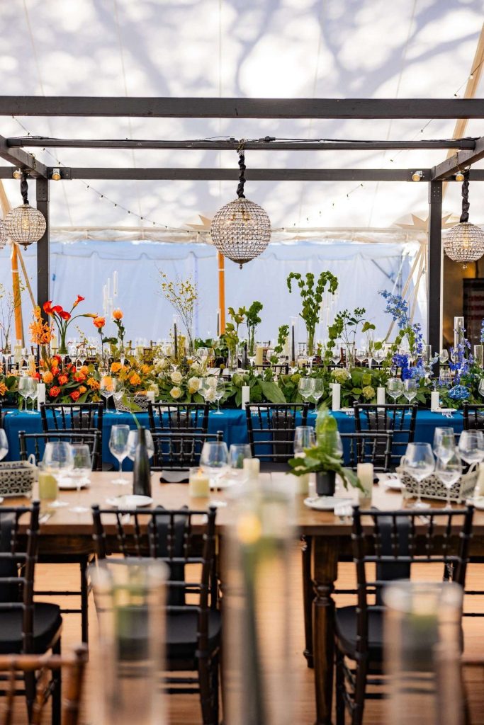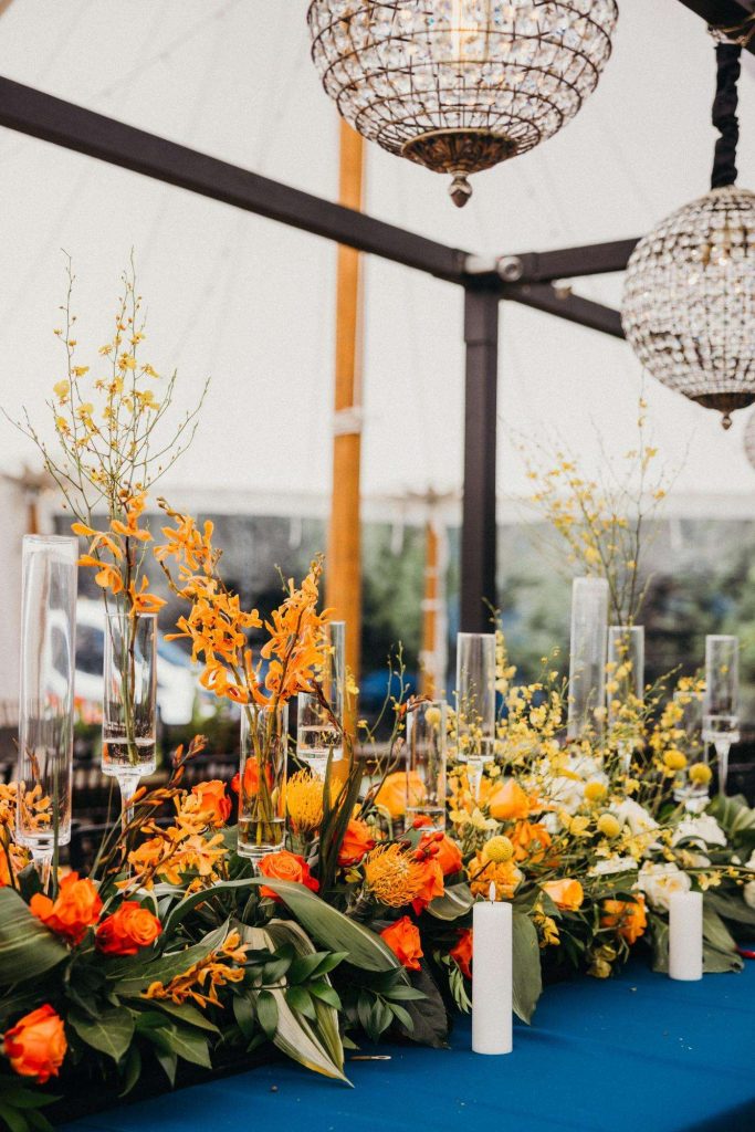 “The building of our custom tent in Andy’s Nana’s home in Wisconsin – We live in San Diego! A few other favorites included; the Ombre Rainbow friends table, outdoor ceremony under the pergola, the candles, the tropical floral and live elements and custom dance floor. WE LOVED EVERYTHING! It was the coldest day in September, but also was okay with us.”