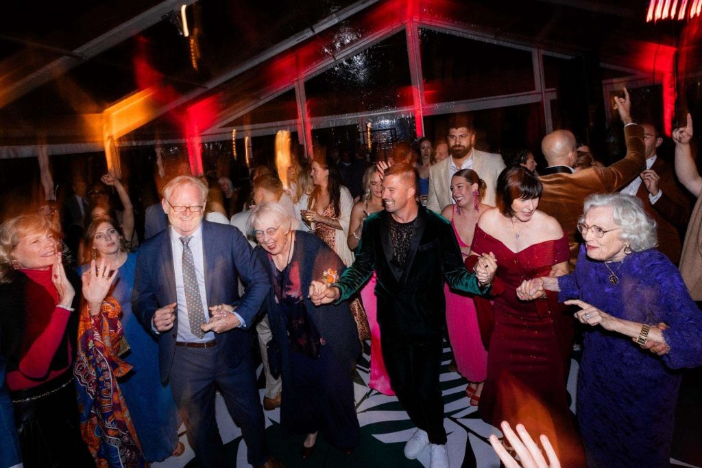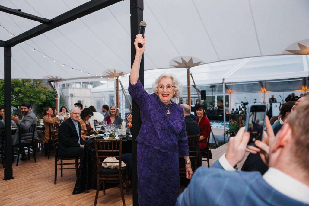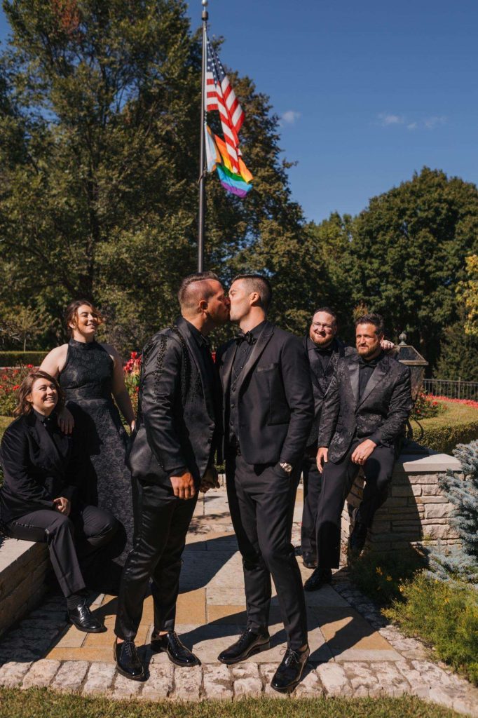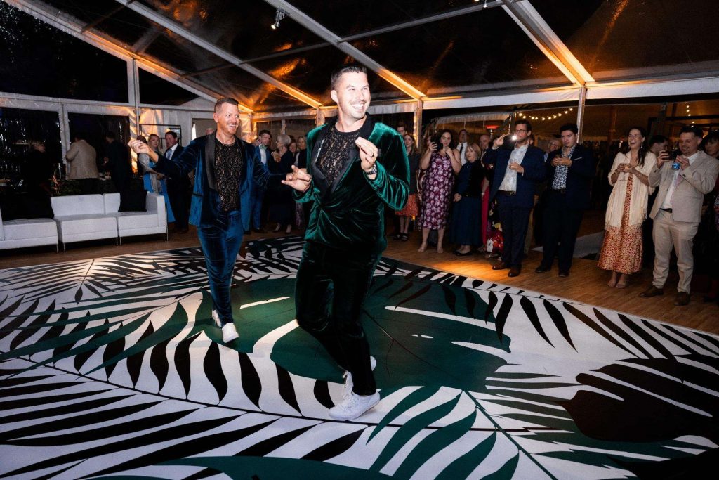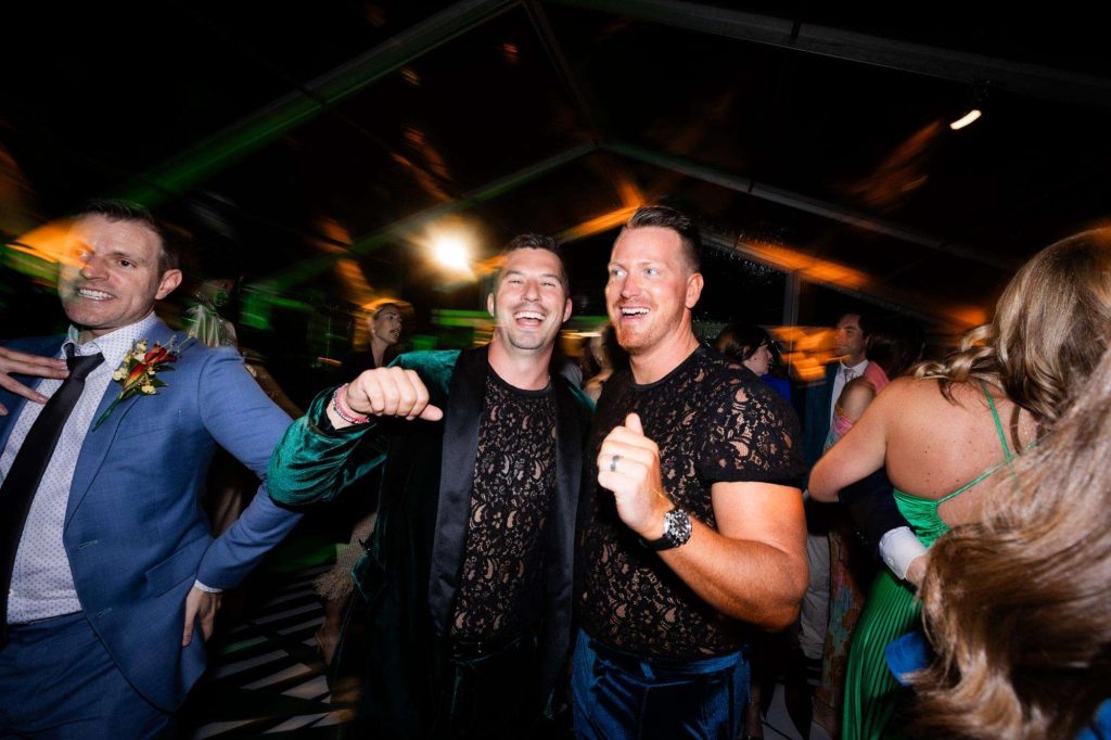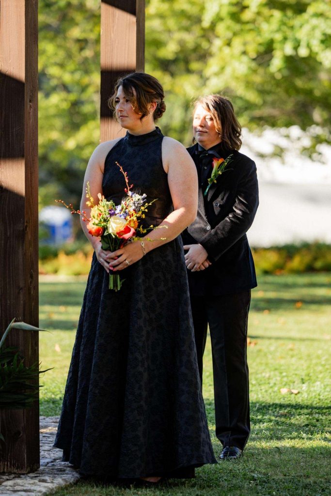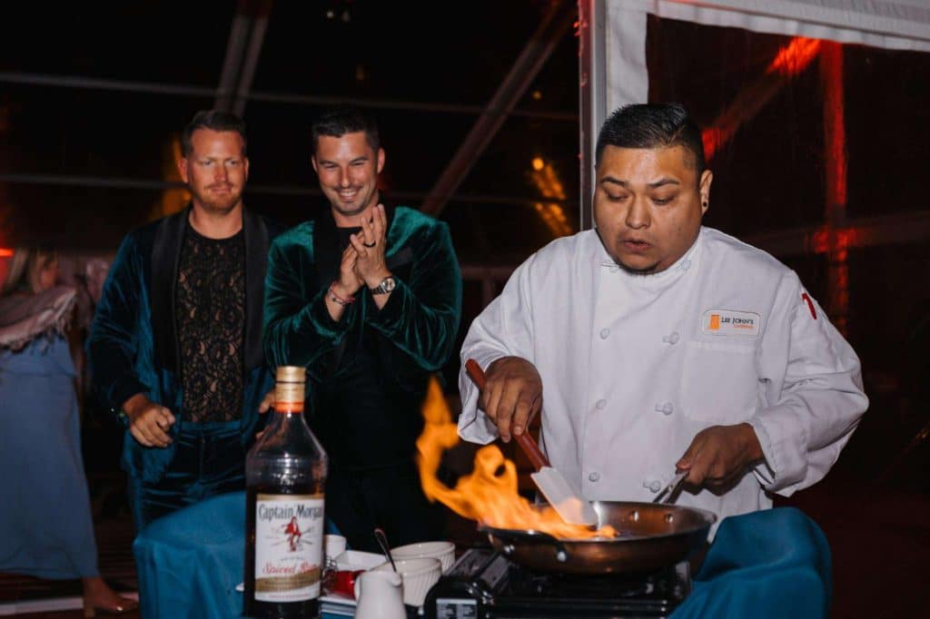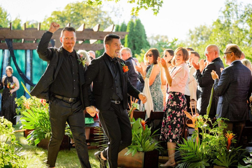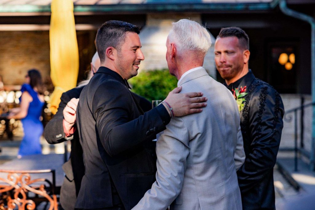 “The building of our custom tent in Andy’s Nana’s home in Wisconsin – We live in San Diego! A few other favorites included; the Ombre Rainbow friends table, outdoor ceremony under the pergola, the candles, the tropical floral and live elements and custom dance floor. WE LOVED EVERYTHING! It was the coldest day in September, but also was okay with us.”