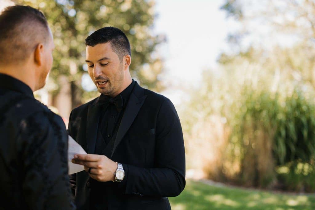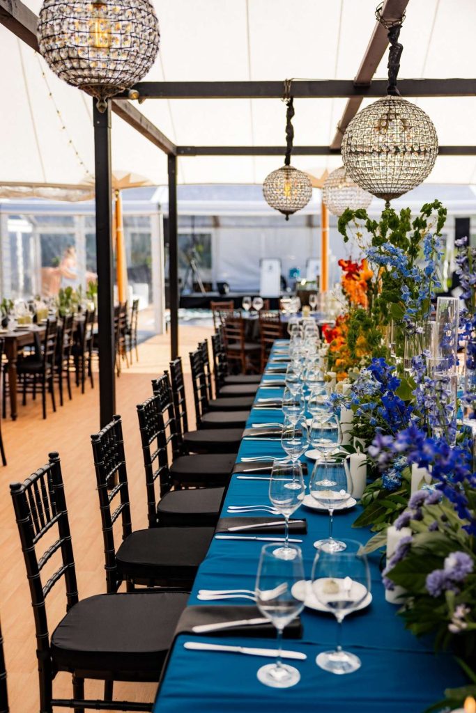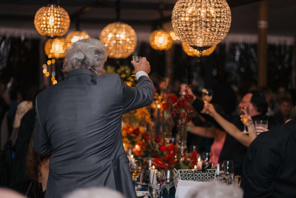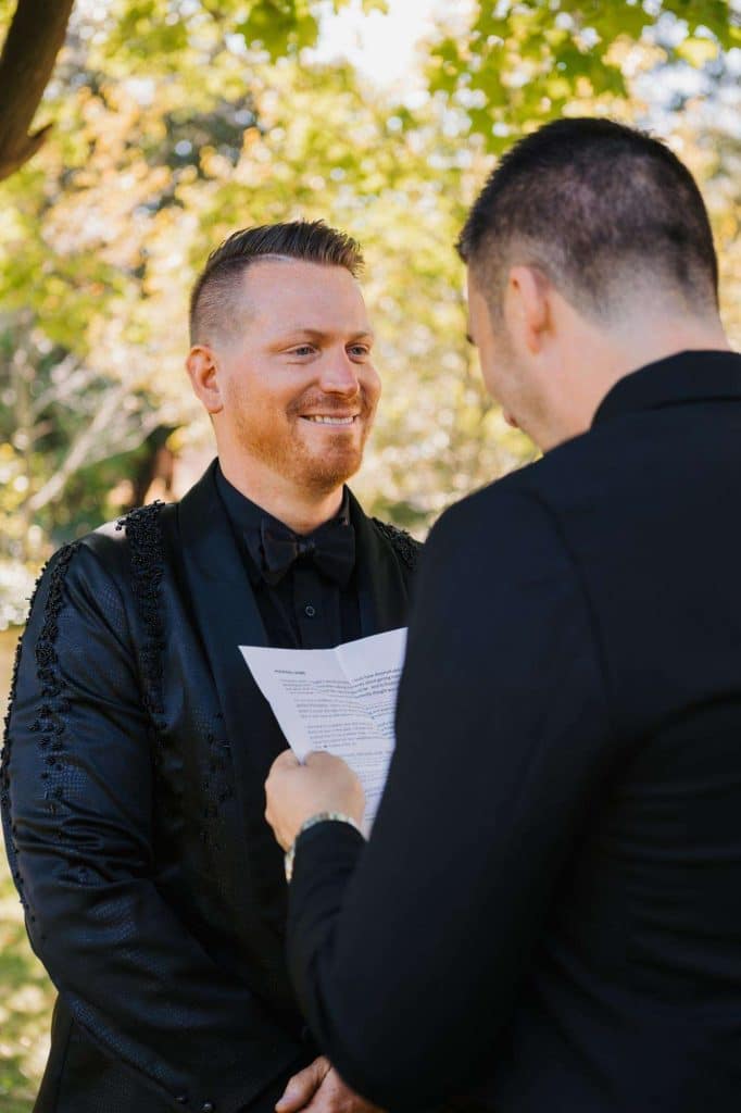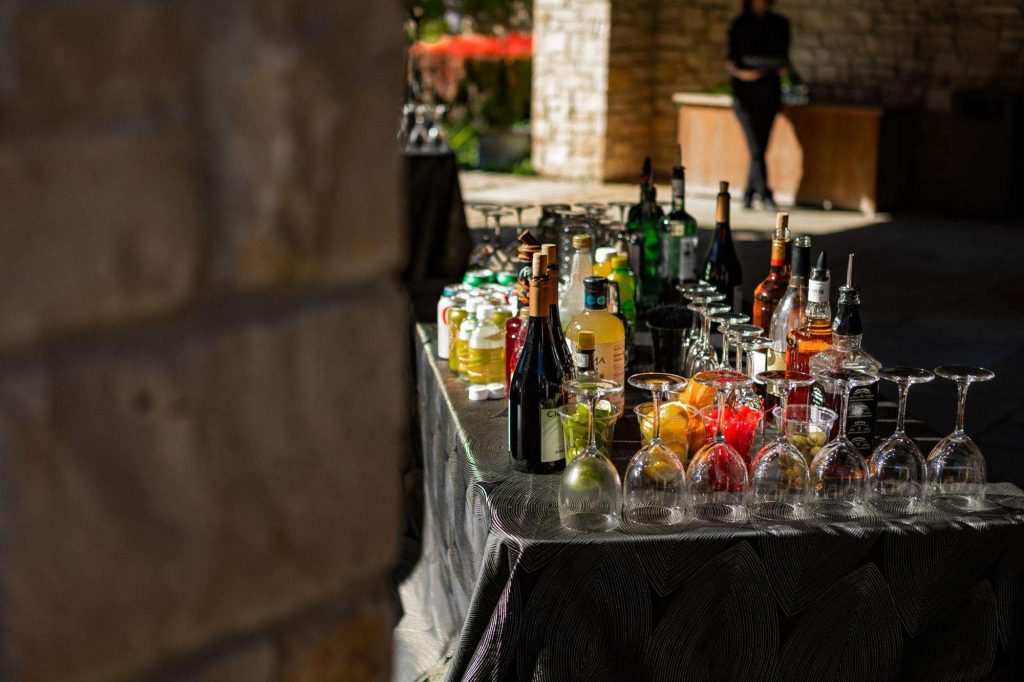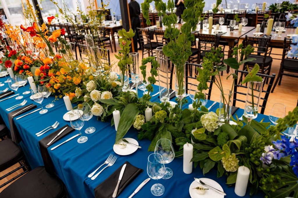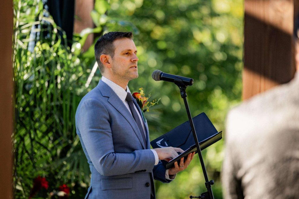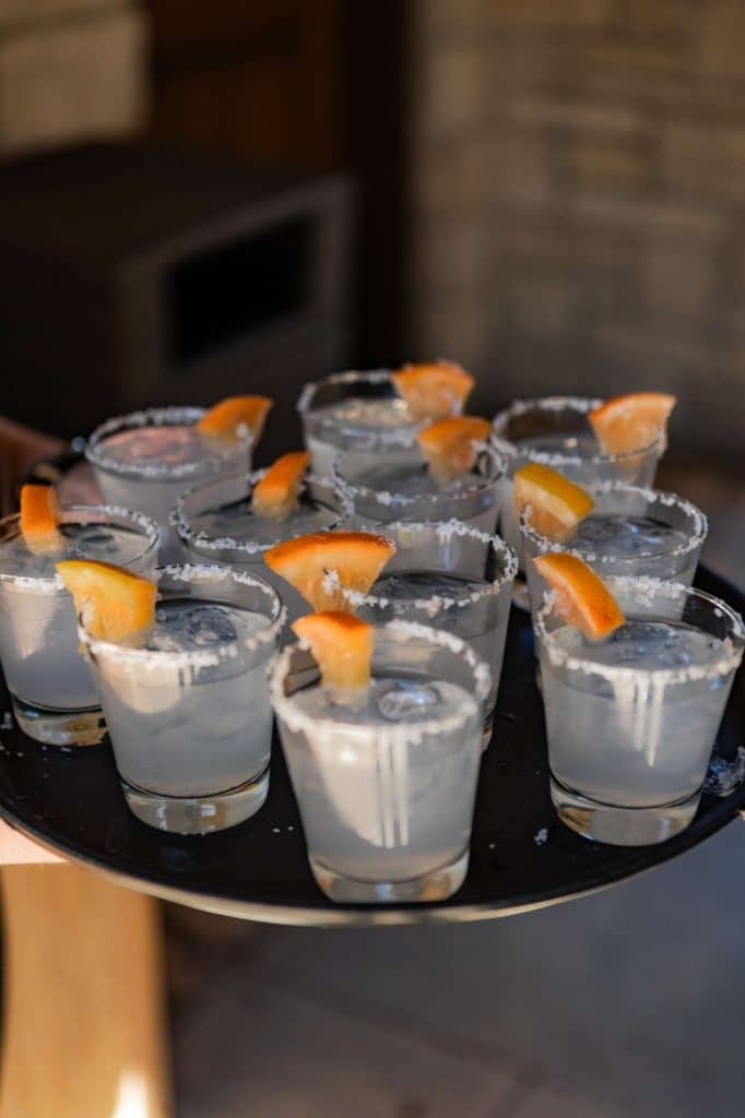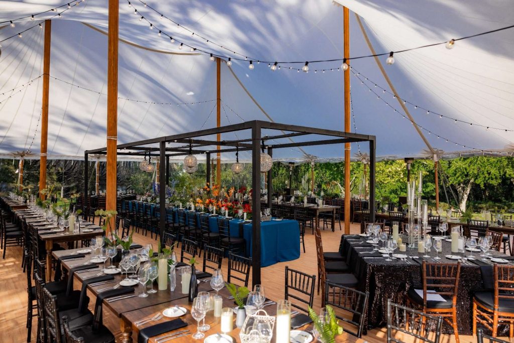 “The building of our custom tent in Andy’s Nana’s home in Wisconsin – We live in San Diego! A few other favorites included; the Ombre Rainbow friends table, outdoor ceremony under the pergola, the candles, the tropical floral and live elements and custom dance floor. WE LOVED EVERYTHING! It was the coldest day in September, but also was okay with us.”