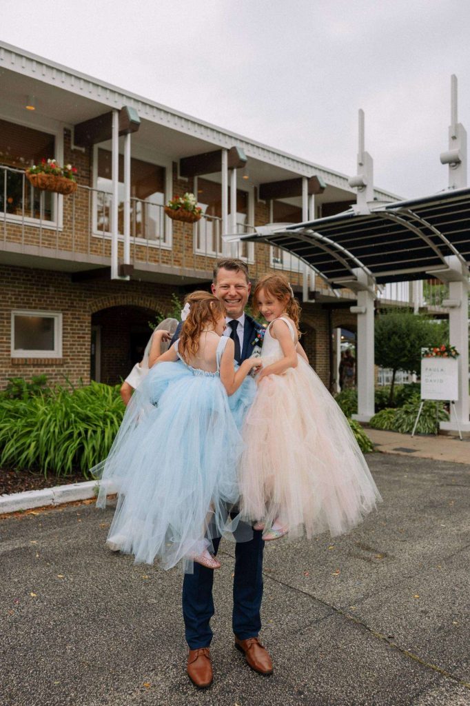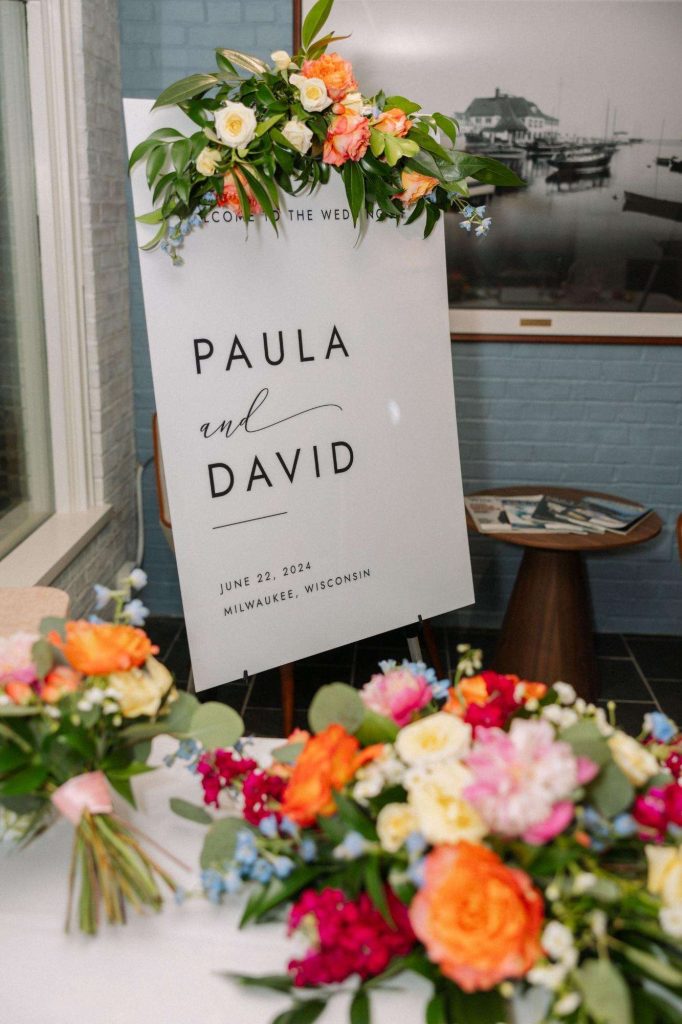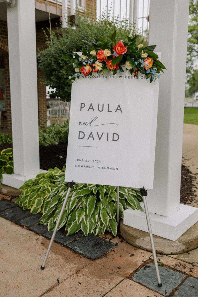 The signature drink was a French 75, and all the food was catered from the Milwaukee Yacht Club. The menu consisted of roasted beef tenderloin, roasted free range chicken breast, pan seared Scottish salmon and wild mushroom ravioli. Dessert was also from the Milwaukee Yacht Club; including an ice cream bar with all the fixings, an assortment of cookies and flourless chocolate cake. Late night snacks were also provided with a taco and nacho bar. David and Paula then shared a tuxedo cake in their hotel room to kick off their honeymoon.