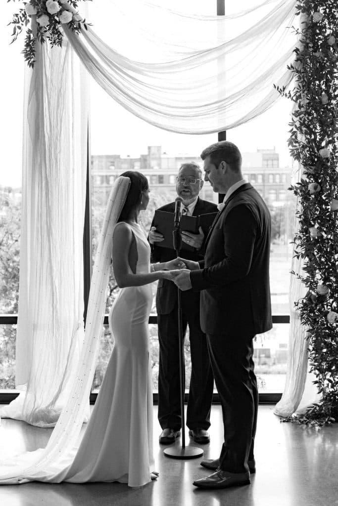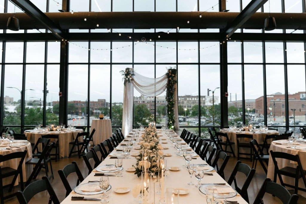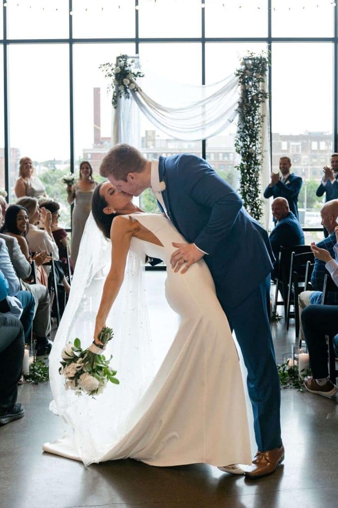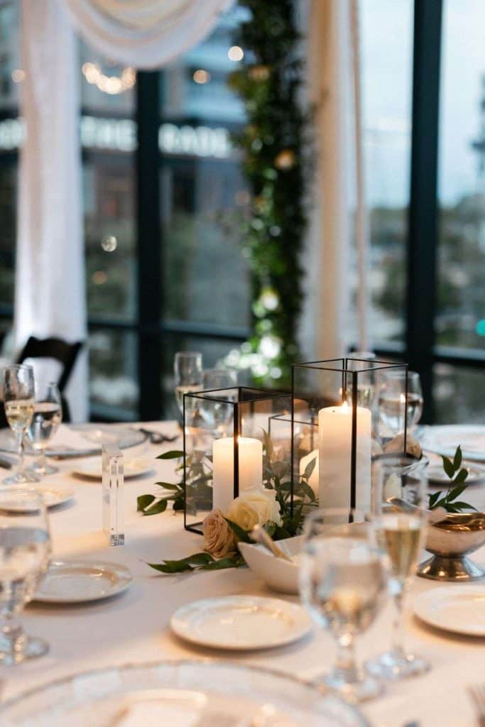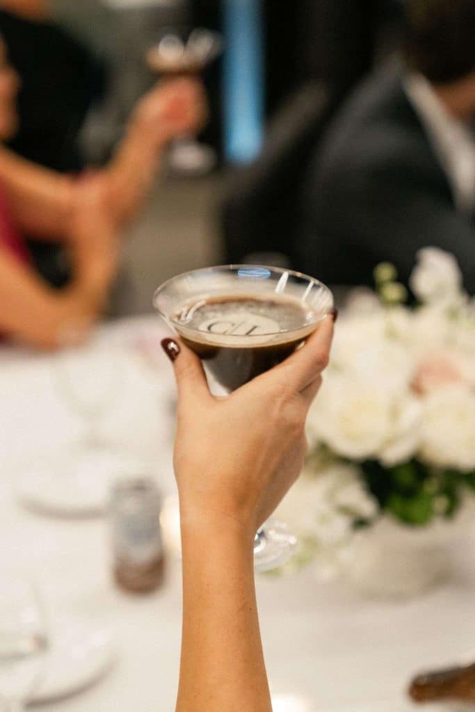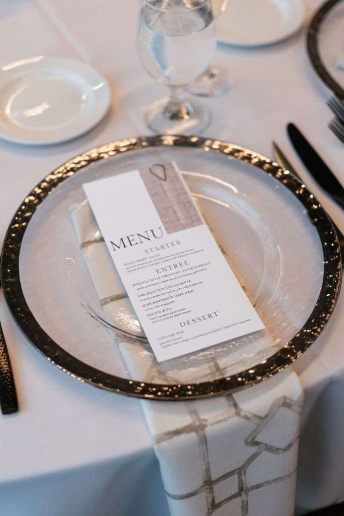 “Our kings table was a must have! We had been looking forward to feeling like we were at a large dinner party with friends and family throughout the process. The low and lush floral garland with taper candles on our kings table made the night a dream. We also incorporated small details such as signature cocktails, edible drink toppers, patterned linens, chargers and black flatware from Well Dressed Tables (Arena Americas).”