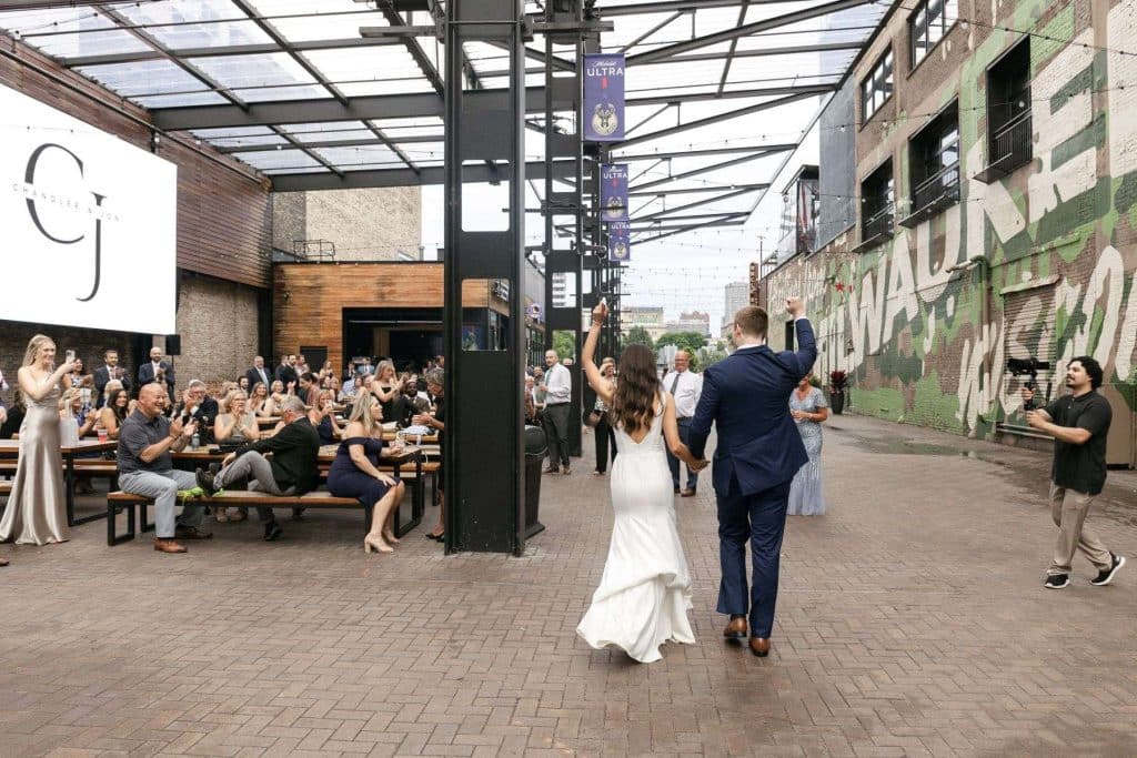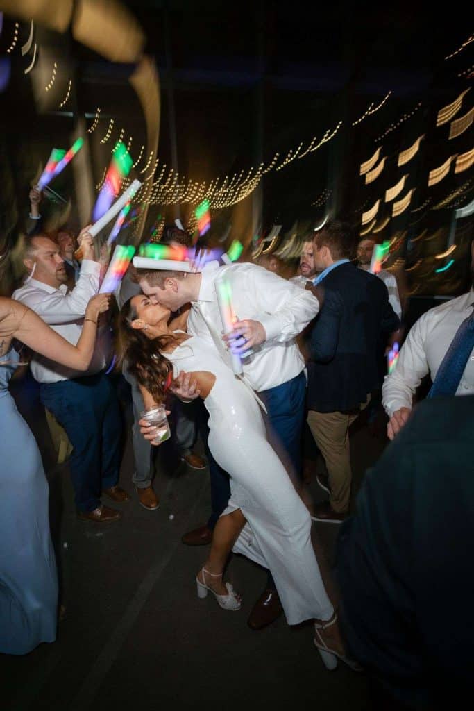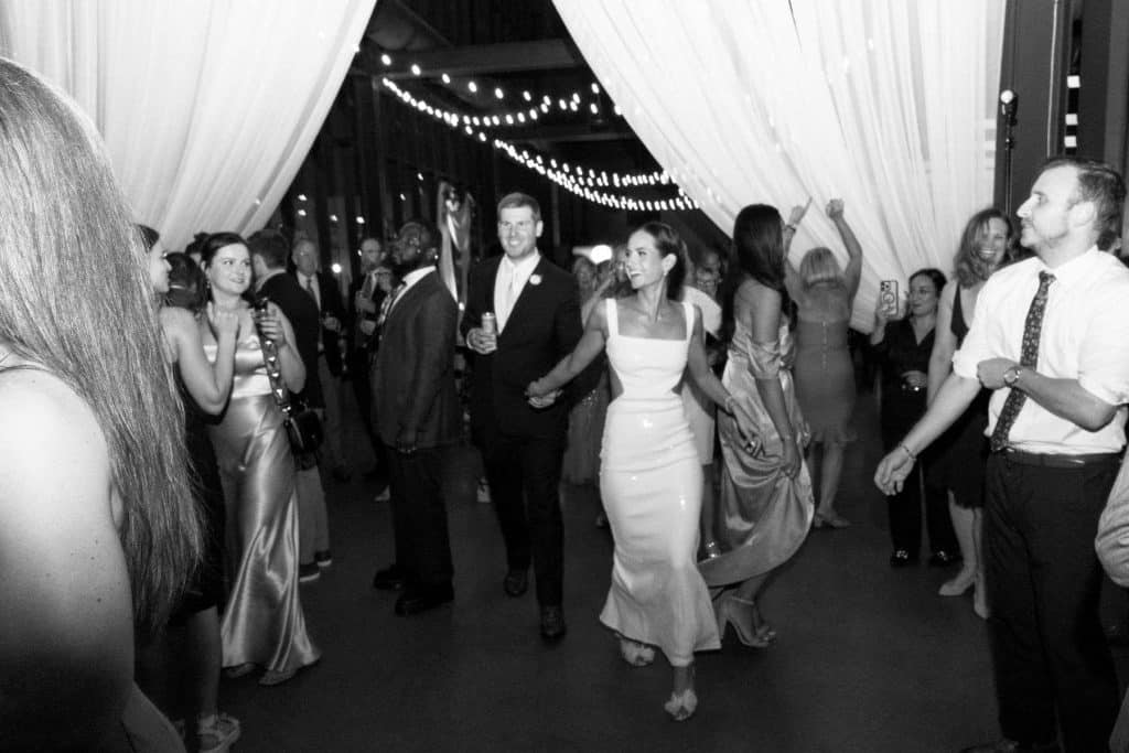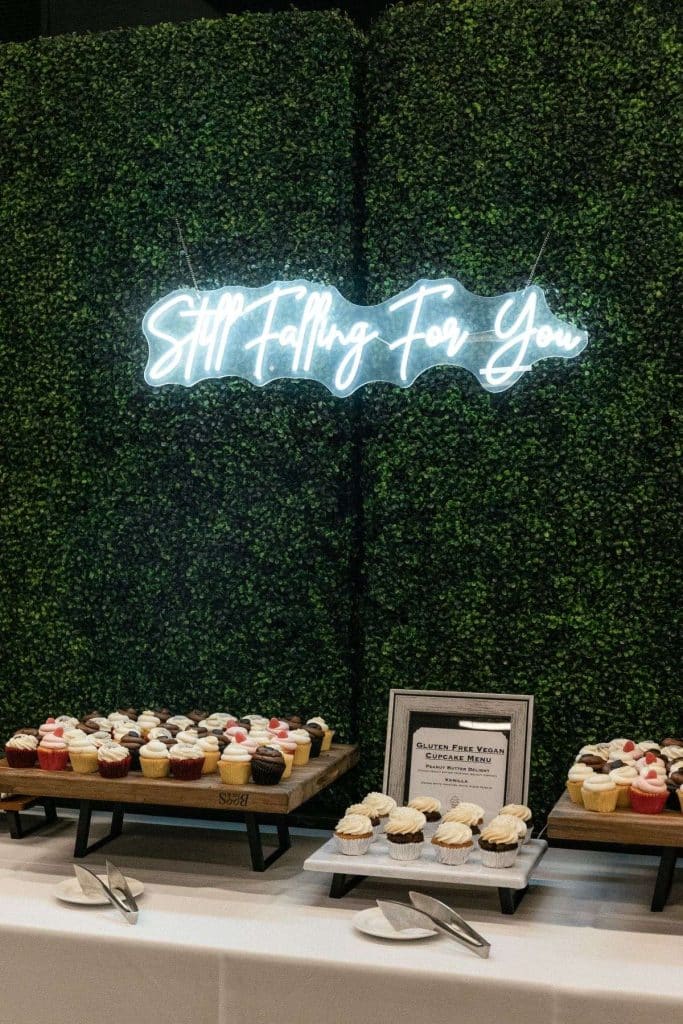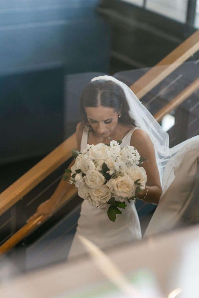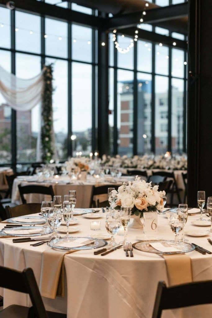 “Our kings table was a must have! We had been looking forward to feeling like we were at a large dinner party with friends and family throughout the process. The low and lush floral garland with taper candles on our kings table made the night a dream. We also incorporated small details such as signature cocktails, edible drink toppers, patterned linens, chargers and black flatware from Well Dressed Tables (Arena Americas).”