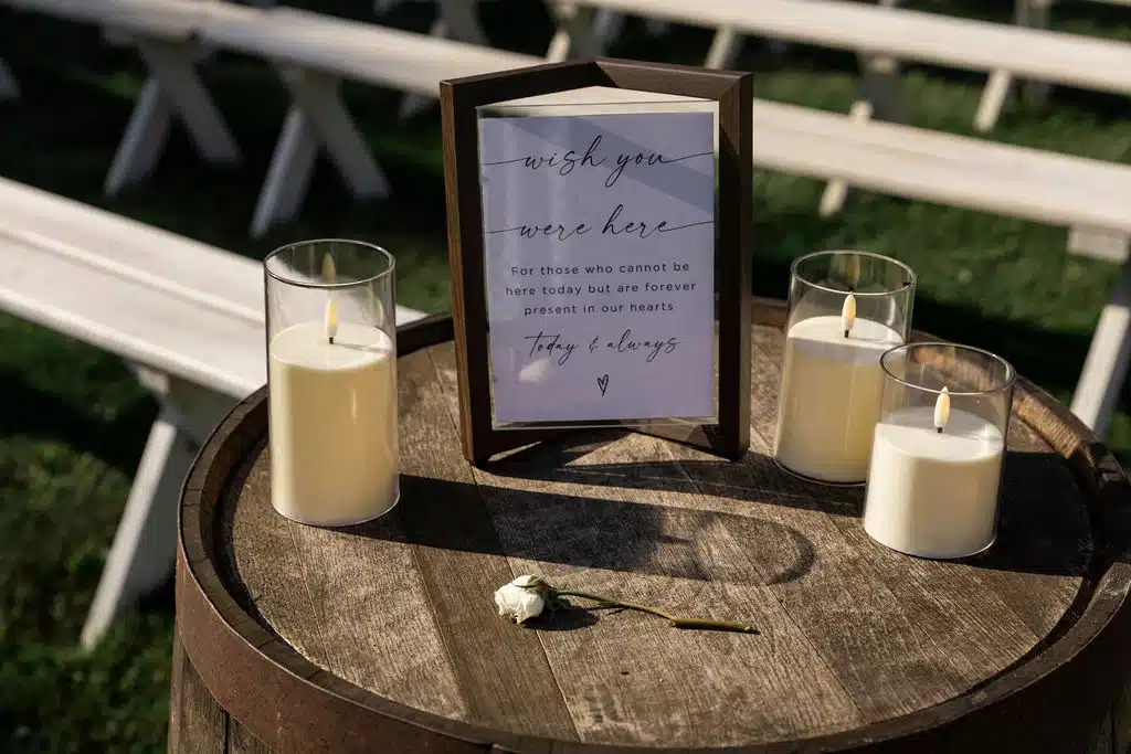 “We had white draping and hand crafted flower arrangements made by my grandmother decorating our altar. Candlelit lanterns guided the way down the aisle. There were two whiskey barrels on each side of the aisle, one with an “In Memory” sign with a candle burning.”