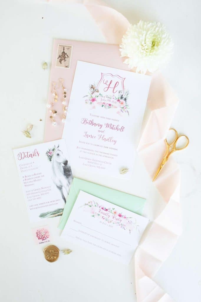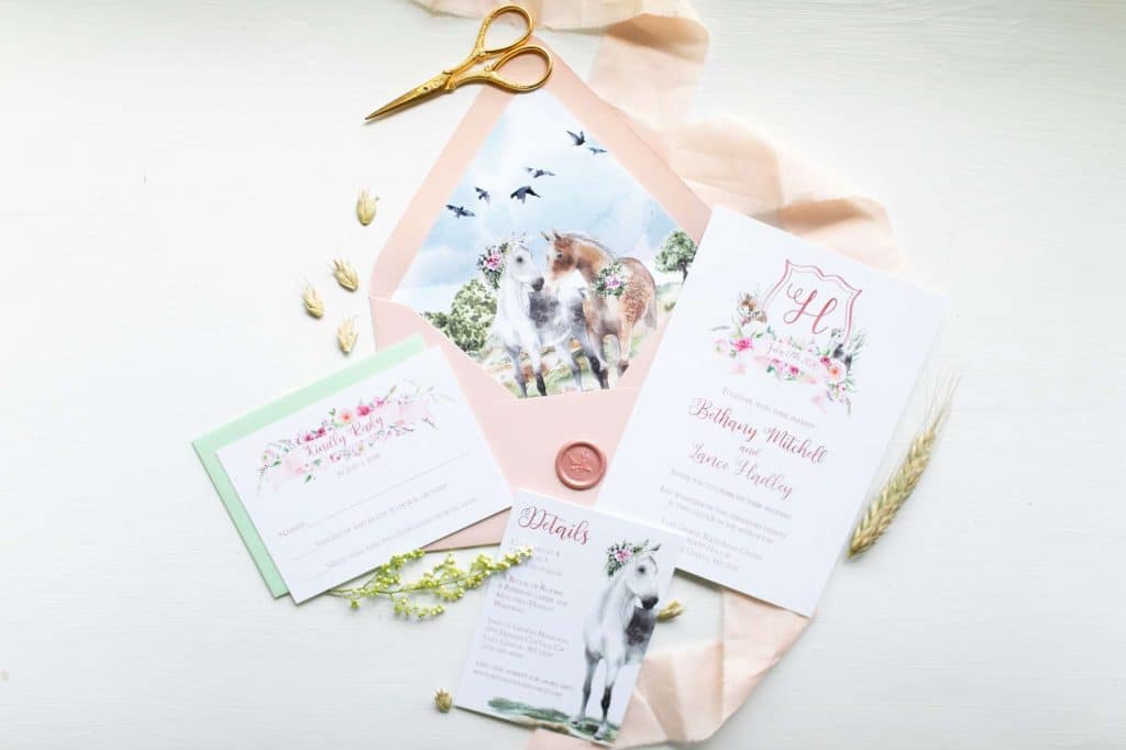 Elyse contacted me to do a styled shoot with horses so I knew I wanted to incorporate them into my design. The only parameters she gave me were the hue of blushes, so I just went off of that. I’ve always wanted to do a crest for a design, so I thought what better opportunity to do some florals and horses for the crest. I chose flowers that were in season that would likely be used for the time of year, and I paired it with some watercolor horses. I opted for a whimsical font, and kept that loose artistic feel you get with watercolor by overlaying a watercolor wash over the text.- DCo Lovenotes