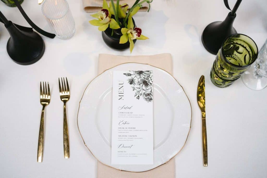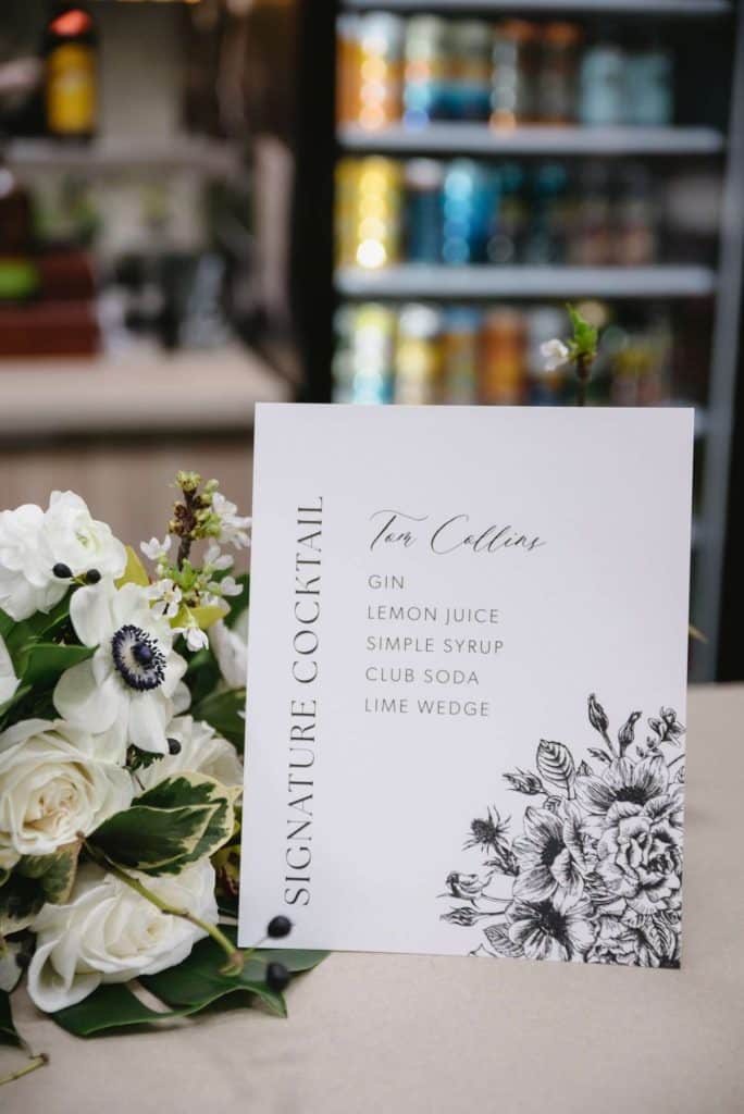 From sleek black chairs to elegant white and gold dinnerware, every detail was thoughtfully chosen to complement the lush greenery that filled the space. Modern geometric shapes mingled with natural botanicals, creating a visually striking aesthetic that captured the essence of contemporary romance. Flowers for Dreams crafted floral arrangements that brought life and vibrancy to every corner of the venue. Paperwhites Milwaukee provided exquisite invites, signage and menus, enhancing the modern elegance of the decor scheme.