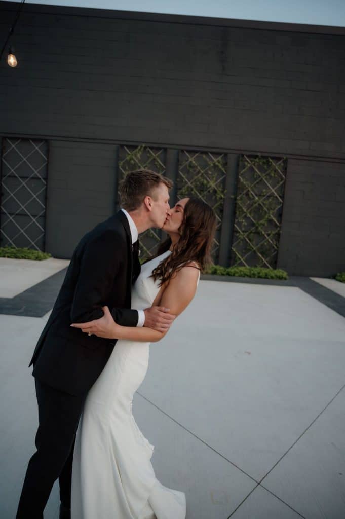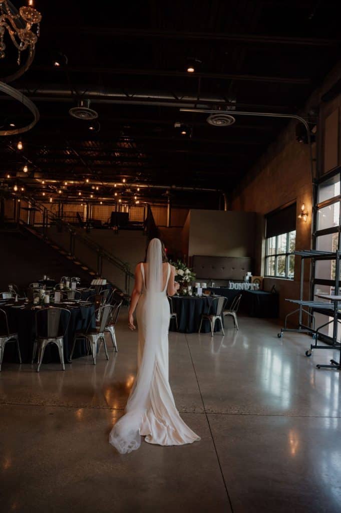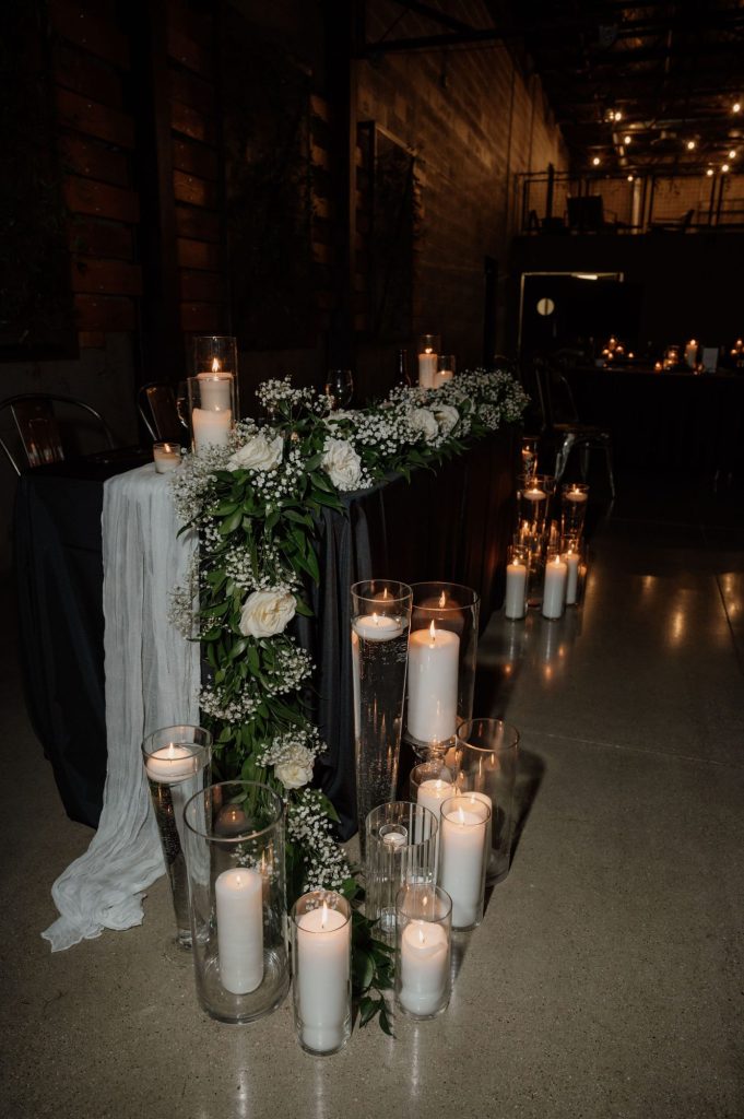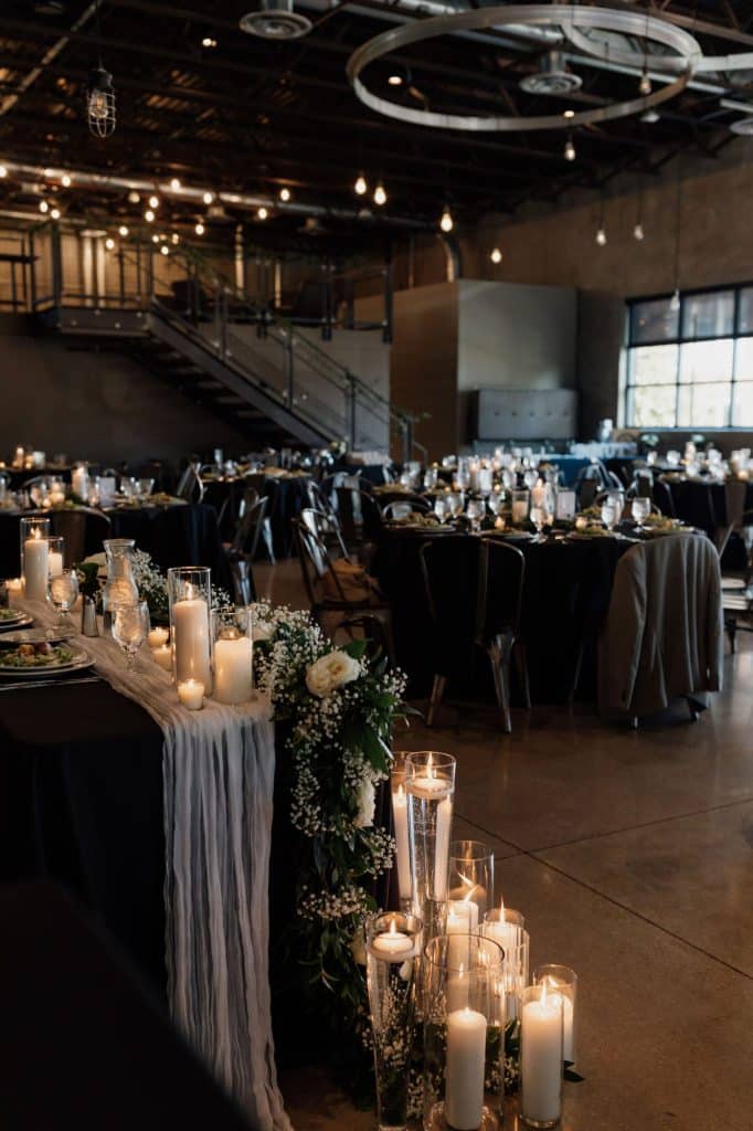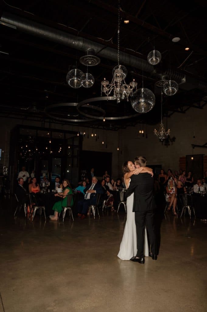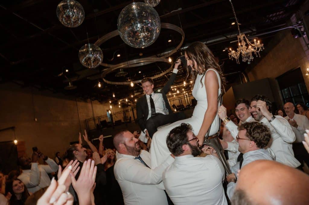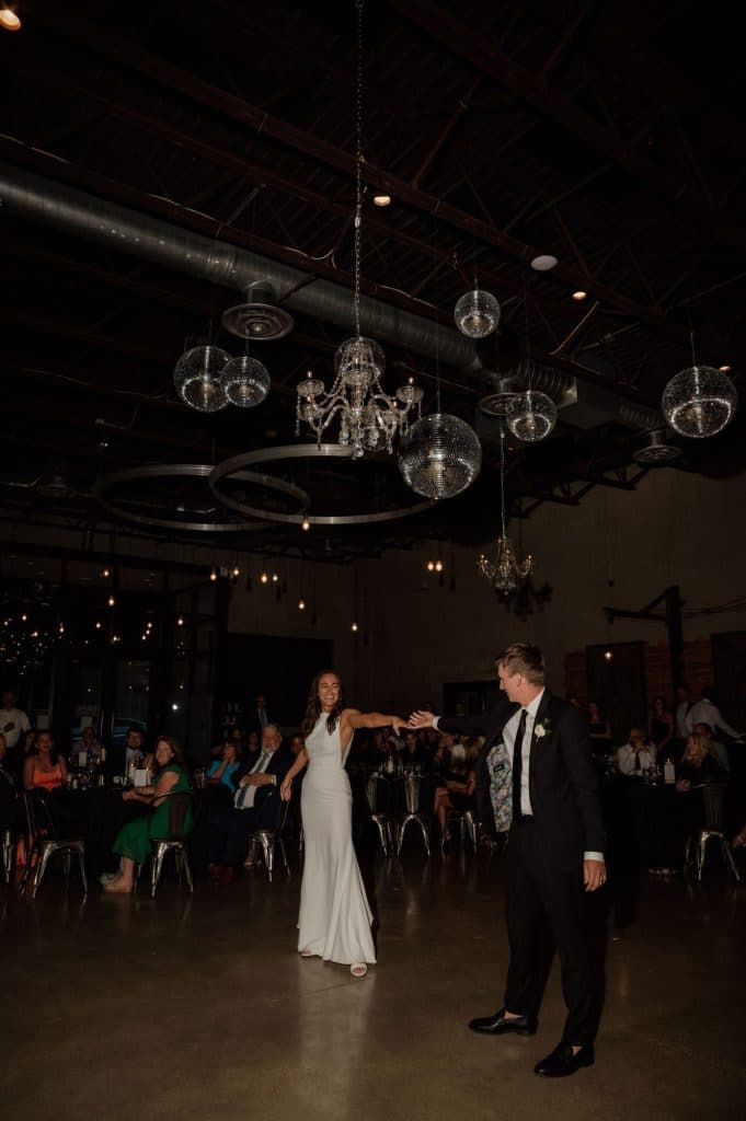 Lindsay and Sullivan planned their wedding with the idea of being modern and timeless. Their favorite parts incorporated disco ball and chandeliers hanging from the ceiling as well as greenery and candles along the head table.