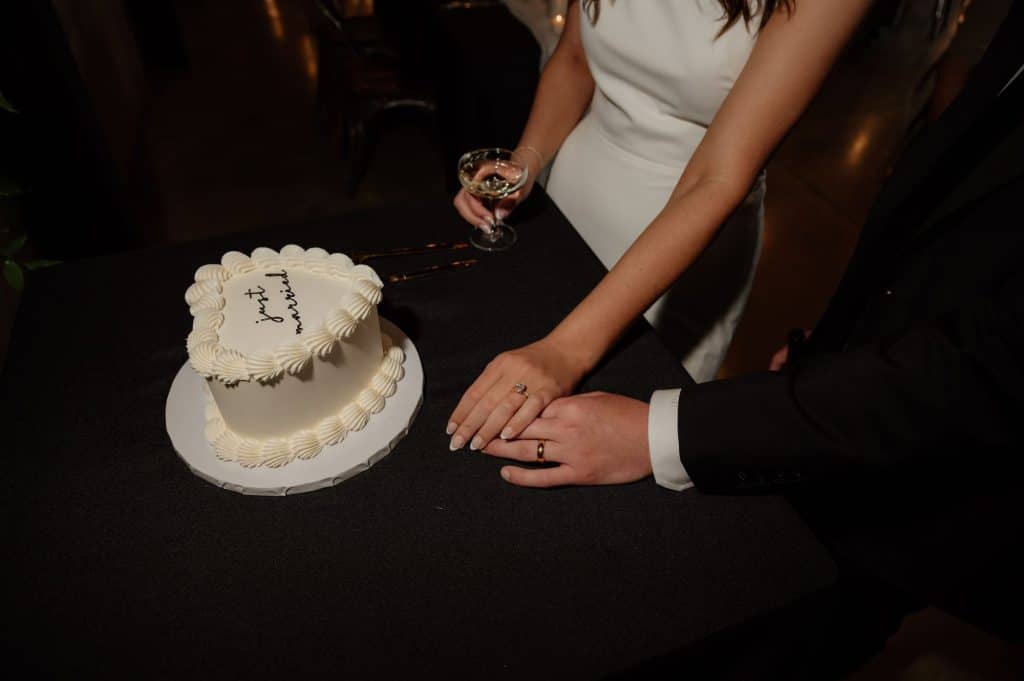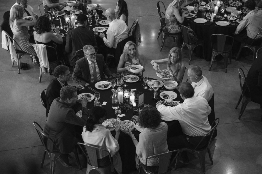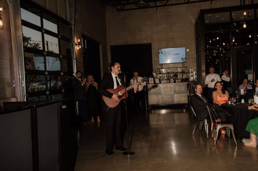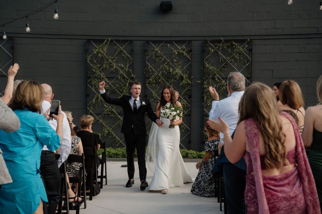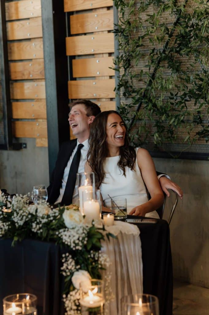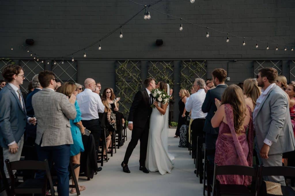 Lindsay and Sullivan planned their wedding with the idea of being modern and timeless. Their favorite parts incorporated disco ball and chandeliers hanging from the ceiling as well as greenery and candles along the head table.