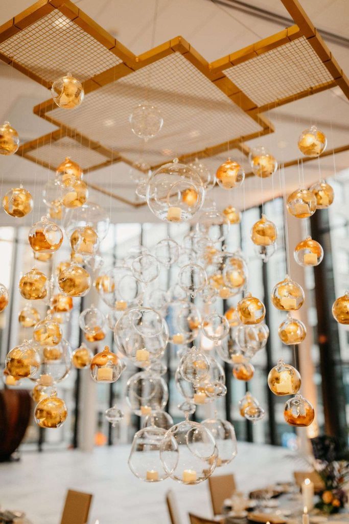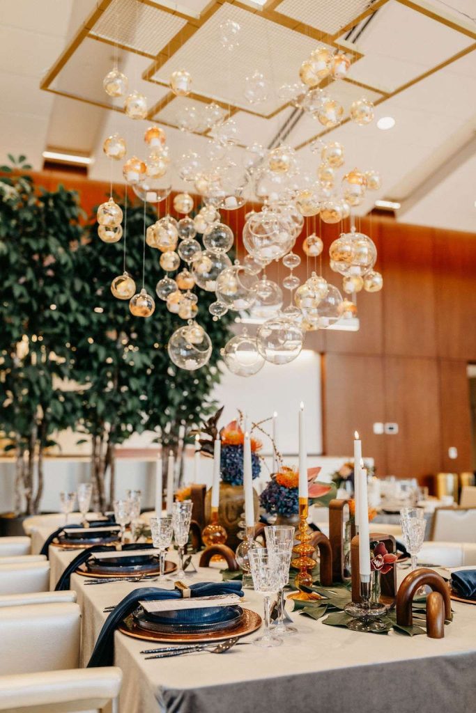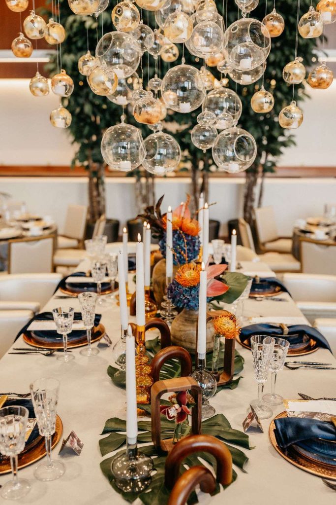 Bold statement pieces take center stage. From a custom made glass, globe chandelier with gold leaf details to wallpaper panels to accent the dance floor. Everything creates a visually striking experience for guests at every corner they look.