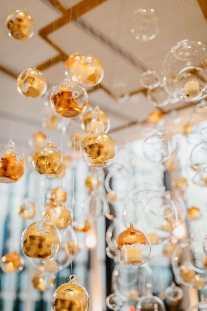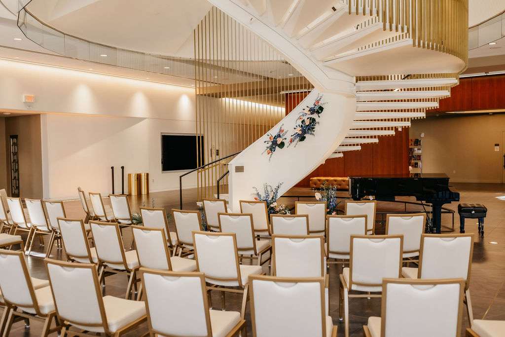 “In my opinion, successful design is all about balance, starting with the architectural foundation of the space. With the Bradley Symphony Center, we really wanted to highlight its mid-century vibe. We carefully considered sight lines, how guests would navigate the space, and where to incorporate visually striking elements, such as the custom chandelier we were able to create and suspend. It was important to layer bold details throughout the space and to collaborate with vendors whose vision aligned perfectly with our design.” shared Cori.