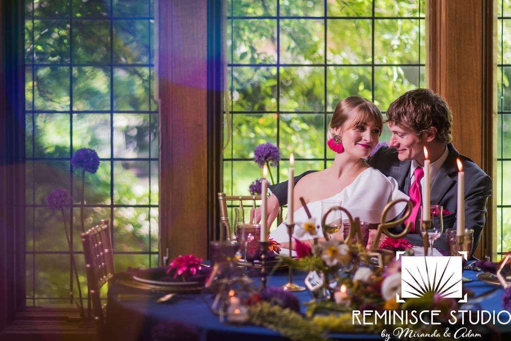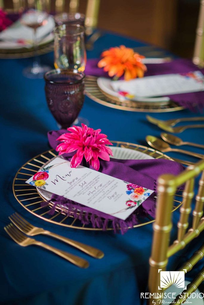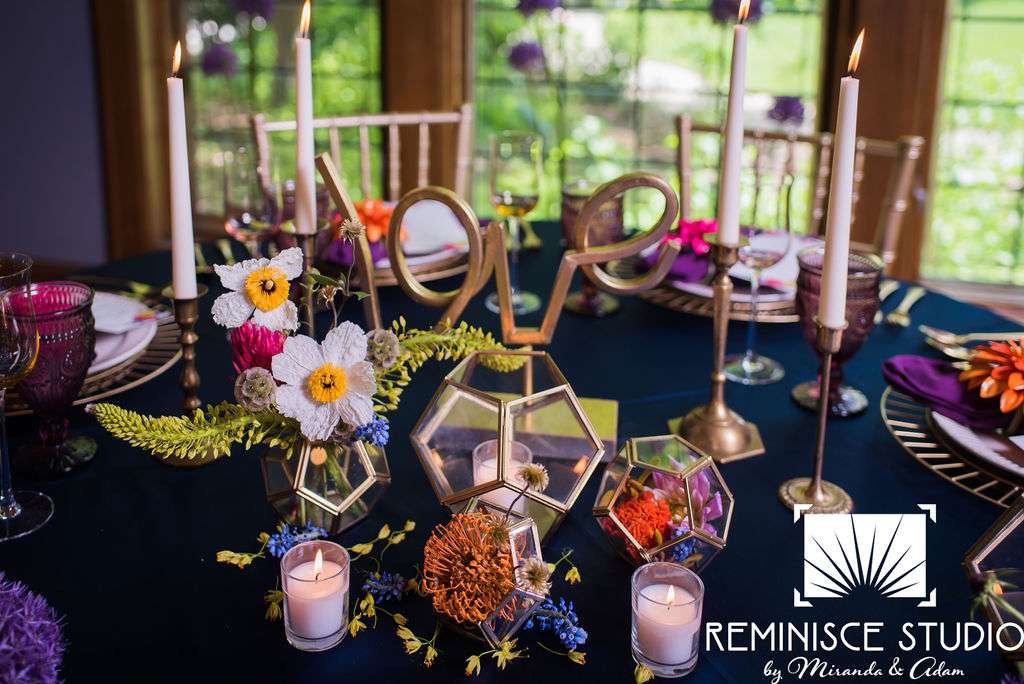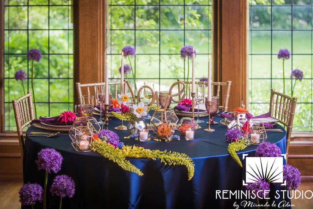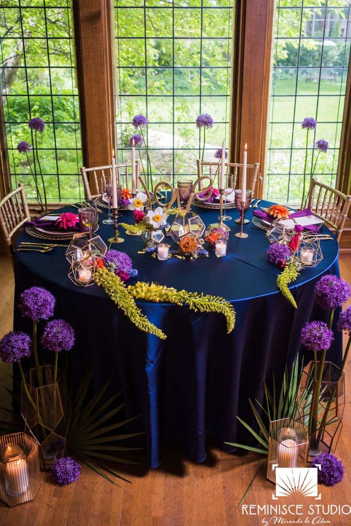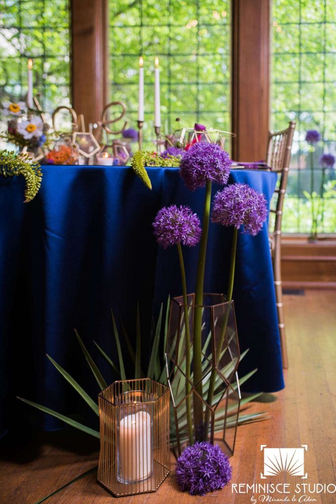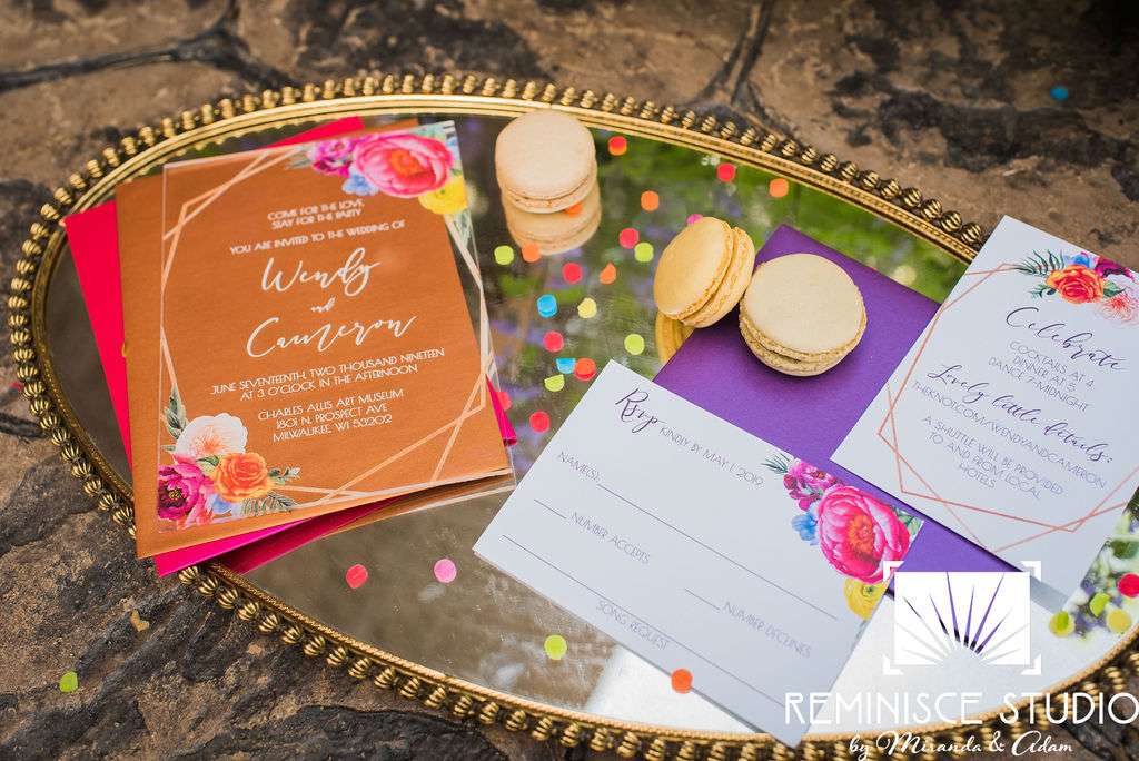 “The Charles Allis Art Museum is a beautiful historic mansion located in downtown Milwaukee, Wisconsin. I knew I wanted to take a different approach to style a wedding shoot here. When I walked through the museum for the first time, I immediately noticed the bold geometric patterns of the wood ceiling beams in the main hall. Using geometric pieces of decor would harmonize with this structural element of the building. As I explored the museum further, I discovered unique furniture and artwork in every room, all very bold in style. Marble, wood, and gold elements really stood out to me and were consistent throughout the entire museum. To make my design pop, I chose to use bold and bright colors along with gold metallics to match the decor already in the space. My overall goal was to show couples how to bring a modern, eclectic, and bright twist into this historic mansion built in 1909. No couple should feel limited to the “usual” style seen in a wedding venue. It is so important to show how they can incorporate their own unique touches into any space for their most special day!? –Kristin Reisenauer, Natural Elegance LLC