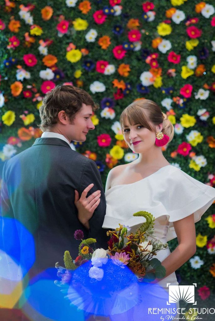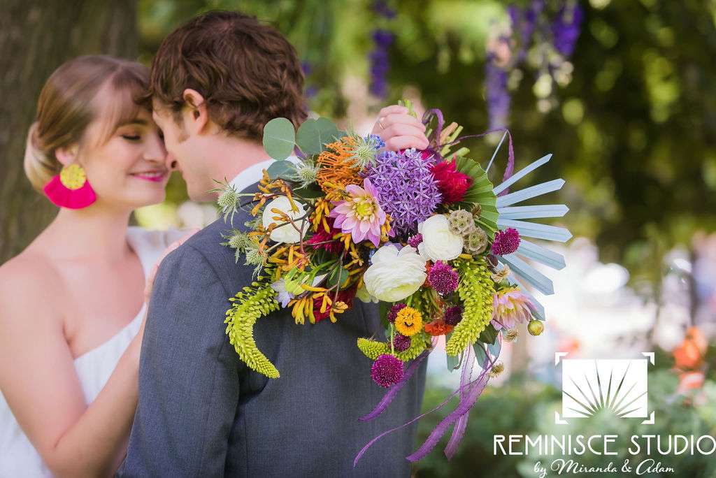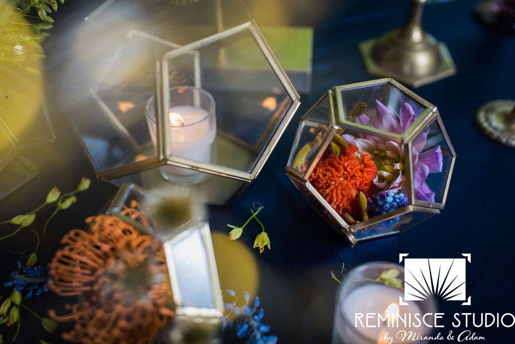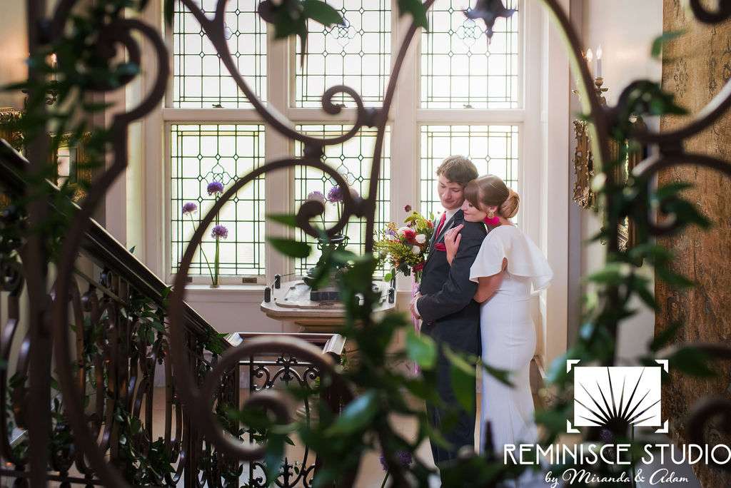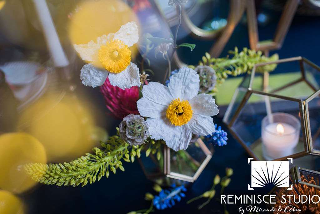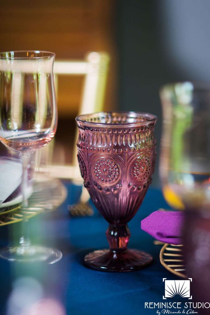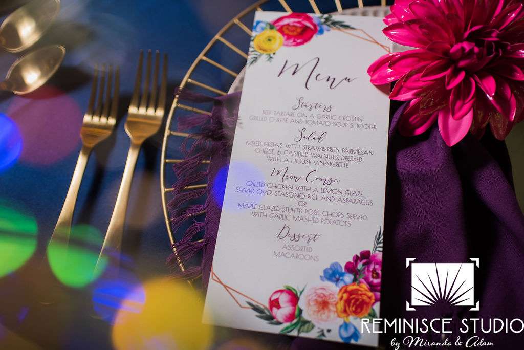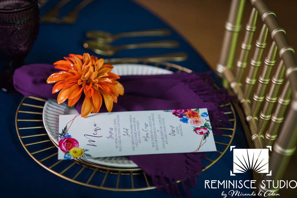 “The Charles Allis Art Museum is a beautiful historic mansion located in downtown Milwaukee, Wisconsin. I knew I wanted to take a different approach to style a wedding shoot here. When I walked through the museum for the first time, I immediately noticed the bold geometric patterns of the wood ceiling beams in the main hall. Using geometric pieces of decor would harmonize with this structural element of the building. As I explored the museum further, I discovered unique furniture and artwork in every room, all very bold in style. Marble, wood, and gold elements really stood out to me and were consistent throughout the entire museum. To make my design pop, I chose to use bold and bright colors along with gold metallics to match the decor already in the space. My overall goal was to show couples how to bring a modern, eclectic, and bright twist into this historic mansion built in 1909. No couple should feel limited to the “usual” style seen in a wedding venue. It is so important to show how they can incorporate their own unique touches into any space for their most special day!? –Kristin Reisenauer, Natural Elegance LLC