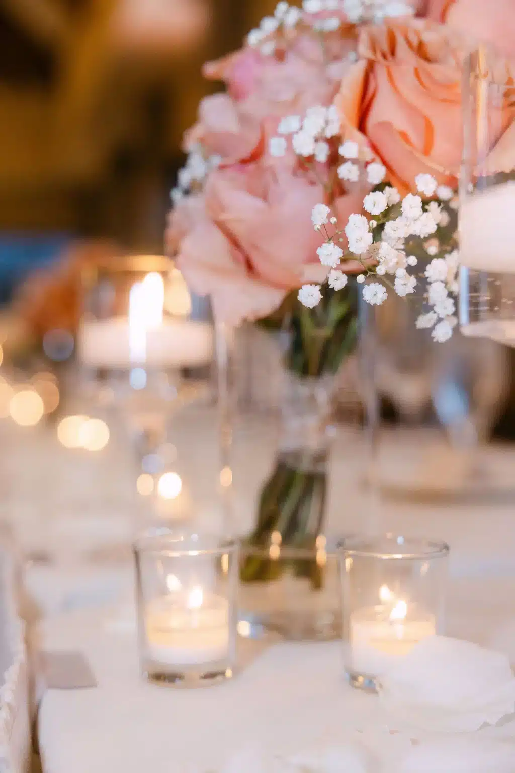 The venue itself played a huge role in shaping our vision. With its tall ceilings and elegant architecture, we felt it was important to design the space in a way that enhanced its grandeur rather than competed with it. Taller centerpieces allowed the room to feel full, romantic, and elevated, while still maintaining a classic feel.