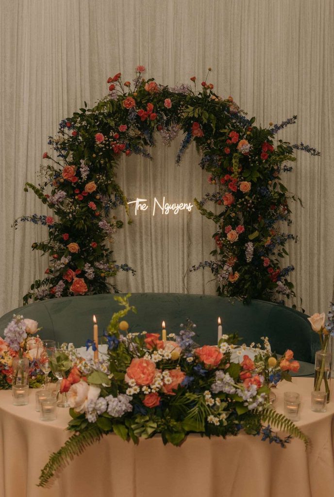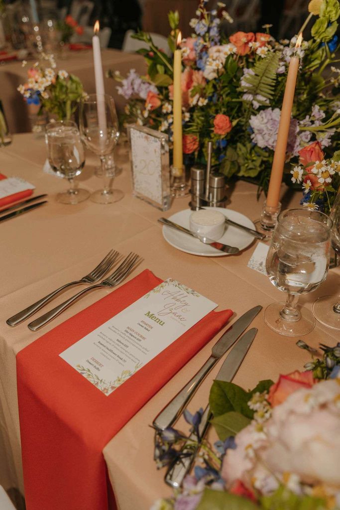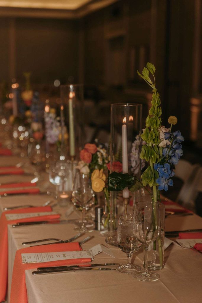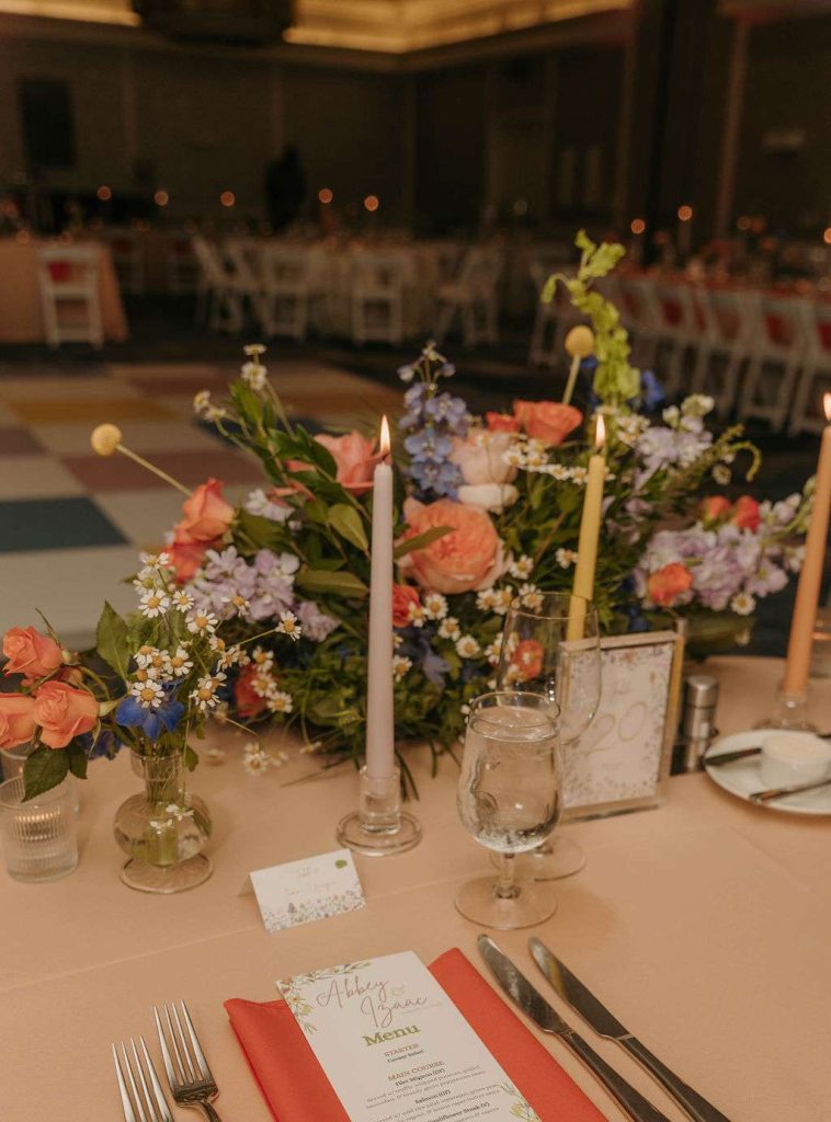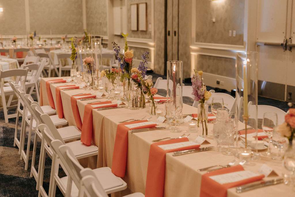 “Ambrosia Events truly brought my vision to life. We had a mix of round tables and farm tables, each styled with bulb vases, colorful taper candles, and small votive candles. Half the tables were dressed in peach tablecloths, while the others featured a vibrant green/kiwi hue. Flowers filled the room and surrounded the head table, turning the ballroom into a fantasy garden bursting with energy and color.”