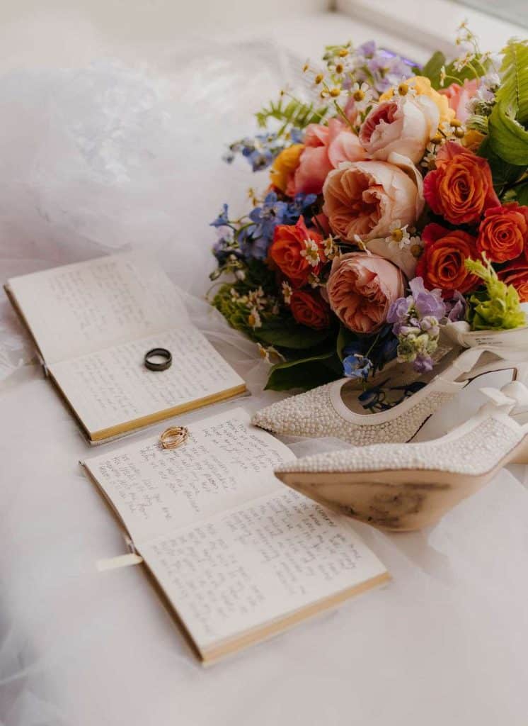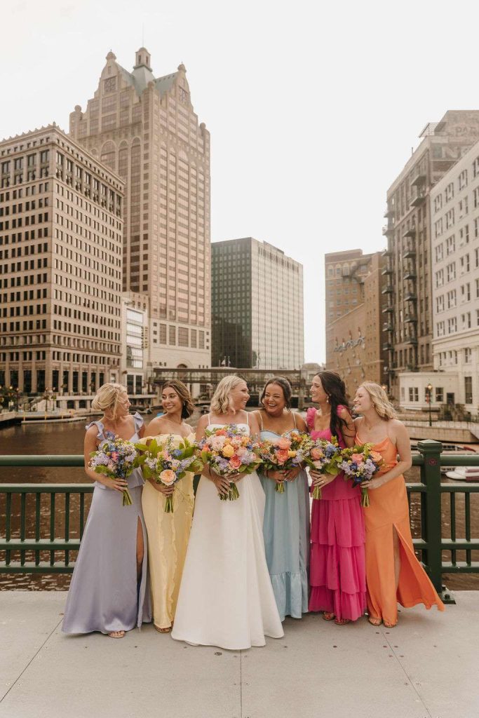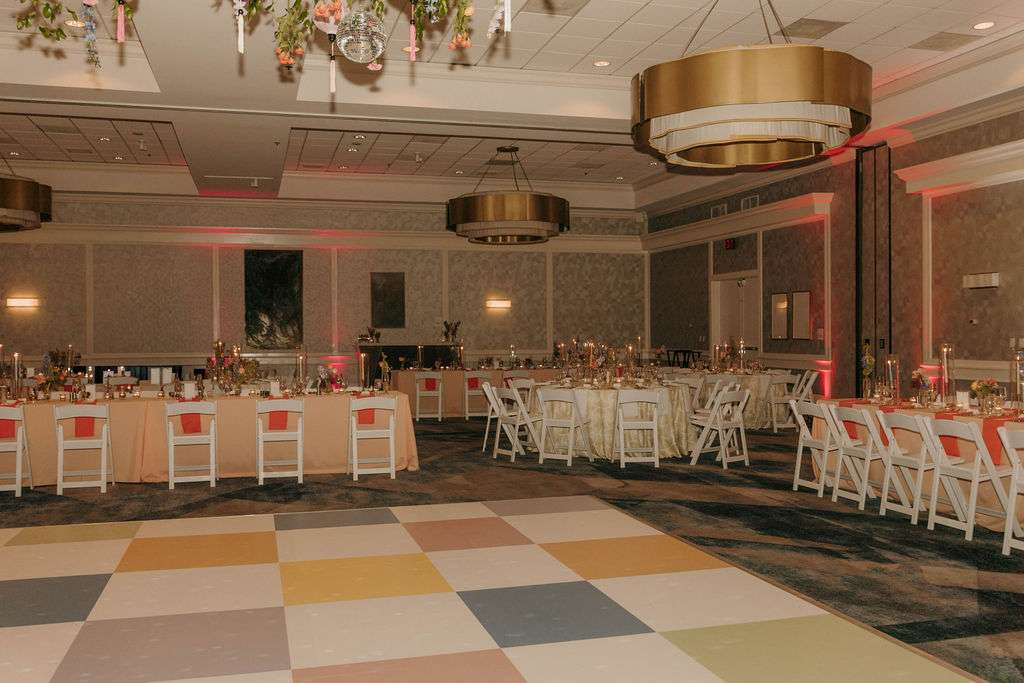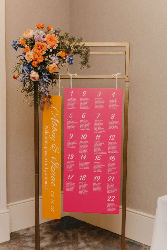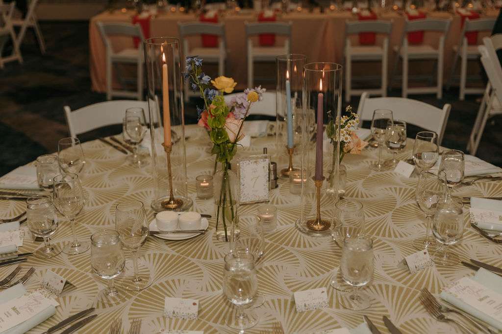 “Ambrosia Events truly brought my vision to life. We had a mix of round tables and farm tables, each styled with bulb vases, colorful taper candles, and small votive candles. Half the tables were dressed in peach tablecloths, while the others featured a vibrant green/kiwi hue. Flowers filled the room and surrounded the head table, turning the ballroom into a fantasy garden bursting with energy and color.”