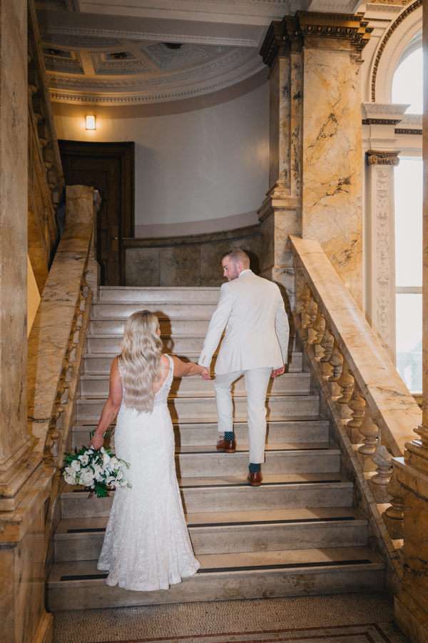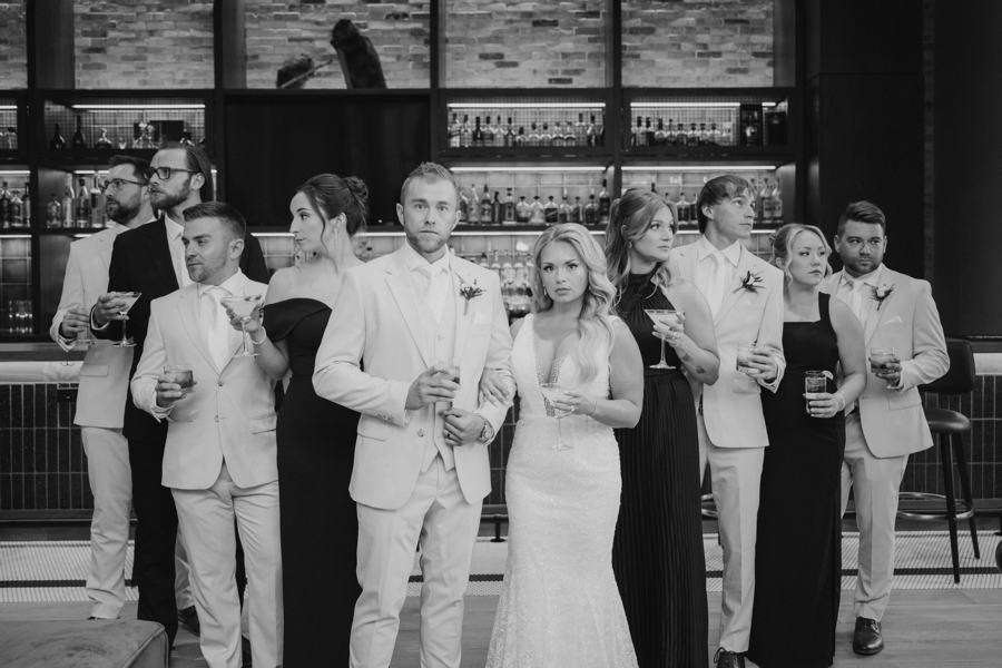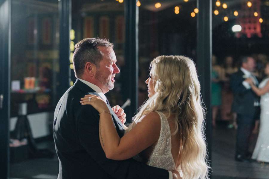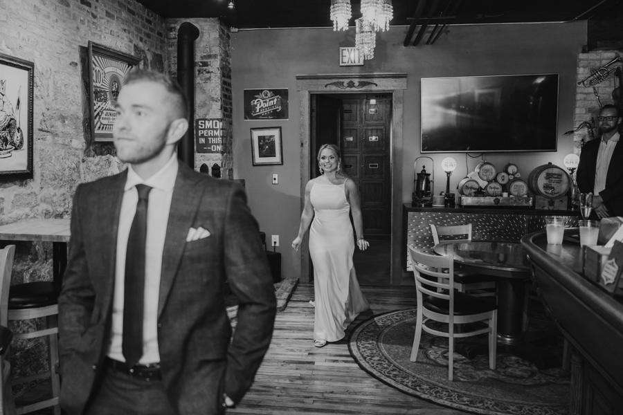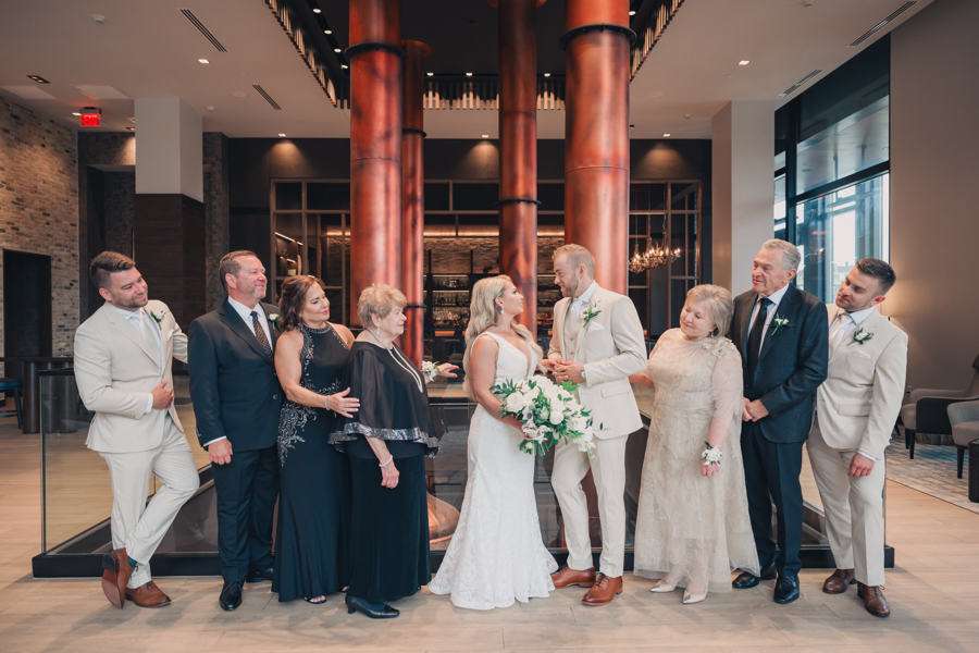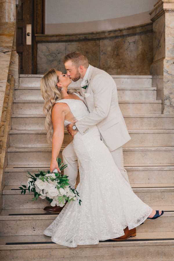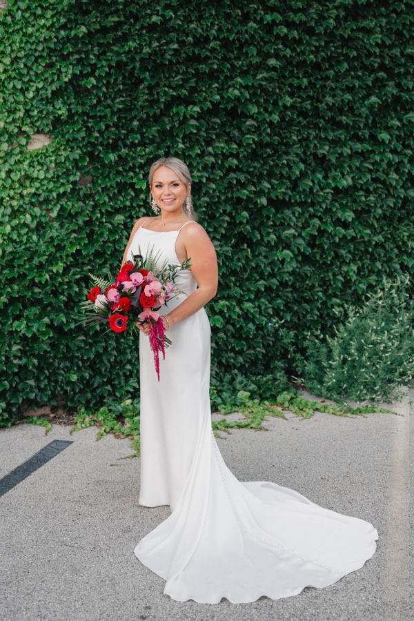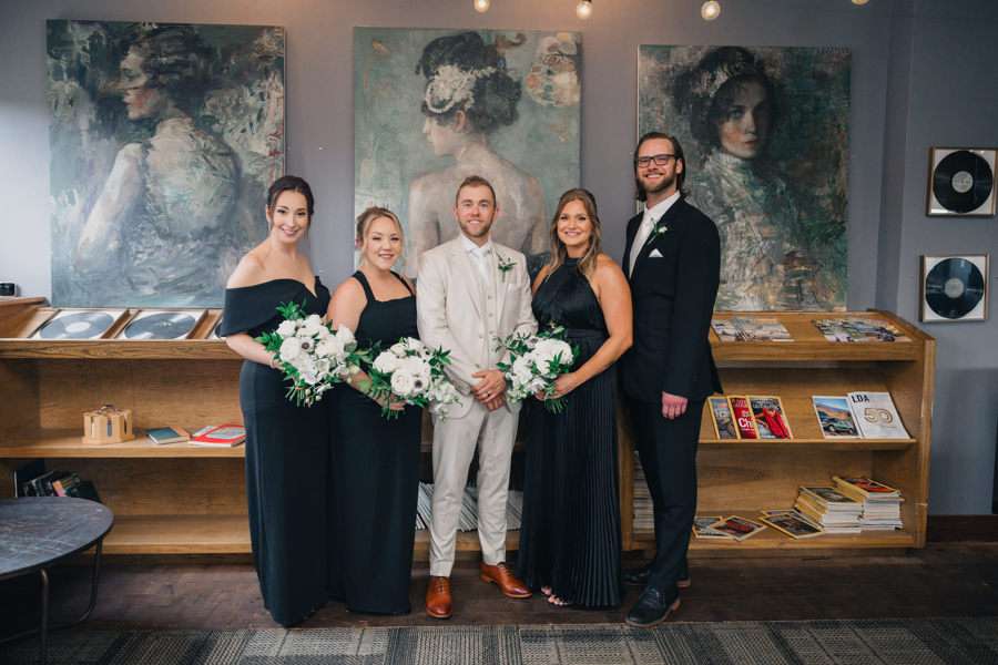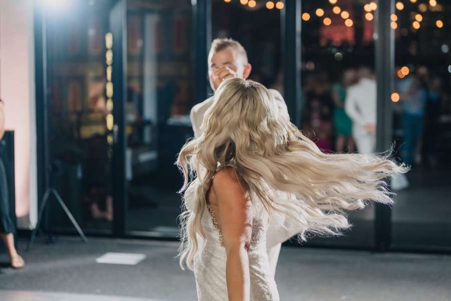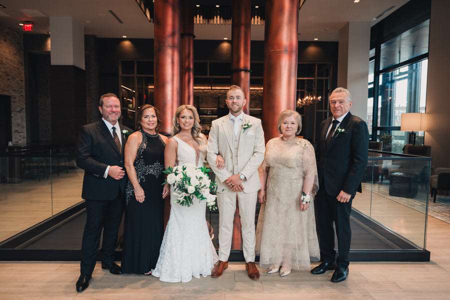“We chose our Saturday venue Vista MKE for many reasons. One of which, being a former event planner Alex had not attended an event at this gorgeous venue! That was important to Alex as there’s so many amazing venues in the city, but she wanted to feel like it was a unique experience. The venue offered an outdoor patio which was important for the couple’s vision of an outdoor dance floor and Cigar Bar. Sadly, it rained a majority of the evening but guests were able to step outside at times to enjoy the city skyline. The venue offered two completely different looks as well – one floor the classic historic Cream City Brick while the other floor a more modern look. This ironically fit the apartment styles Dan and Alex had while living in Milwaukee and they felt it was a perfect nod to their story together. The venue was in great proximity to hotels and activities for guests while they were in town as well which was important to us.”