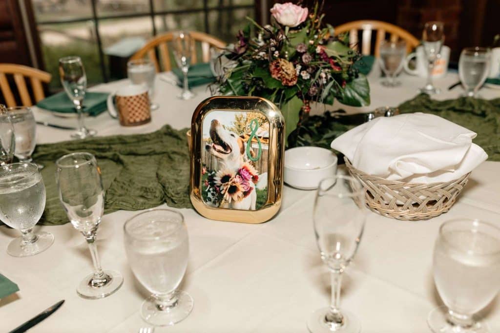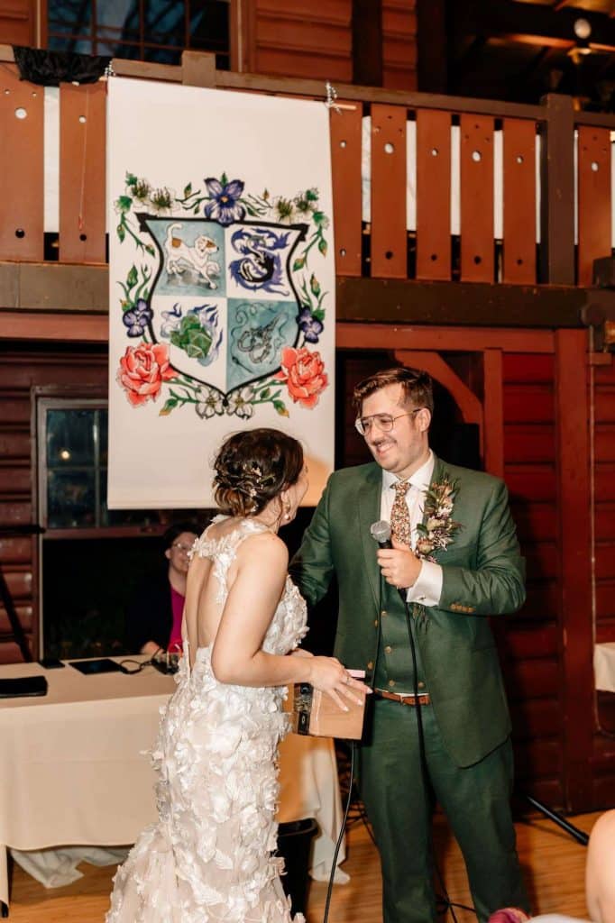 For the reception it was all about creating a romantic vibe. They were lucky enough to have some very talented friends to help their vision come to life. One of their friends helped them design a family crest representing their love story. The crest featured each state they lived in, David’s favorite hobby of Dungeons and Dragons, and needles and scissors to represent Molly as a seamstress and florist. Last but not least, they of course had to include their dog, Brekkie.