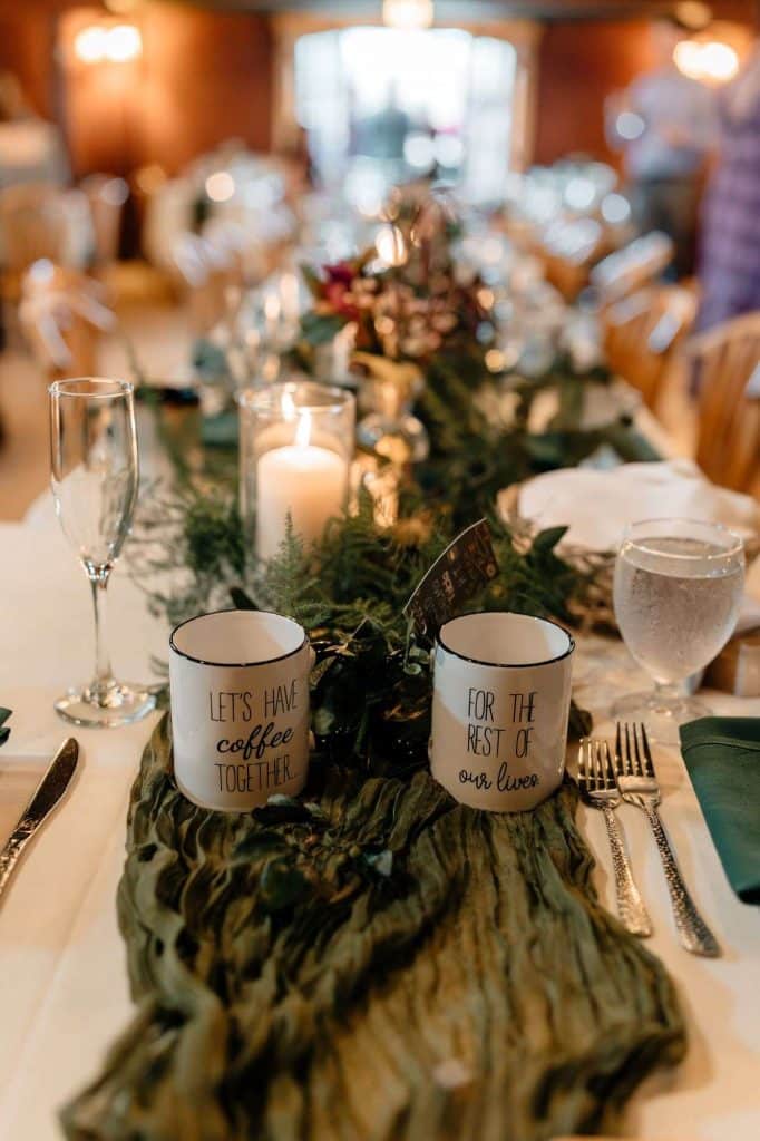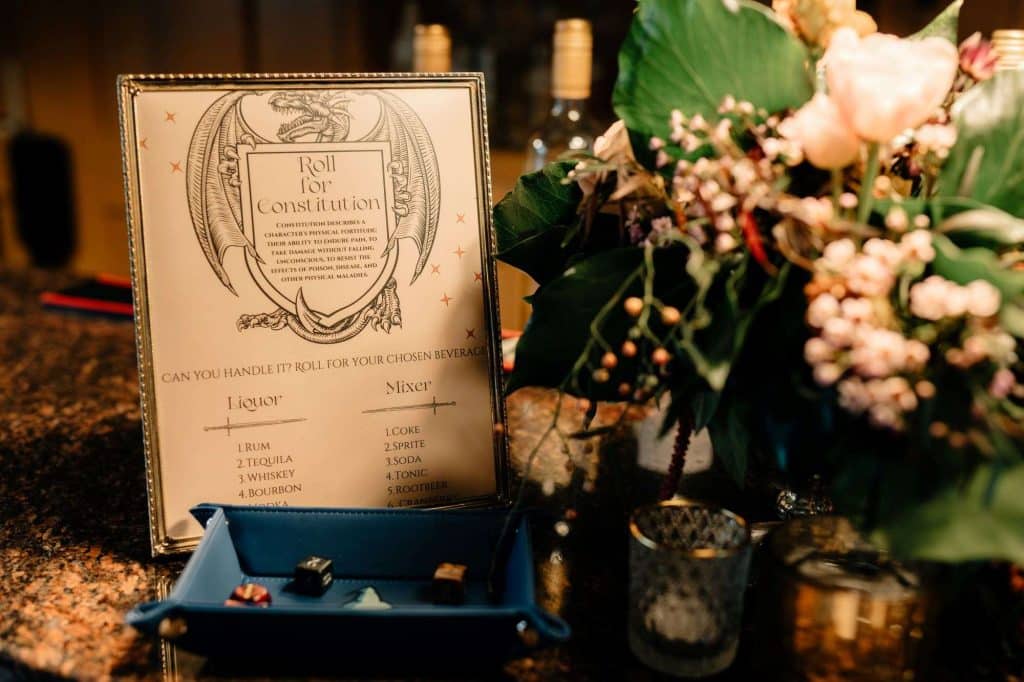 Bringing in the true Wisconsin flavor, the couple was excited to share a fish fry with their guests for dinner. A lot of guests were from out of town so it was a huge hit! A mixed drink generator was also incorporated as you got to have the option of rolling for your drink, taking a nod from Dungeons and Dragons. For dessert was coffee and donuts! Each guests received a coffee mug which also served as their place card that they got to take home.