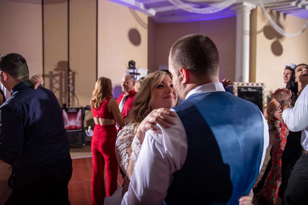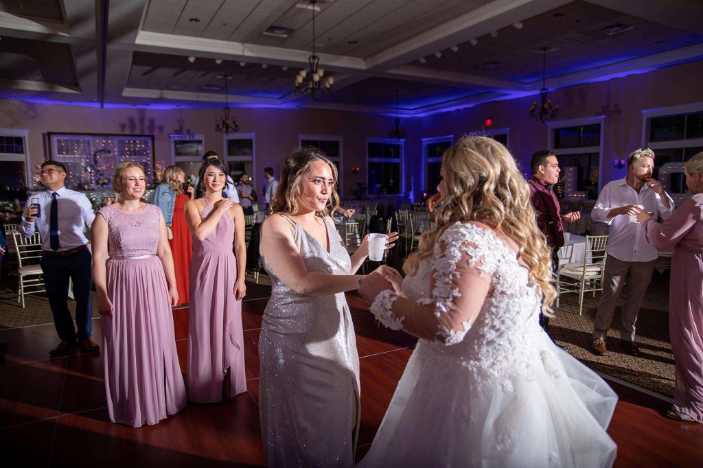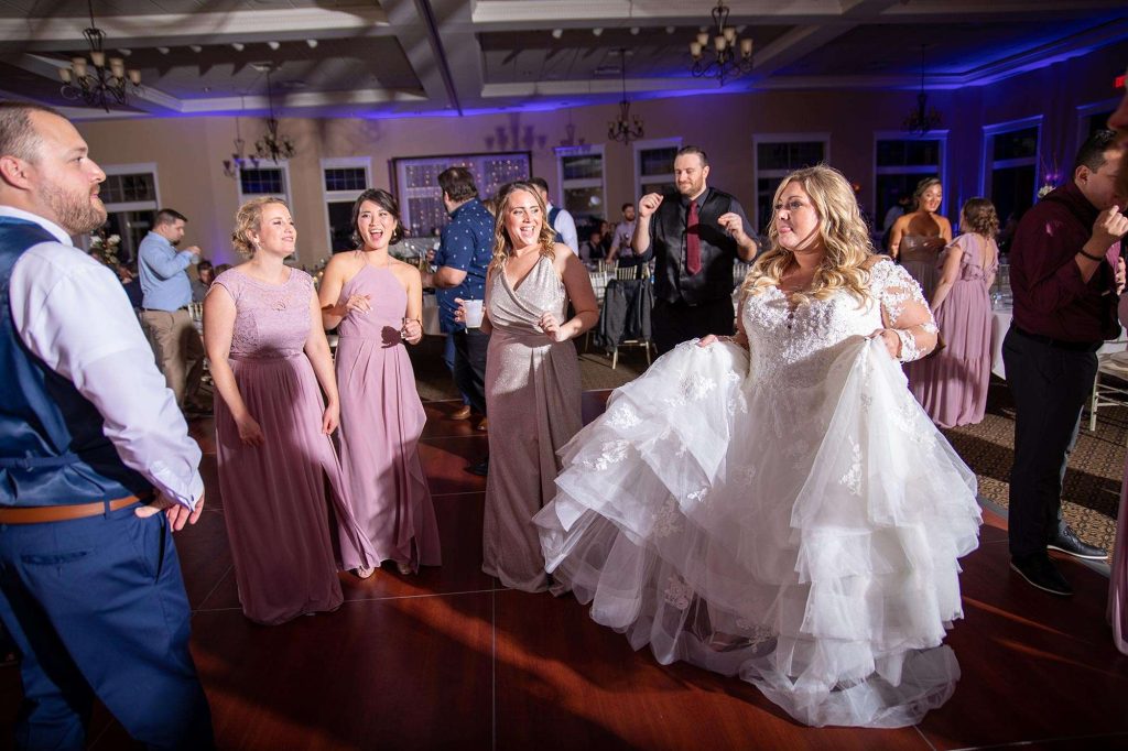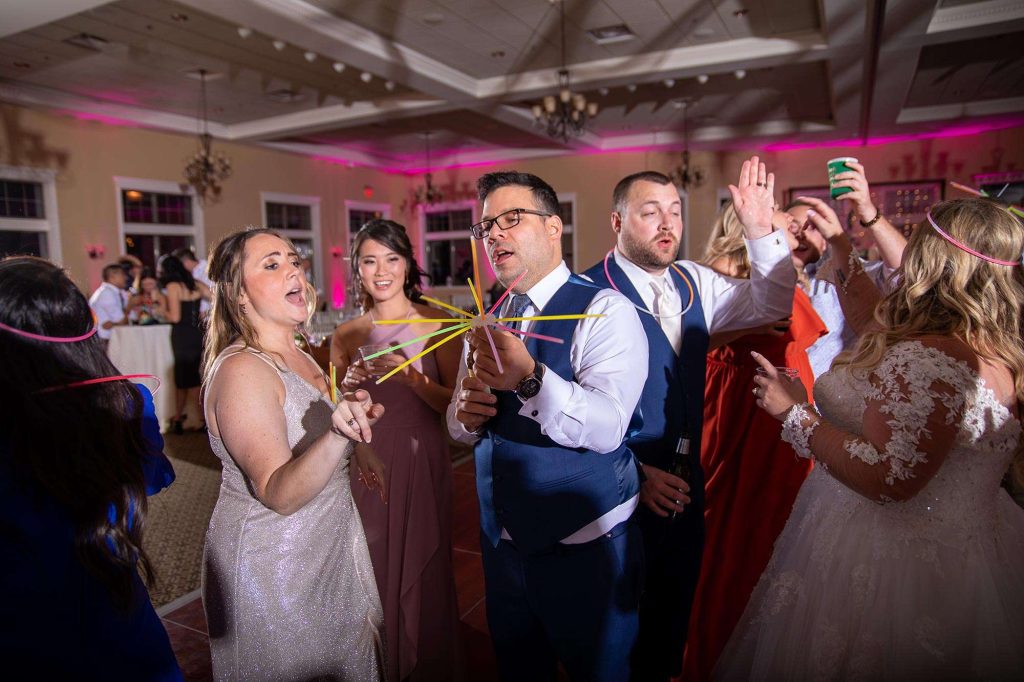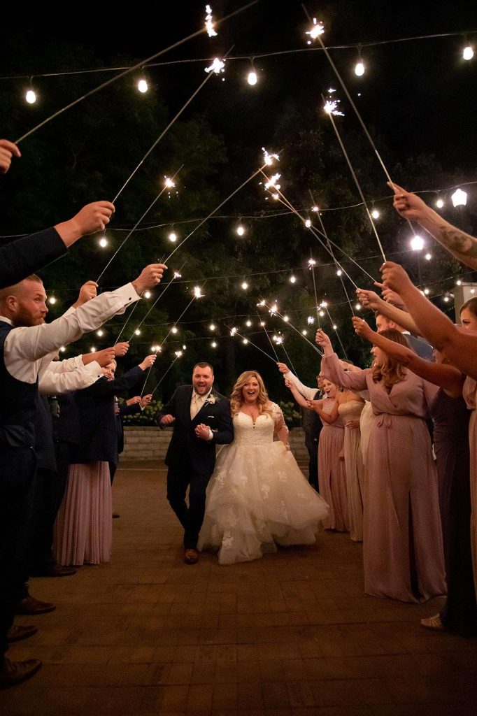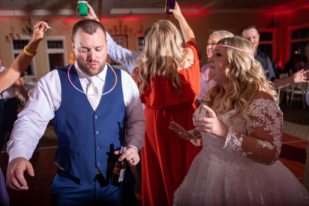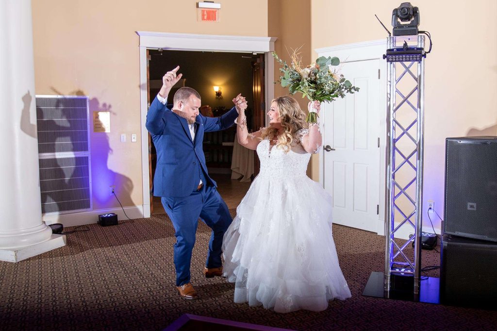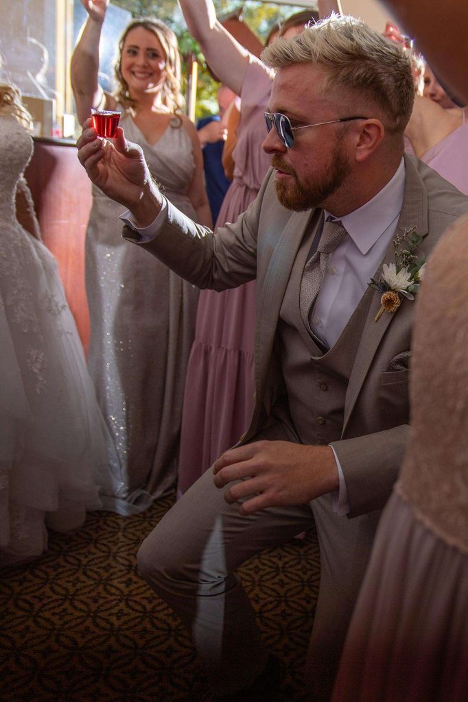 Later, as the new Mr. and Mrs. were announced and entered their reception, the two went straight to the bar to take their first shots as husband and wife. “Right after, we surprised our wedding party and called them over to take a group shot too.”