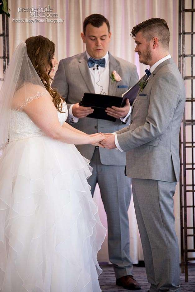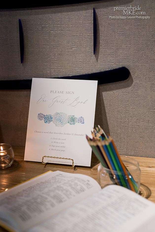 Both the ceremony and reception were held at VUE at the Hyatt Regency in downtown Milwaukee.“We wanted an intimate wedding with around 60–100 guests,” Amanda says. “But it was proving to be very hard to find a venue in the city that was small yet still celebrated the fact that this was our wedding day. When we met Brit from the Hyatt, it was the best wedding gift we could ever have received! She was energetic, genuinely happy for us, incredibly helpful, and knew her stuff. She was organized and had our best interest at heart. It felt like we were planning our wedding with a friend.”