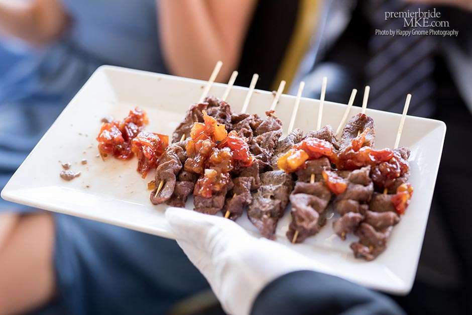 Dinner, drinks, and dessert were all catered by the Hyatt. Immediately following the ceremony, guests were invited to drink at Bar 333 in the hotel lobby, while Amanda and Jordan snapped some pictures with their families. Then, during cocktail hour, there was marinated beef satay, mini Monte Cristo sandwiches, potato-wrapped shrimp, and an open bar.