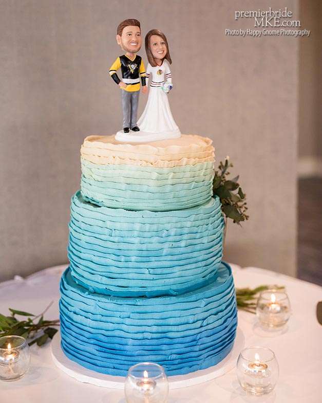 Dessert was a devil’s food cake with chocolate chip cookie dough frosting and filling. The cake topper was a special hit. “It was a 3D print of us wearing our rival hockey team jerseys!” Amanda laughs. “I’m a Blackhawks fan and Jordan is a Penguins fan. Guests ended up taking the topper out on the dance floor, passing it around and even taking pictures with it! It was unintentionally the best party favor!”