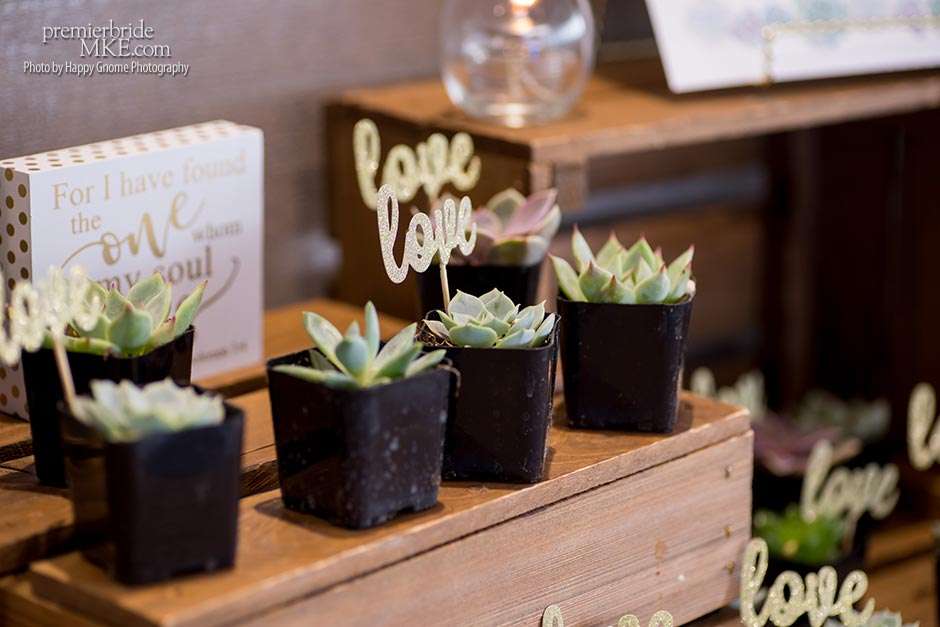 The wedding color scheme was actually inspired by succulents, playing off the natural blue, green, and soft pink tones. “We had steel blue bridesmaid dresses, light gray suits, natural greenery, and hints of soft pink with both gold and silver accents. The stationary, bridal bouquet, and party favors all incorporated succulents. Plus, the plant is a nod to Las Vegas, where we got engaged, and San Diego, where we honeymooned.”