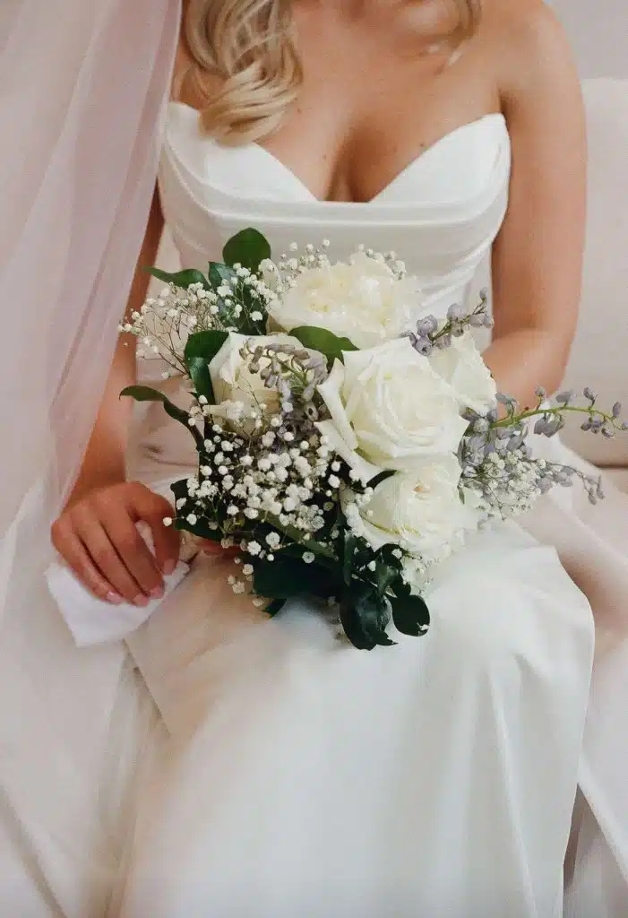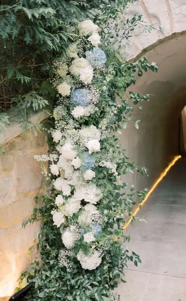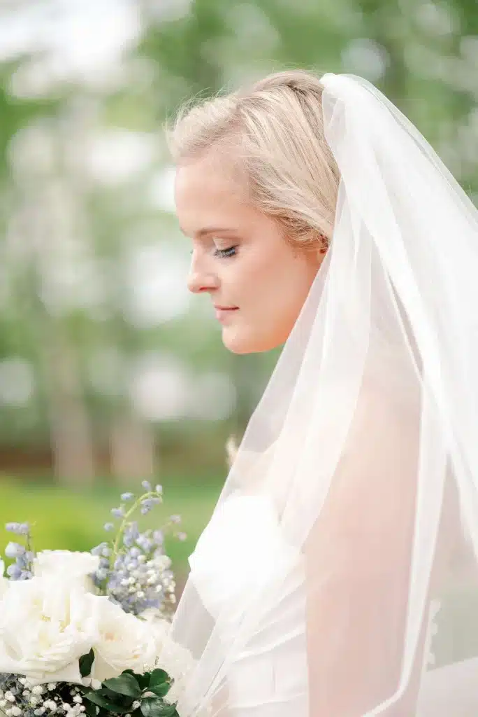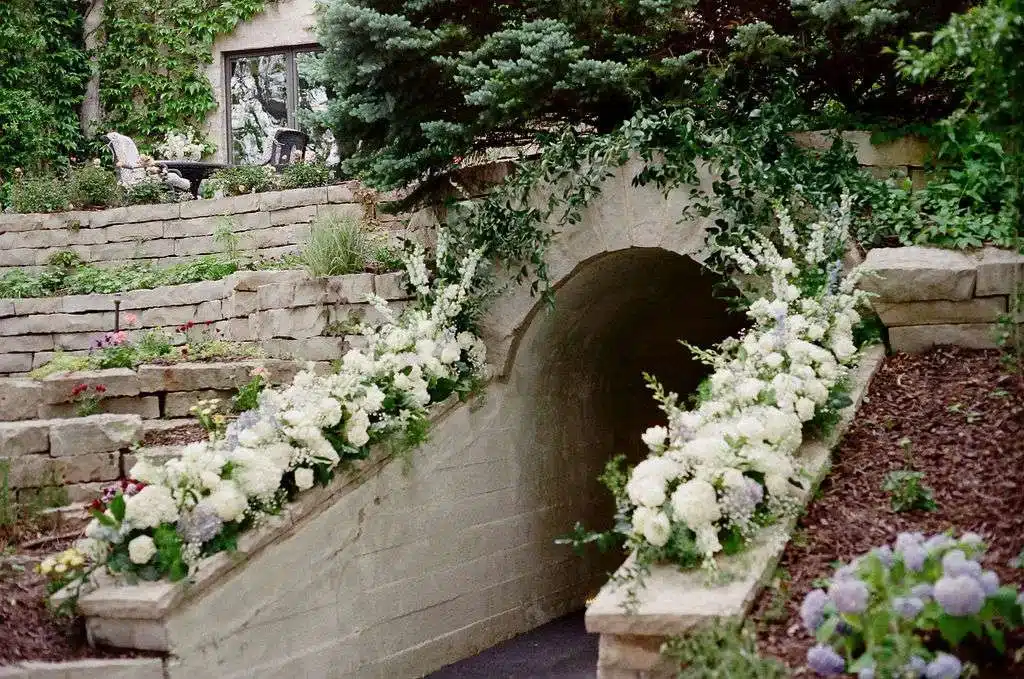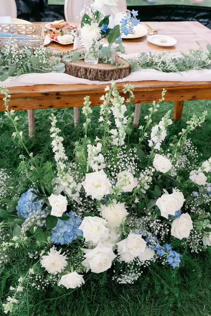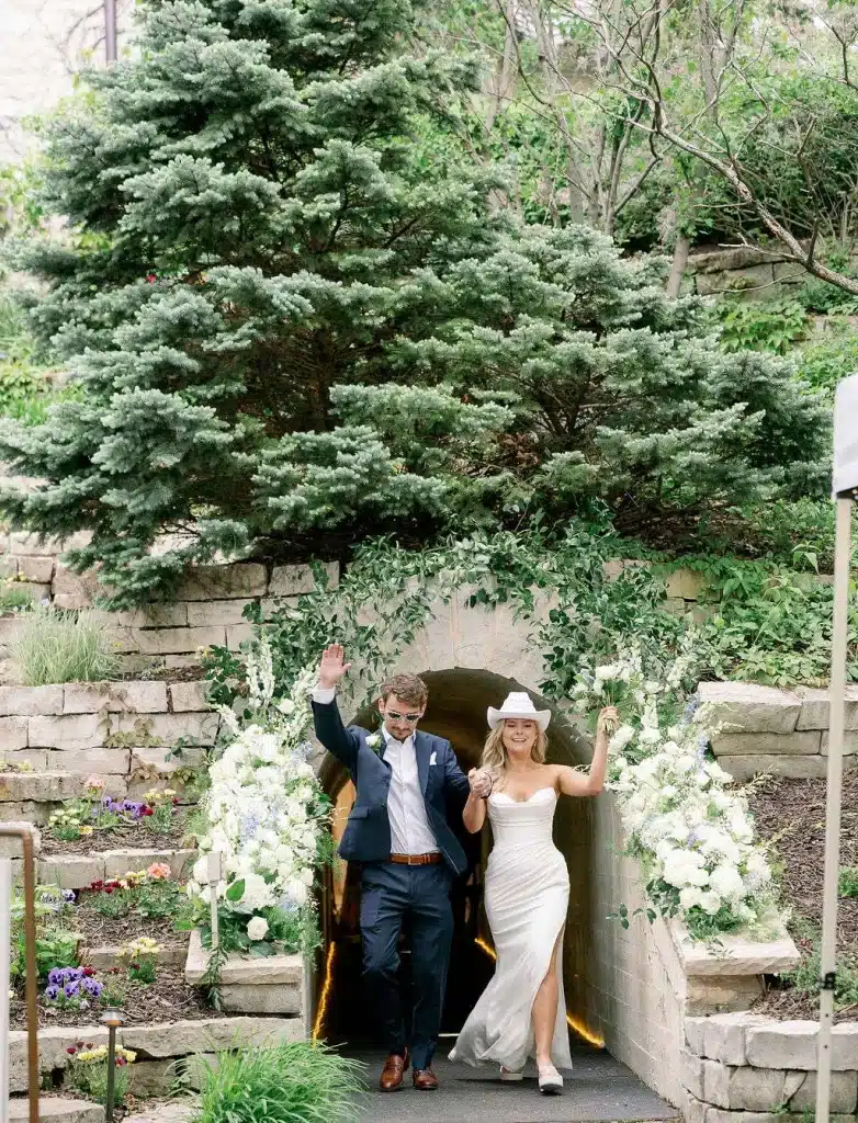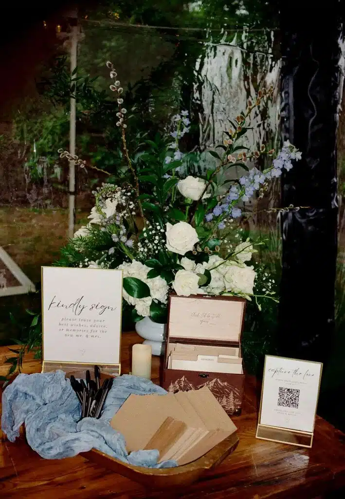 “We had a gorgeous conservatory tent with five antler chandeliers, a separate wood A-frame tent with a black and white checkered dance floor and stage. All of our decor had a mix of wood detailing and gold finishes. A mix of round linen tables and rustic wood rectangular tables draped with a cream chiffon table runner. On the upper patio we had an old fashion and cigar bar with unique old fashion flavorings. The mix of dusty blue, greenery, and cream really tied in the lake and greenery around the yard. We had a large light sign that spelled “love” that was a great photo opportunity. A photobooth and bonfire with smores were a big hit at the end of the night. Also, praise for a beautifully draped tunnel that was the entrance for the backyard reception with gorgeous broken flower arches above the tunnel entrances. My mother-in-law did an excellent job with the florals around the property and would not have looked as magical without her help.”