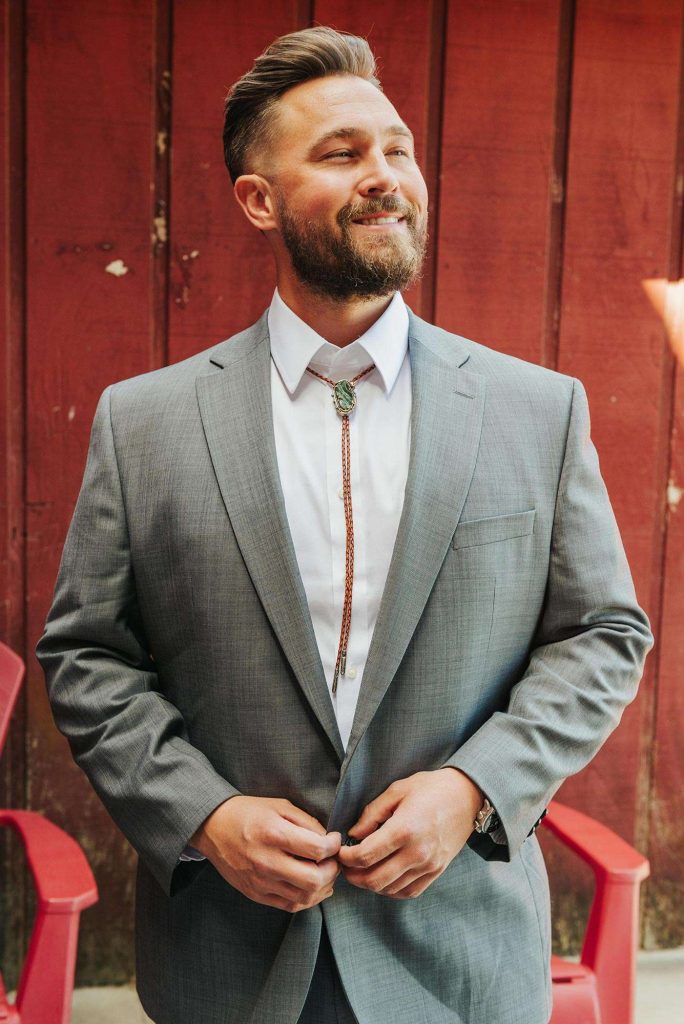 | Rings | Bride: Brilliant Earth, Groom: Ben Claus – Rise Designs for ring; bolo tie: Nick Cooney Tendai designs |
