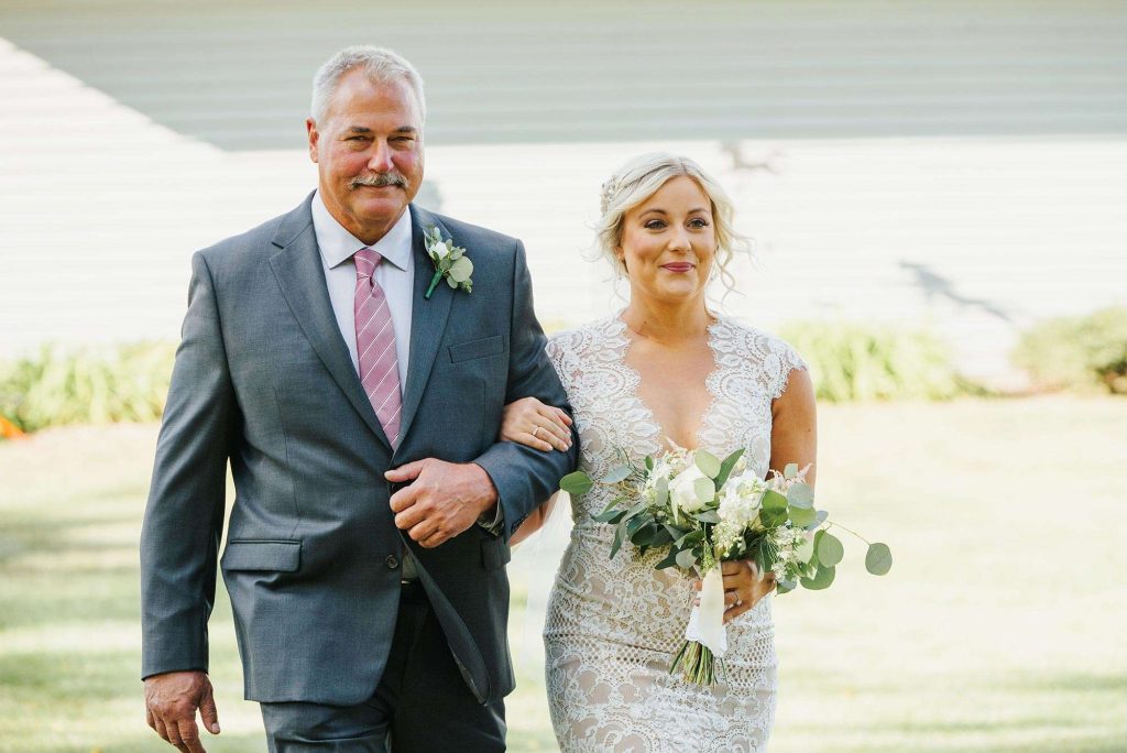 Ashley and Jon went with a rustic, romantic theme for their barn wedding. The festivities started with a first look. “I am so glad we planned a first look,” Ashley reflects. “It was such a nice moment between Jon and me—sort of the calm before the storm! It took away so many nerves for both of us and allowed us to enjoy the ceremony that much more.”