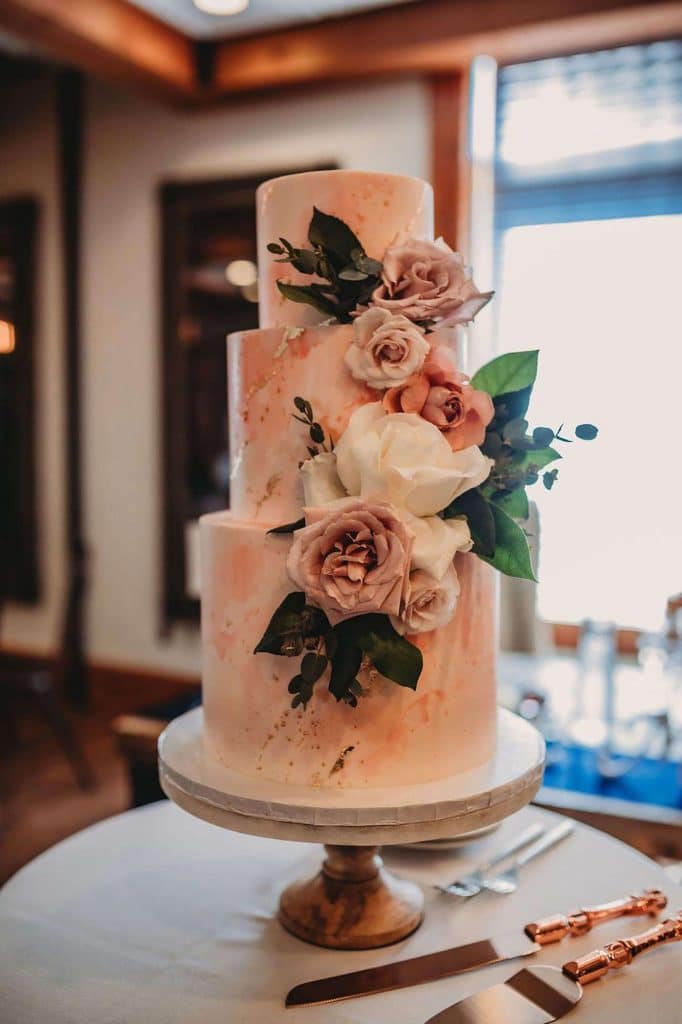 Guests enjoyed an open bar at the Ironworks Hotel, which started with the cocktail hour through the end of the night. Cocktail hour hors d’oeuvres included steak bites, stuffed mushrooms, and Caprese kabobs. For dinner, guests had a choice of petite tenderloin filet, Atlantic salmon, and chicken florentine. For a late night snack, folks munched on pizza from Merrill and Houston’s Steak Joint, the restaurant attached to the venue. In addition to cake, dessert included bite-sized cupcakes, lemon bars, brownies, and chocolate pretzel squares all from Sugarjones Bakery in Loves Park, Illinois.