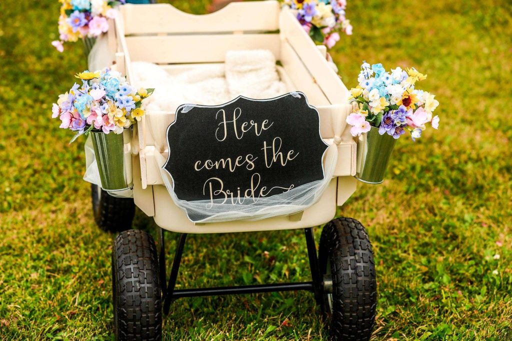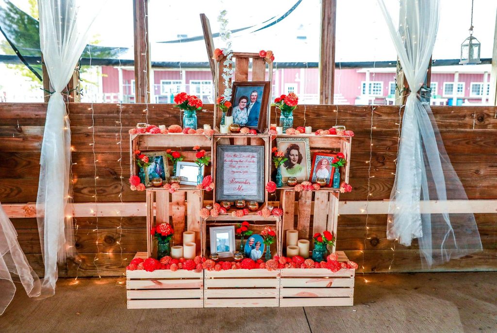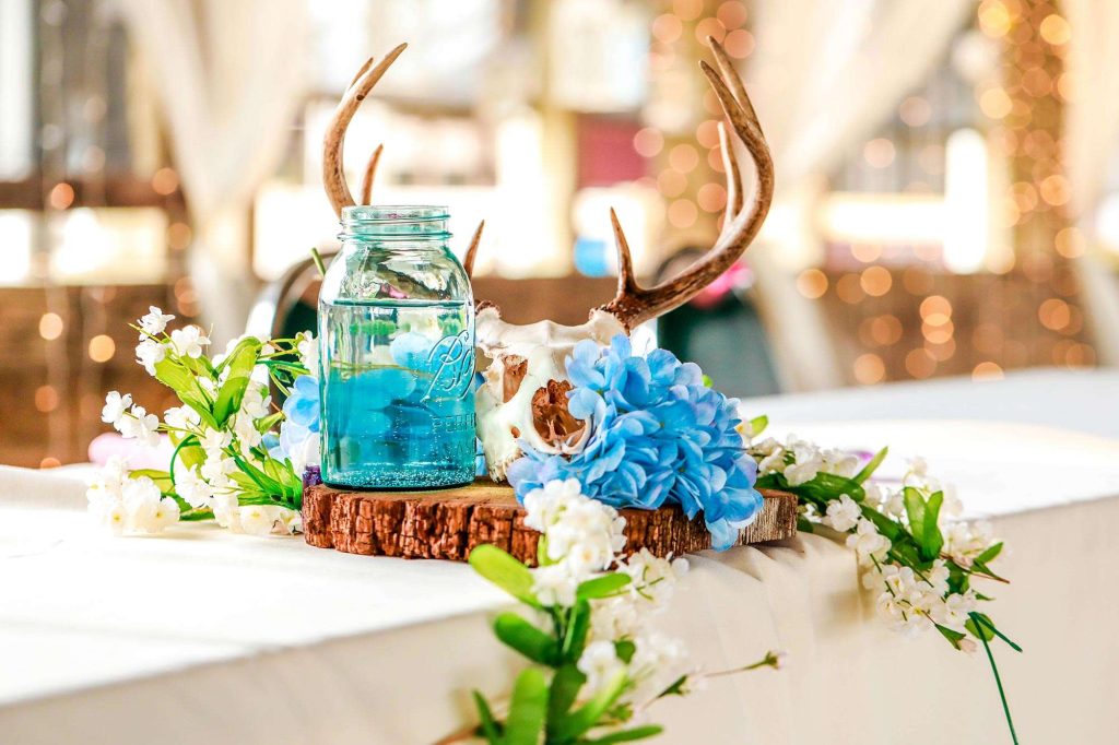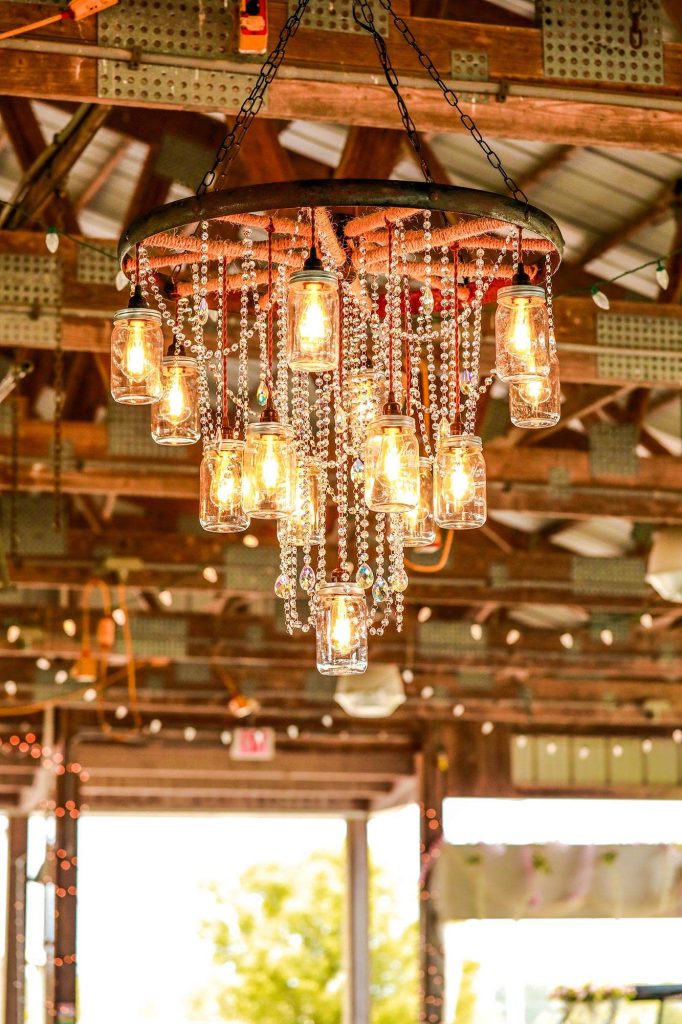 Being a crafter at heart, Bethany took upon other decorative pieces herself. “The lighted signs on the tables with Disney love song quotes, the lace-backed windows with parts of the ‘love is kind’ Bible verse, our birdcage card box, our memorial display, the hand-dyed wood flowers—these were all done by me.” But the biggest and most-beautiful DIY was the wagon wheel and mason jar chandelier that Justin and Bethany hung from the center of the barn.