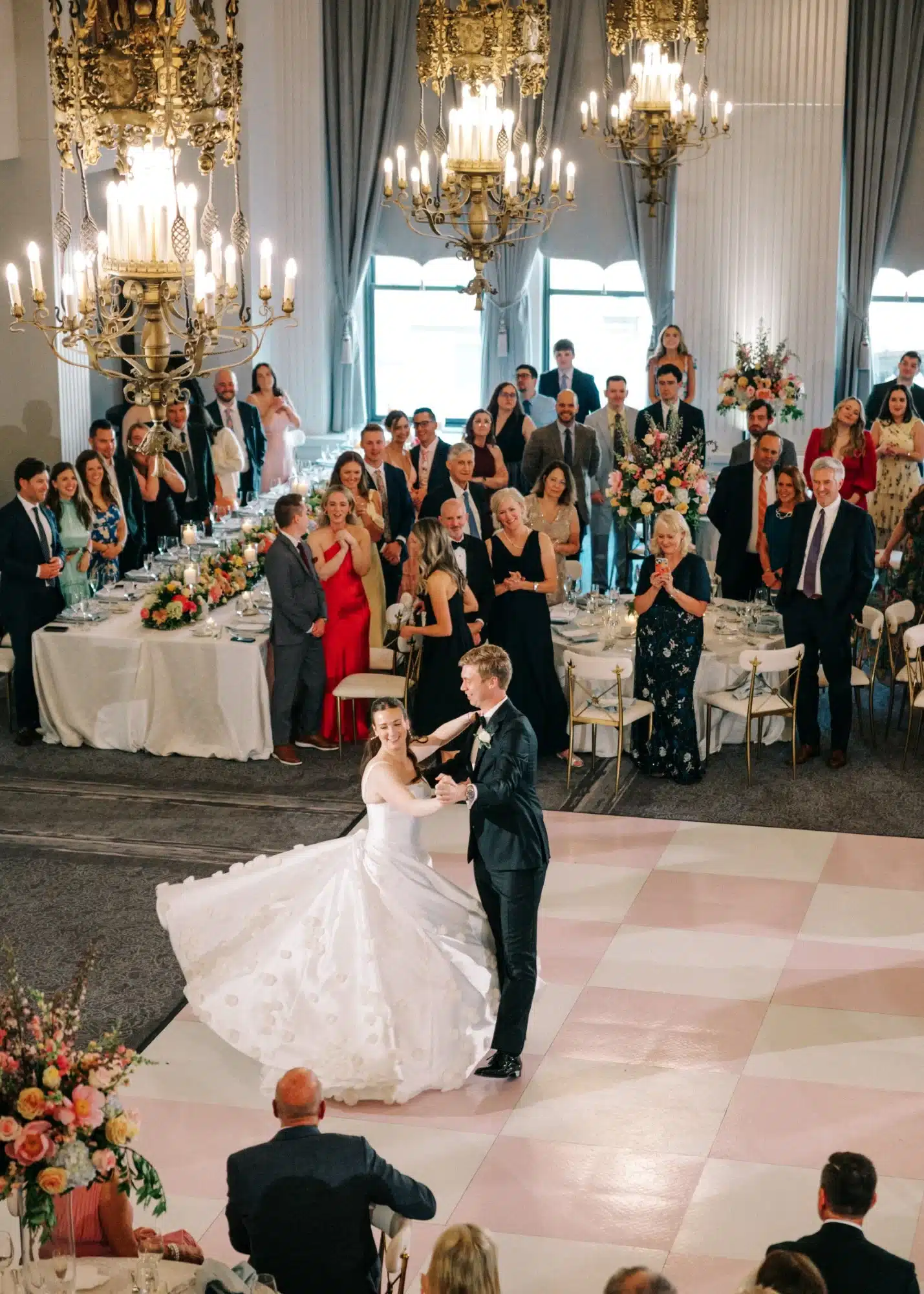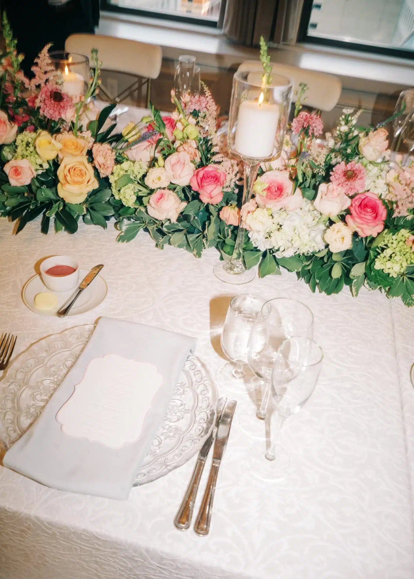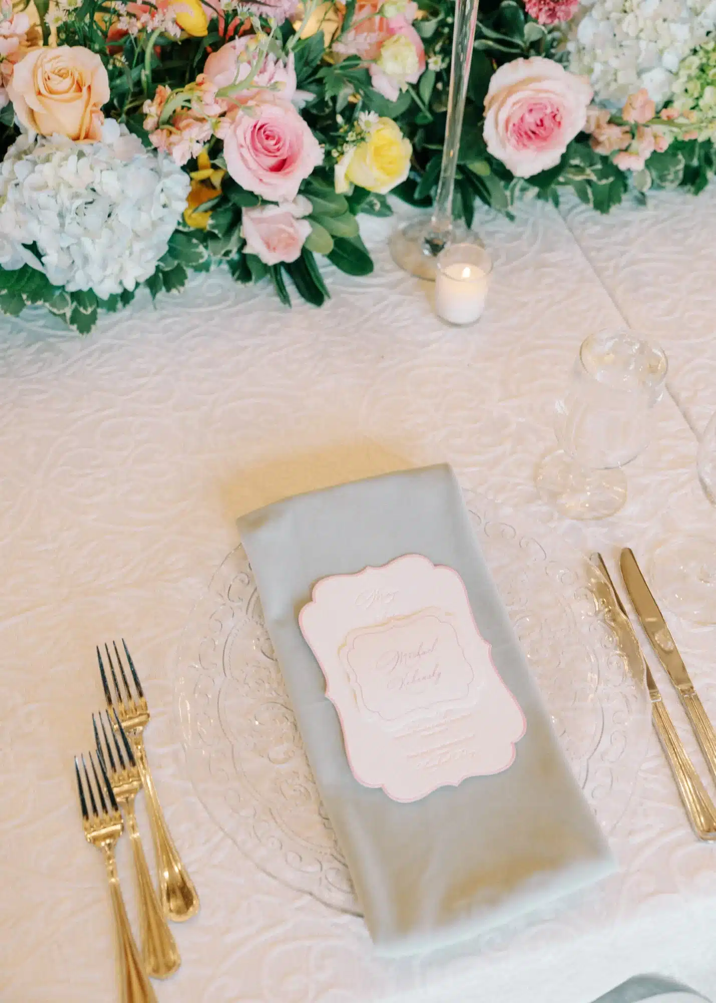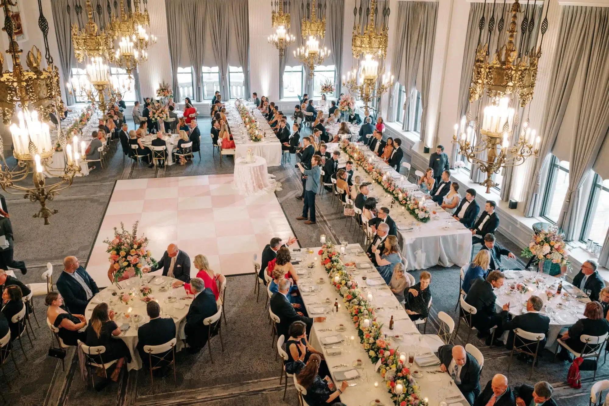 “We focused again on florals with arrangements down the middle of each long table. It was important to me that the guests tables were just as decorated as the head table. Round tables had tall florals with smaller arrangements on the table to create dimension. We brought in event more color with a pink checkered dance floor.”