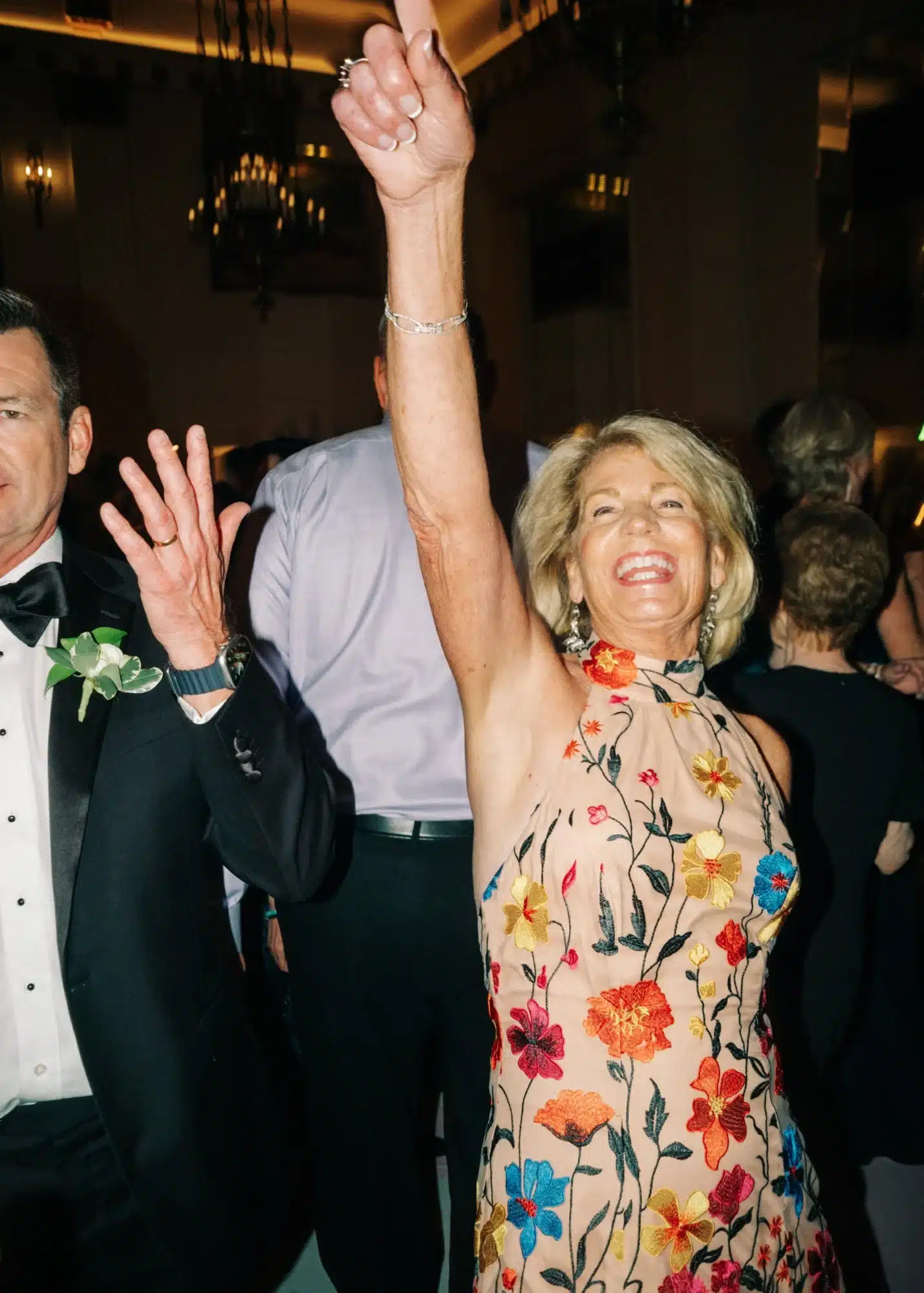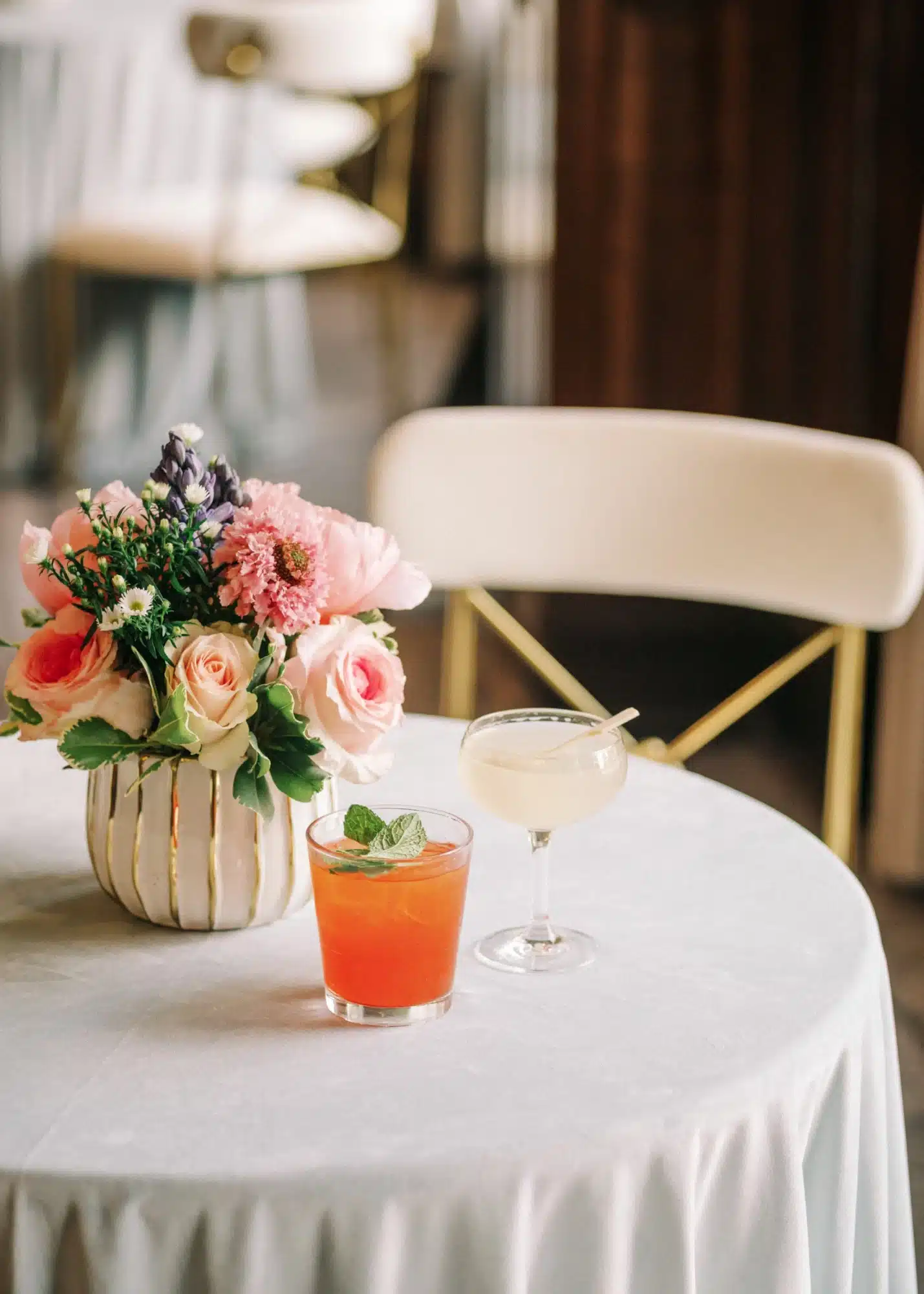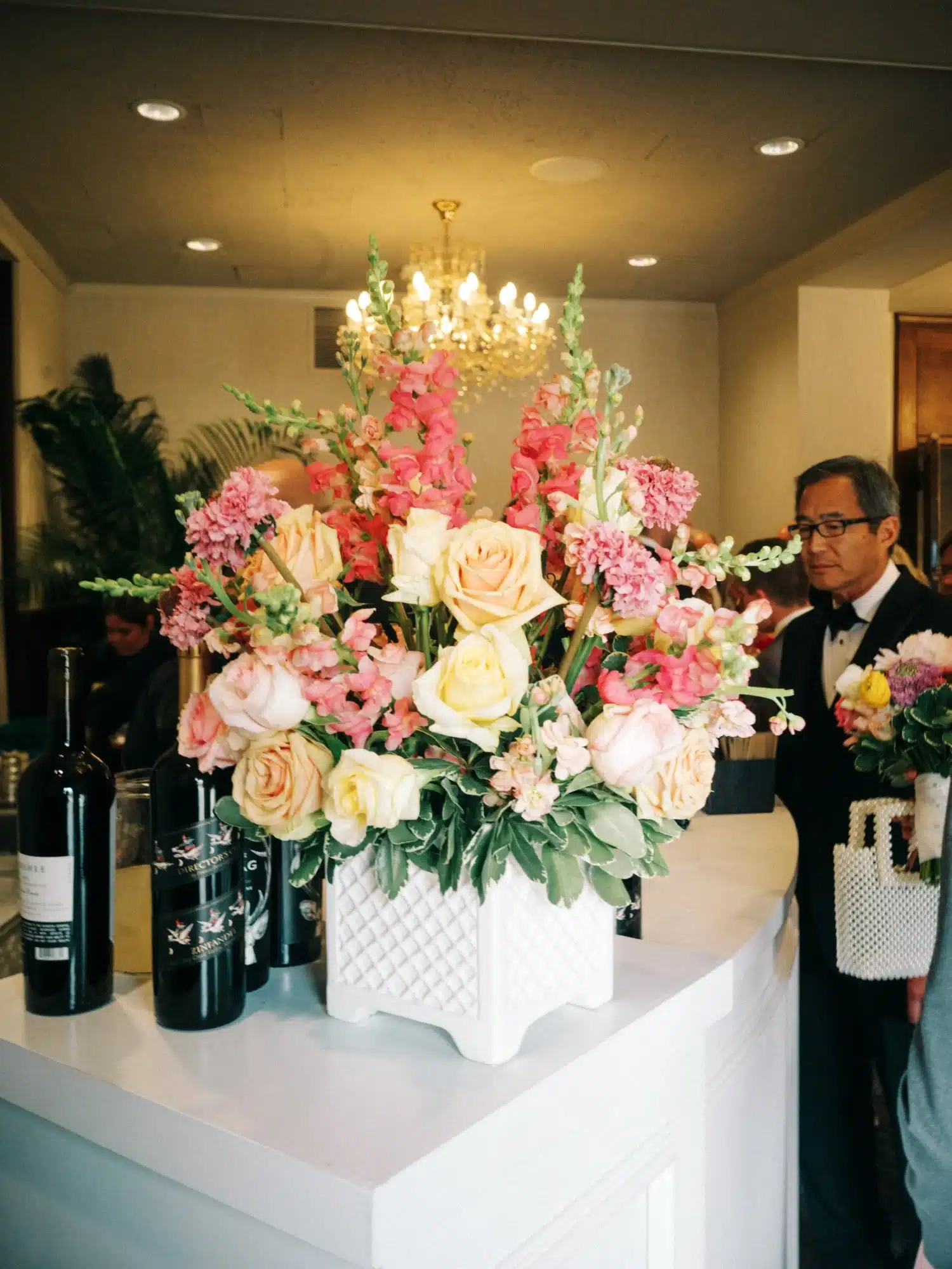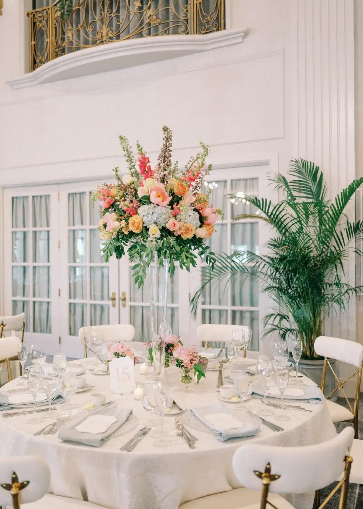 “We focused again on florals with arrangements down the middle of each long table. It was important to me that the guests tables were just as decorated as the head table. Round tables had tall florals with smaller arrangements on the table to create dimension. We brought in event more color with a pink checkered dance floor.”