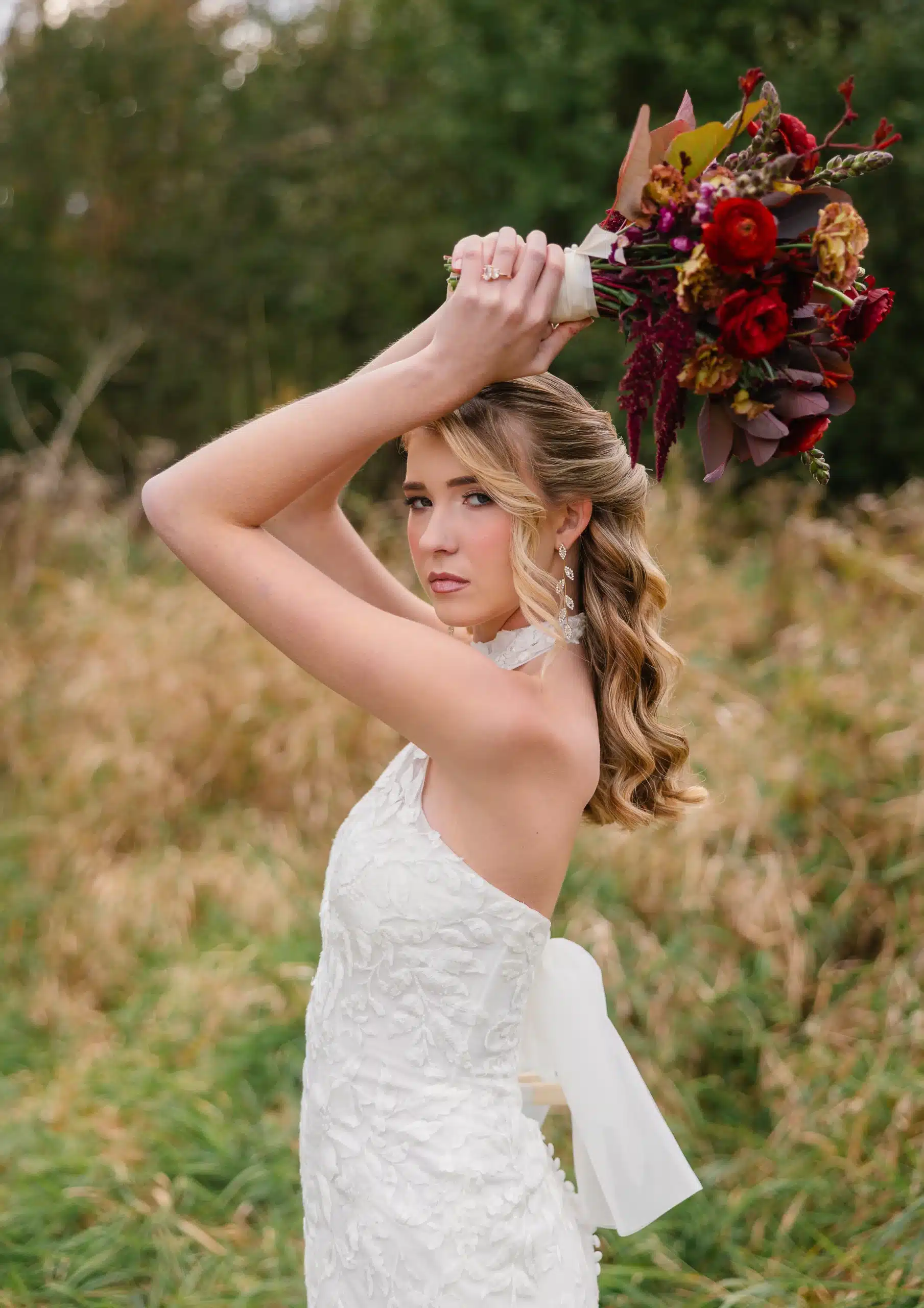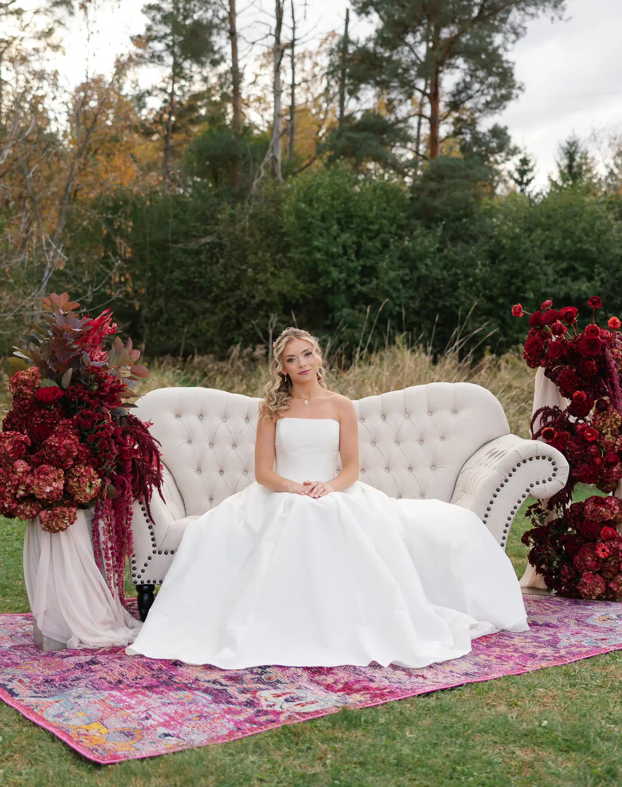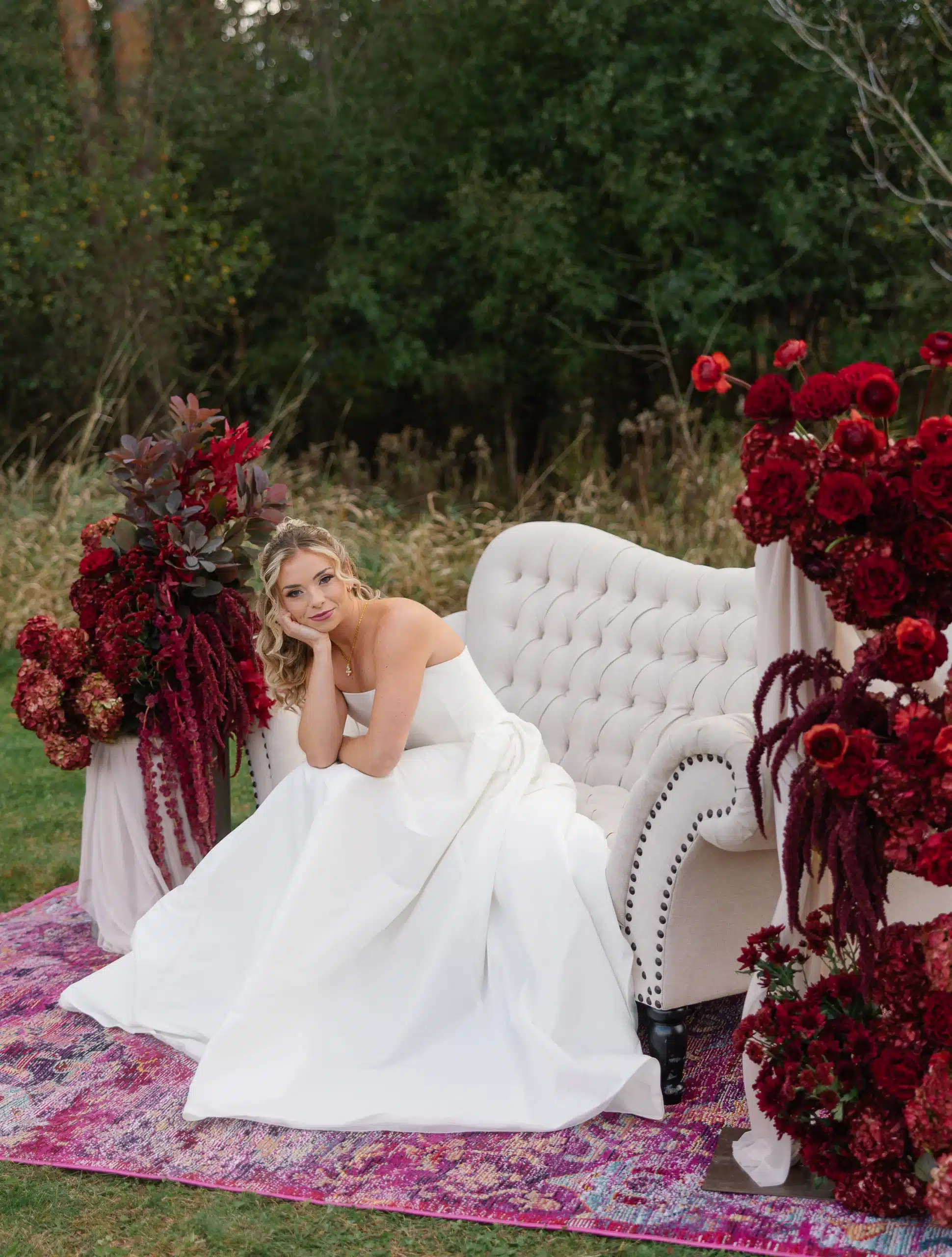 If you haven’t grabbed our latest issue yet, now’s the time. Our “Couture Meets Color” styled shoot at Lapham Peak State Park featured two completely distinct floral design perspectives, each bringing its own personality to the editorial while still blending seamlessly together. Now, we’re diving into all things Feisty Flowers. From the dramatic movable floral backdrop to the moody soft seating installation layered in deep reds and burgundy blooms, every design element felt bold, romantic, and fashion-forward. Add in two striking bridal bouquets and a floral accented welcome sign, the result was a floral story full of texture, depth, and unforgettable detail.