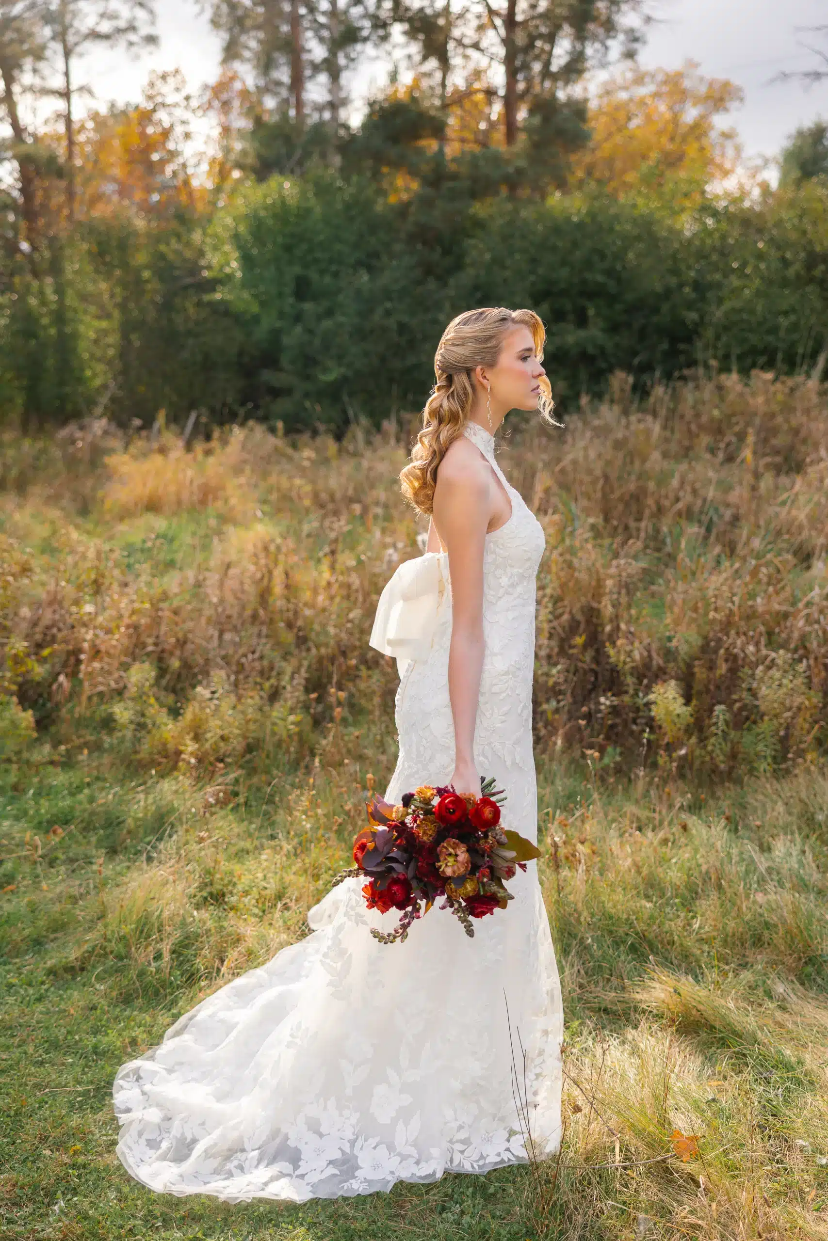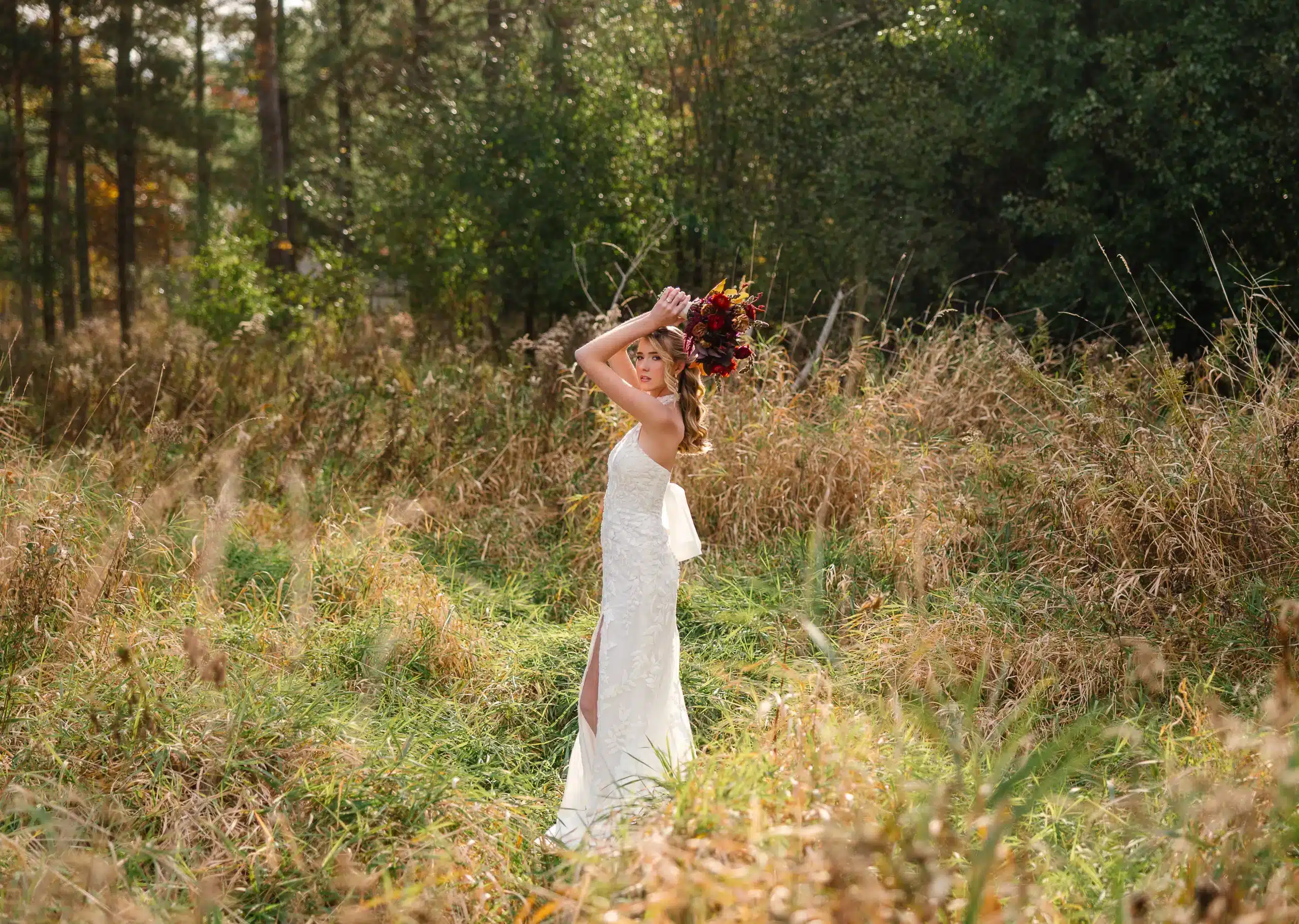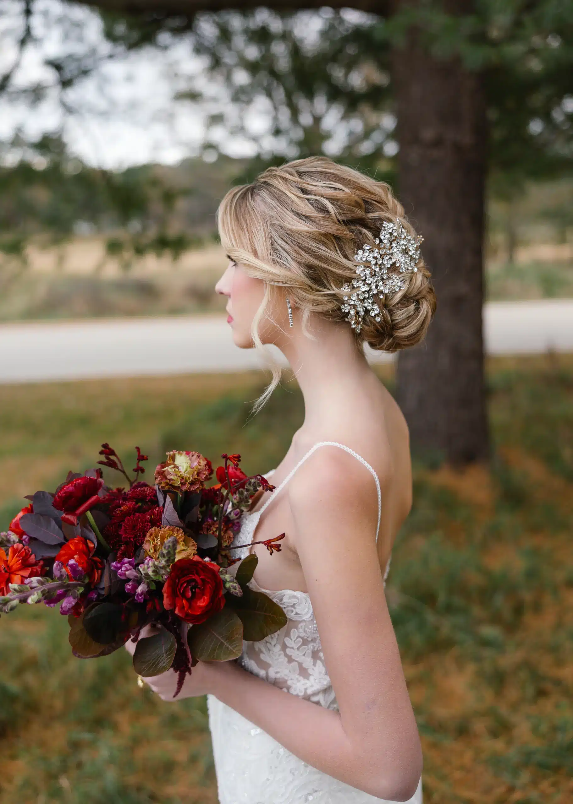 If you haven’t grabbed our latest issue yet, now’s the time. Our “Couture Meets Color” styled shoot at Lapham Peak State Park featured two completely distinct floral design perspectives, each bringing its own personality to the editorial while still blending seamlessly together. Now, we’re diving into all things Feisty Flowers. From the dramatic movable floral backdrop to the moody soft seating installation layered in deep reds and burgundy blooms, every design element felt bold, romantic, and fashion-forward. Add in two striking bridal bouquets and a floral accented welcome sign, the result was a floral story full of texture, depth, and unforgettable detail.