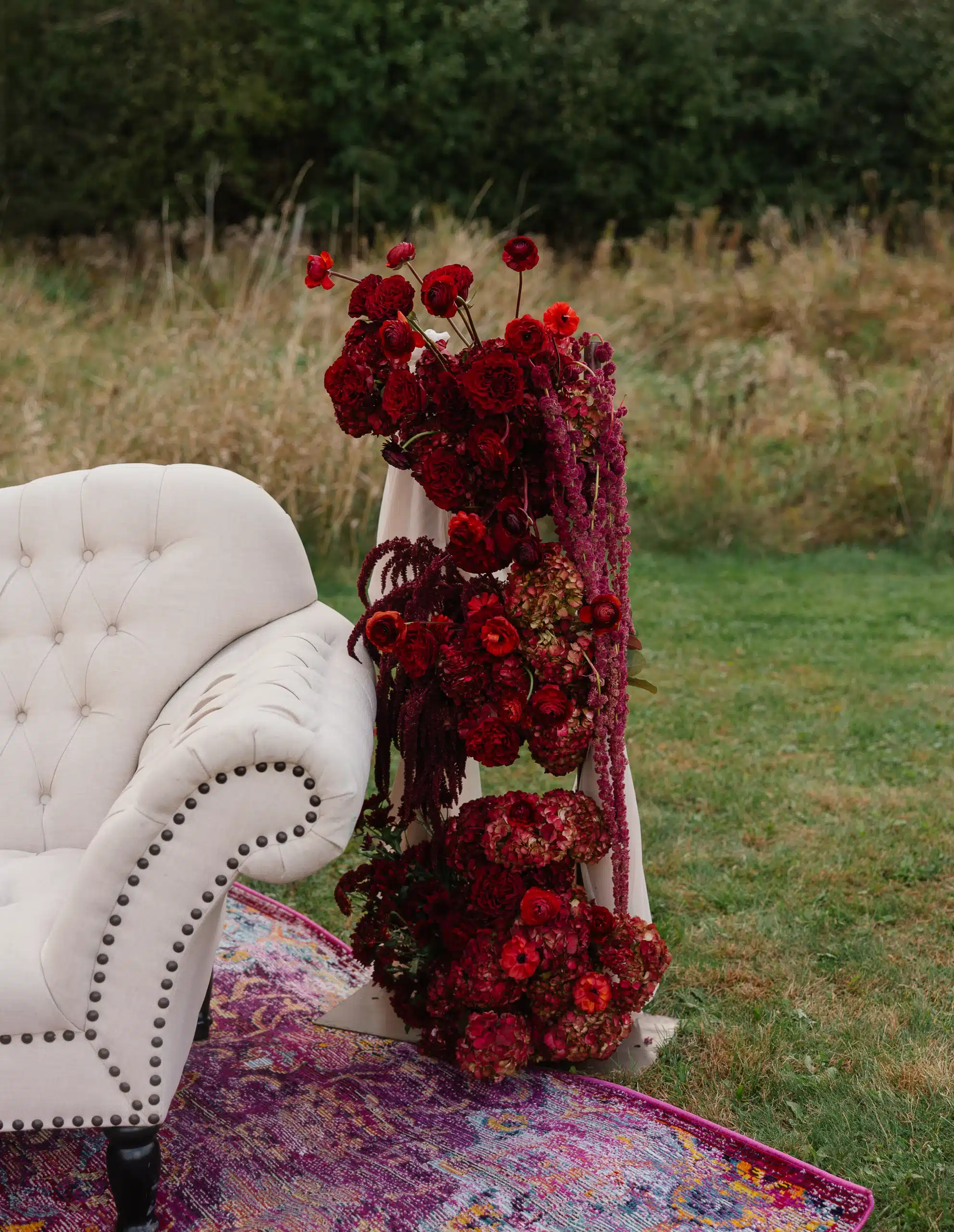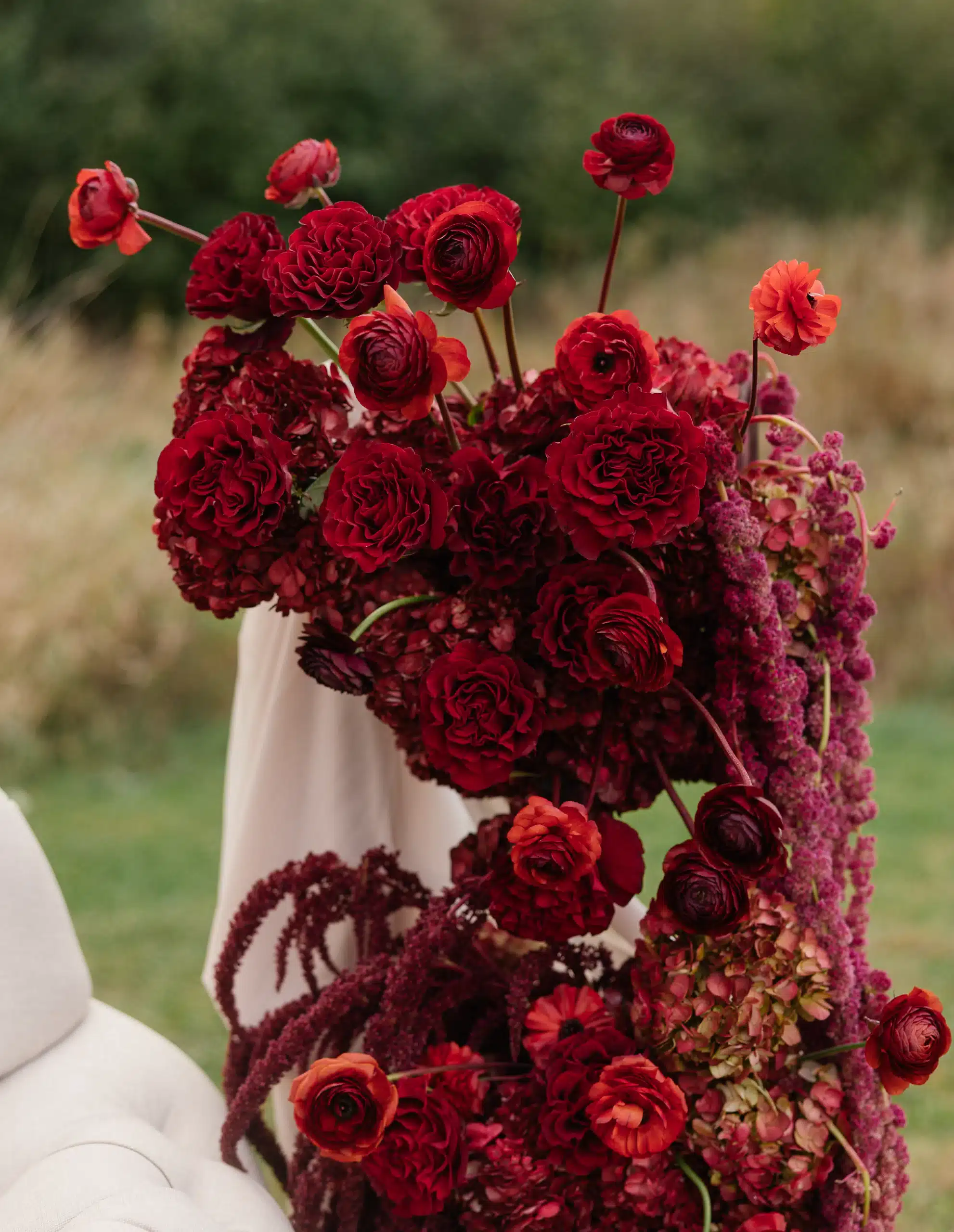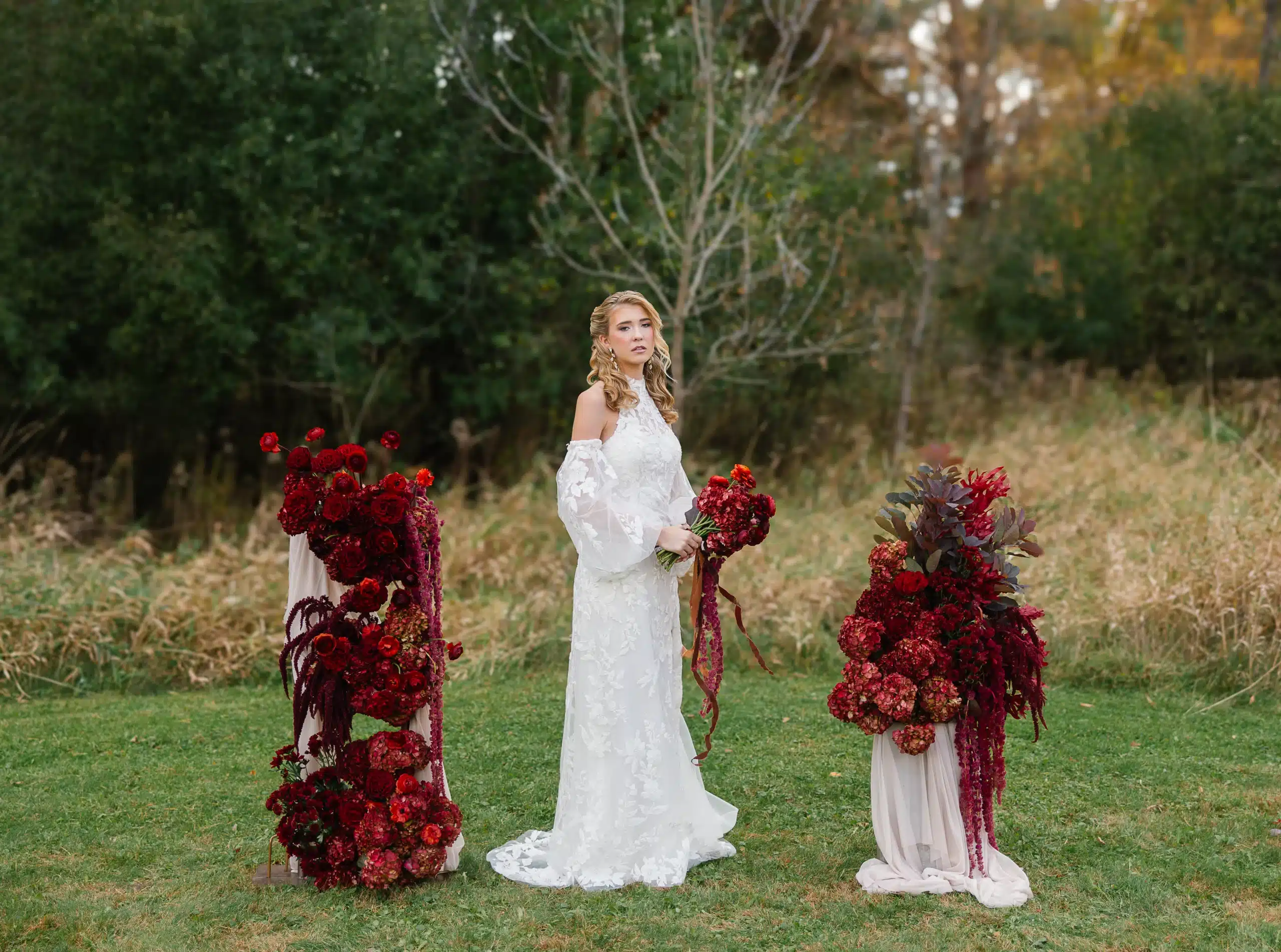 One of the standout design elements from the shoot was a custom movable floral backdrop designed by Feisty Flowers. Overflowing with lush blooms in deep reds and burgundy shades, the installation created a stunning focal point that could easily transition throughout a wedding day.