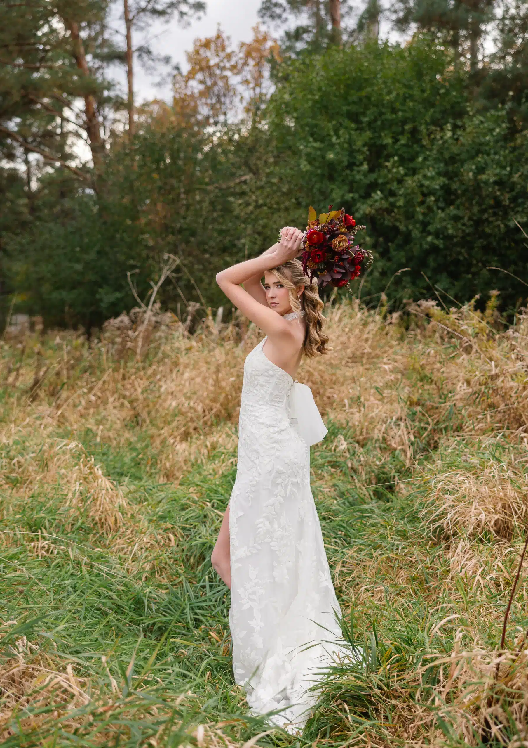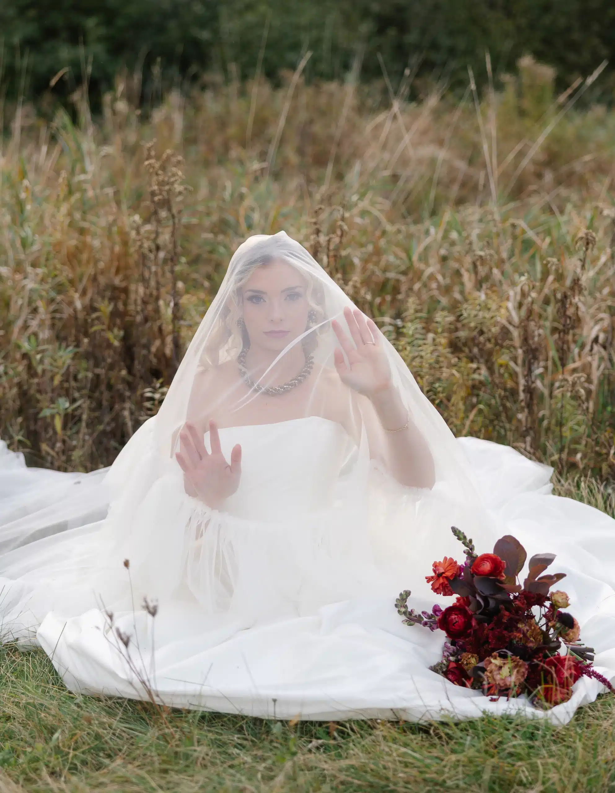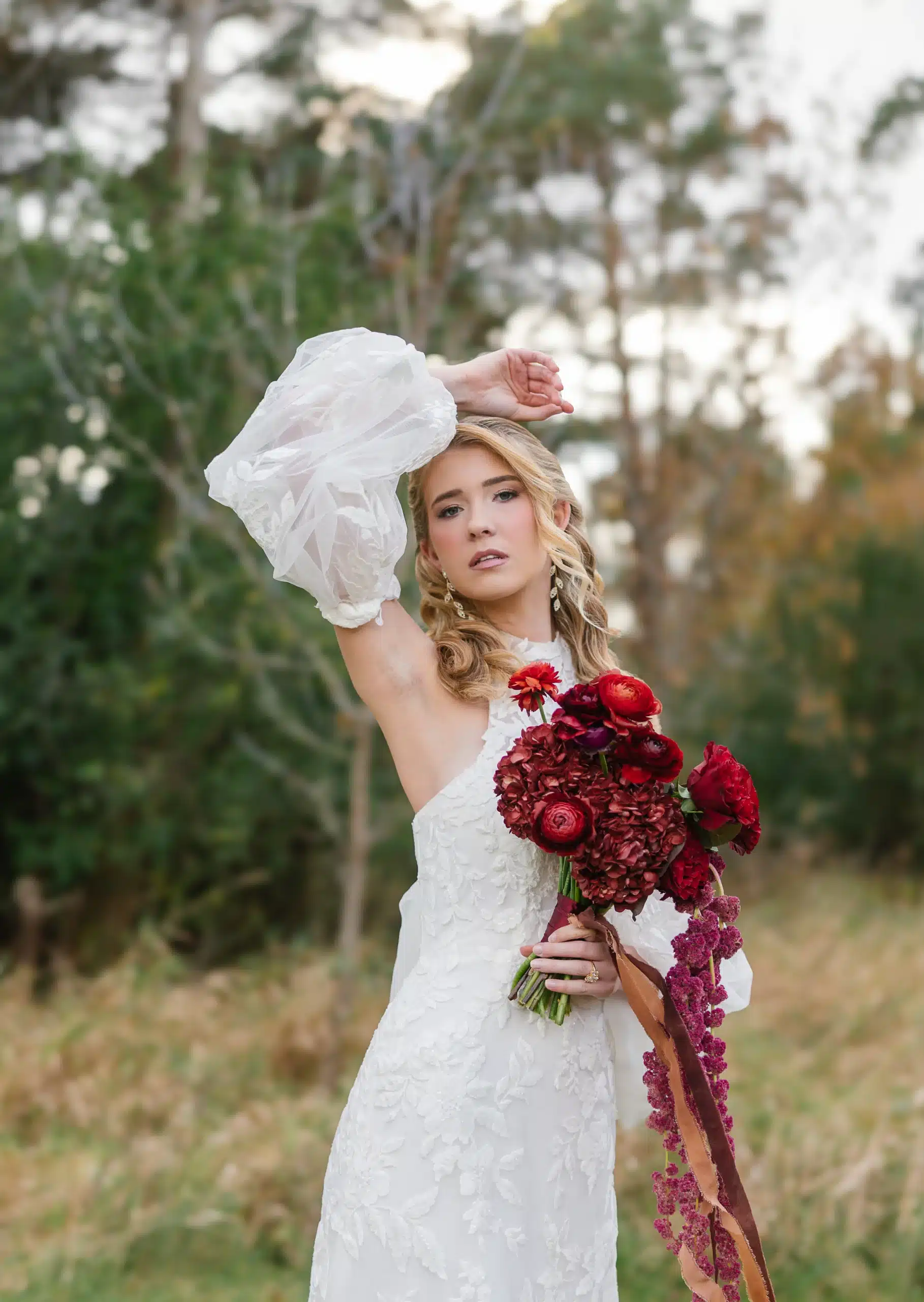 One of the standout design elements from the shoot was a custom movable floral backdrop designed by Feisty Flowers. Overflowing with lush blooms in deep reds and burgundy shades, the installation created a stunning focal point that could easily transition throughout a wedding day.