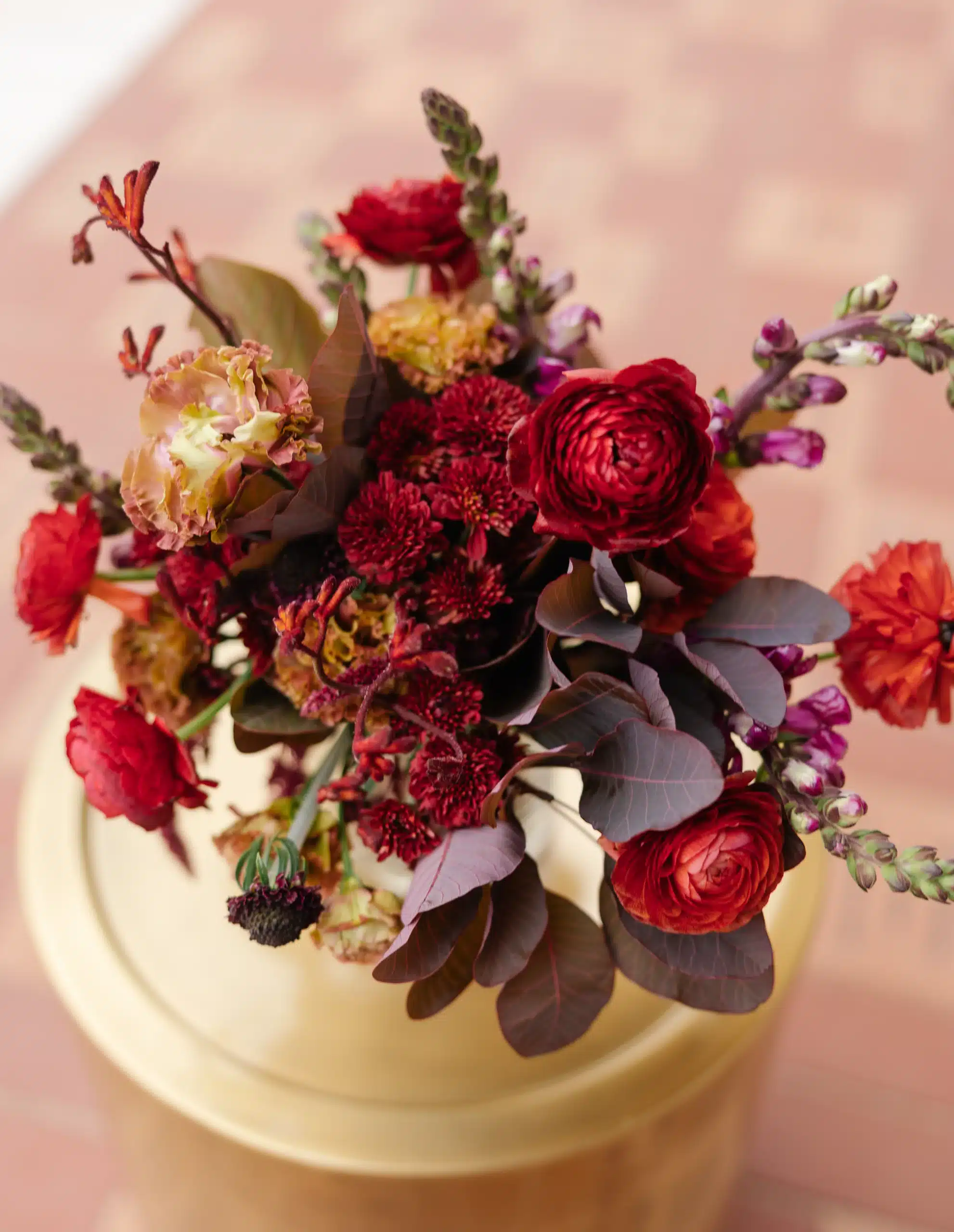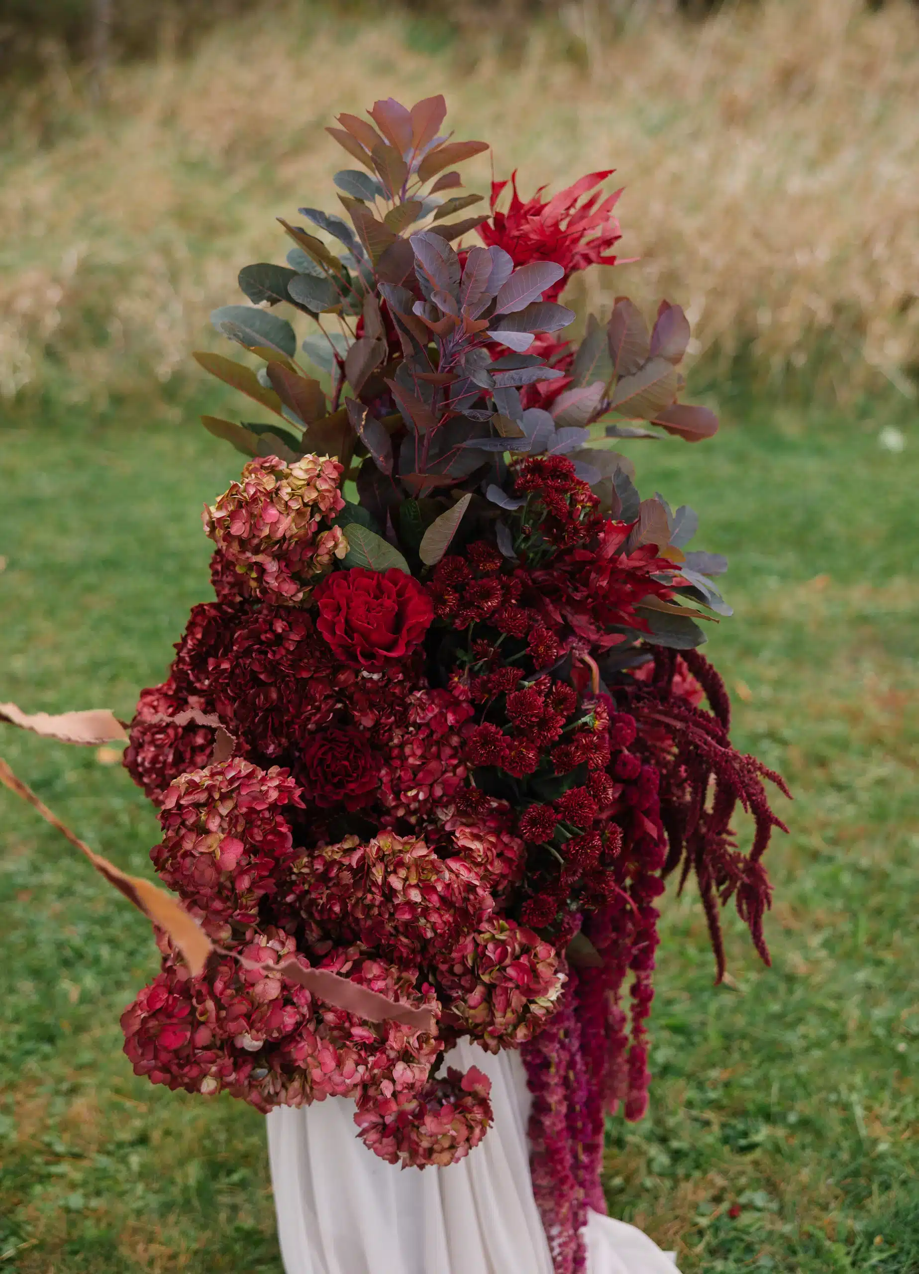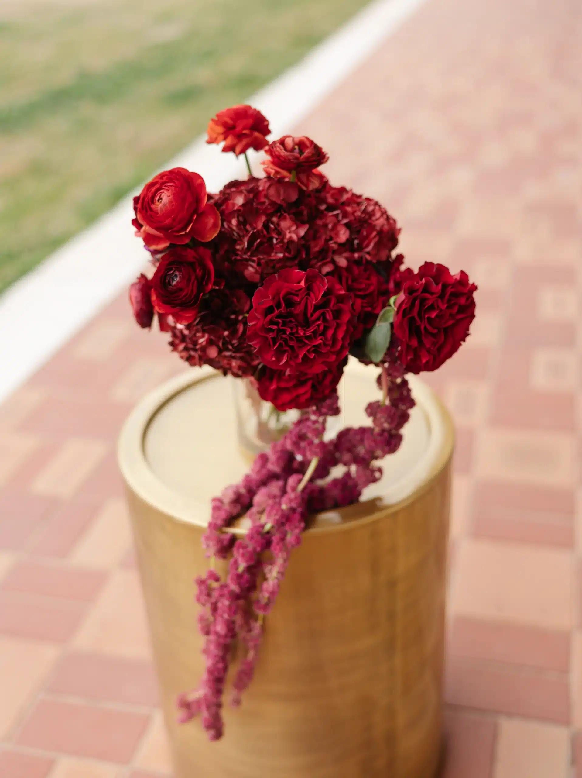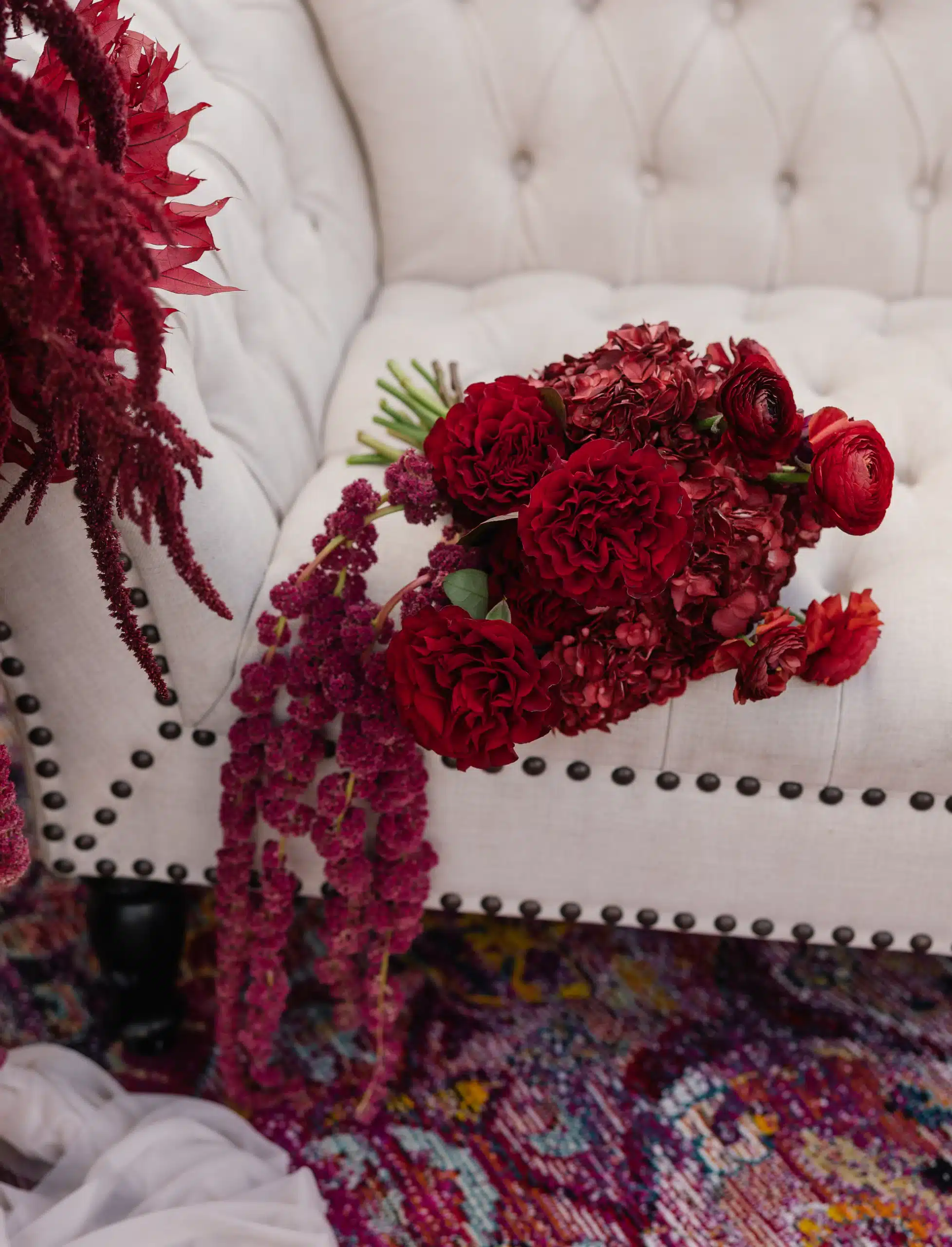 The floral artistry continued through two uniquely designed bridal bouquets. Each bouquet carried the same moody color palette while offering its own personality and movement. Rich burgundy blooms, dramatic red florals, and layered textures created bouquets that felt bold, romantic, and fashion-forward.