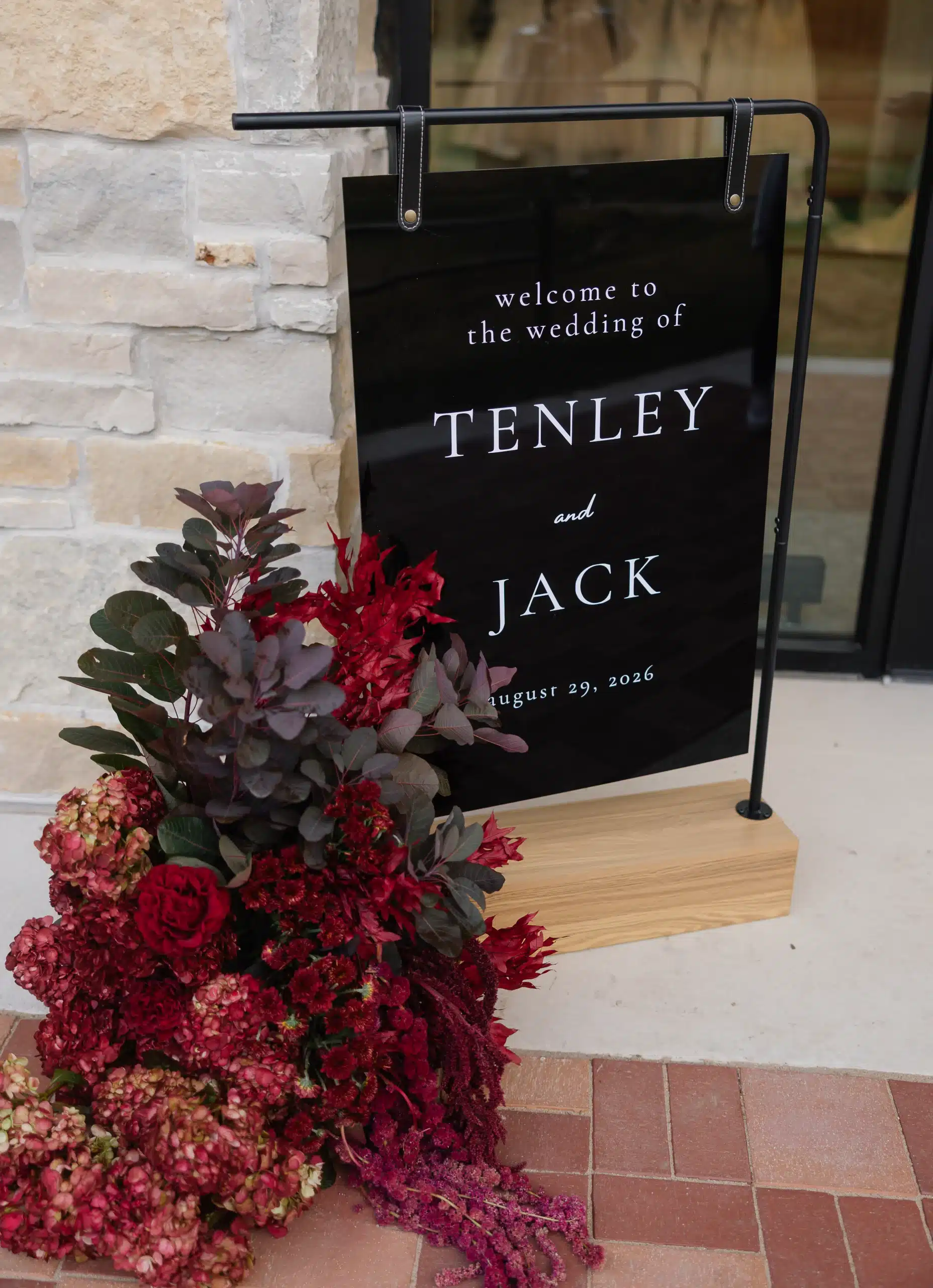 Beyond the large installations, Feisty Flowers also contributed floral accents to the welcome sign display, adding another thoughtful layer of design to the shoot. These smaller details helped create a cohesive aesthetic throughout the entire editorial and showcased how florals can elevate every touchpoint of a wedding design.