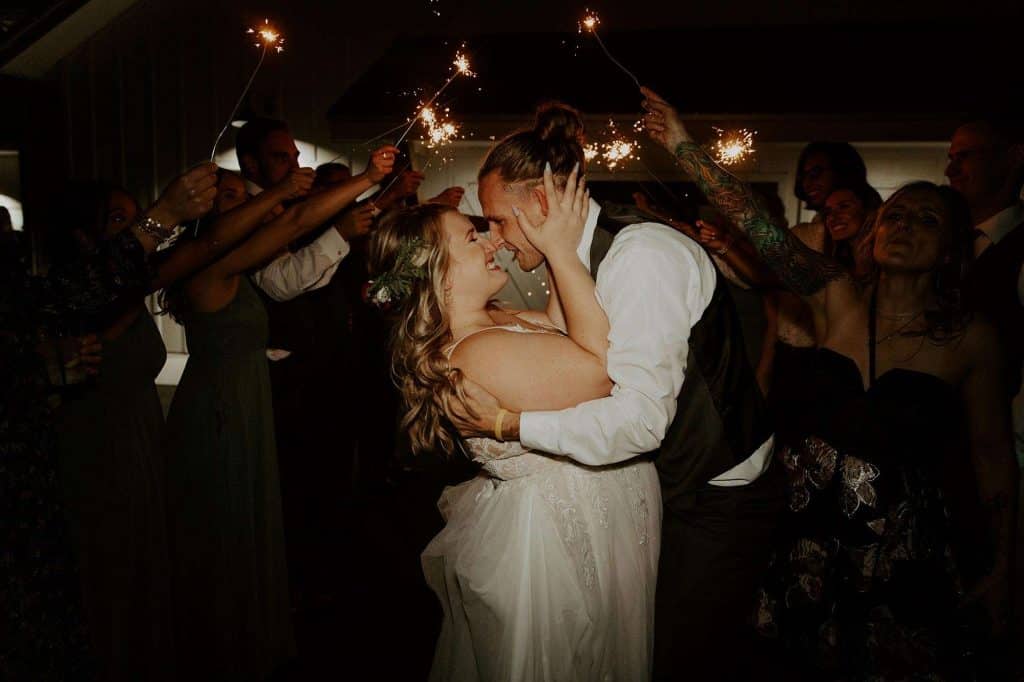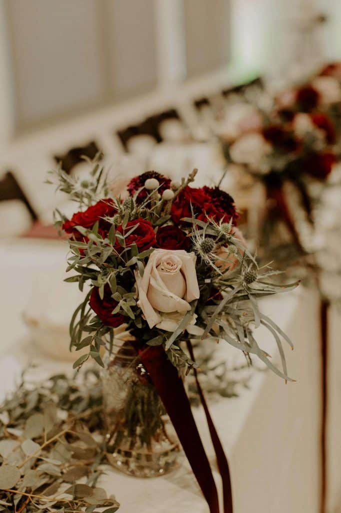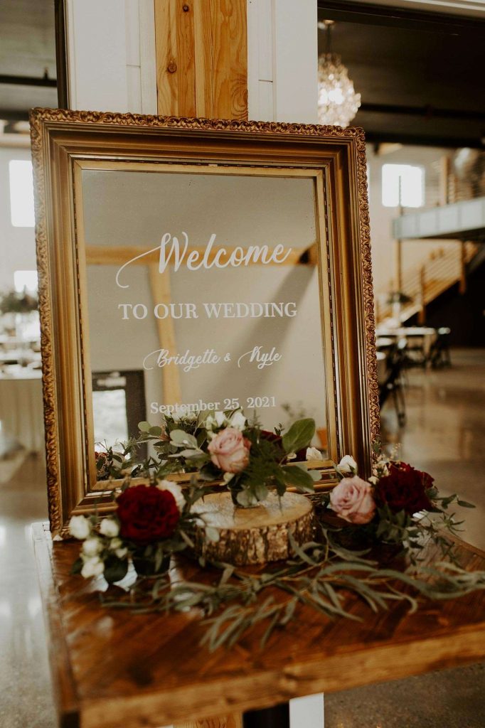 Kyle and Bridgette did their share of DIY to bring their woodsy theme to life. “We made our centerpiece platforms—cut logs sponged with metallic rose gold and gold, then stained. We also made our table numbers to have a rose gold mercury glass look. Kyle’s dad is a wood teacher, so he made us our welcome sign. Last but not least, we created the pallet wall backdrop used during our ceremony and then later for family pictures!”