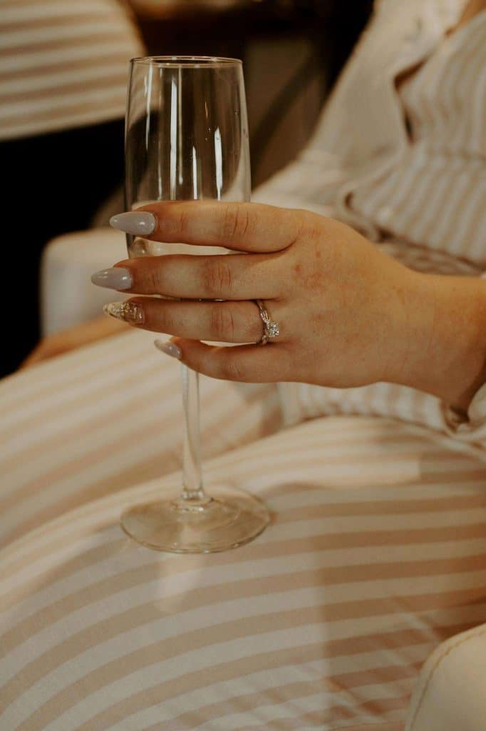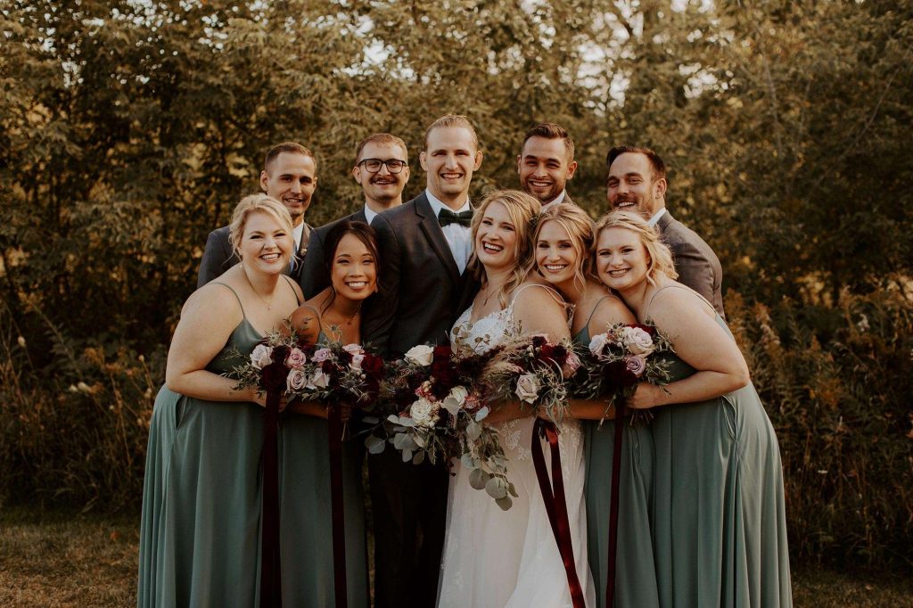 The two planned a September wedding in 2021 with a boho, woodsy theme. Both the ceremony and reception were held at Fête of Wales. “This was the first thing we booked! We wanted a stunning venue where we could do the ceremony and reception while having plenty of room for our guests,” Bridgette says. “The floor-to-ceiling windows overlooking the west-facing pond sold me. Additionally, the bride and groom suites were amazing to get ready in—we did hair and makeup on site.”
