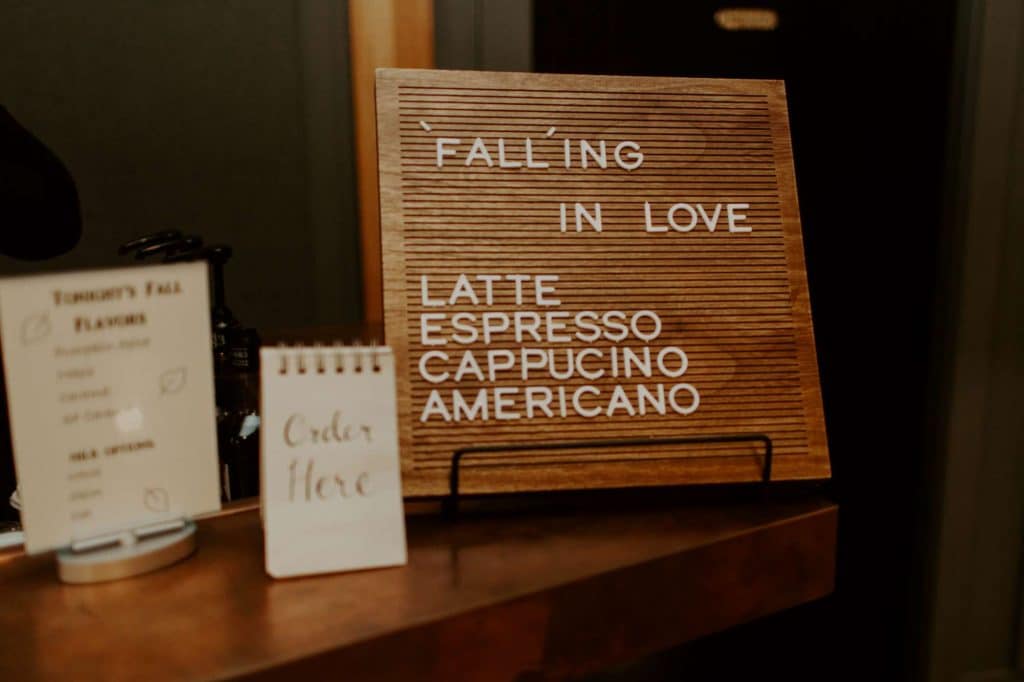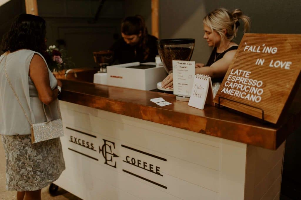 There was an appetizer hour immediately following the ceremony with passed apps, platters, and cocktails—plus a coffee cart! “Our coffee cart with Excess Coffee Co had a custom fall beverage menu.”