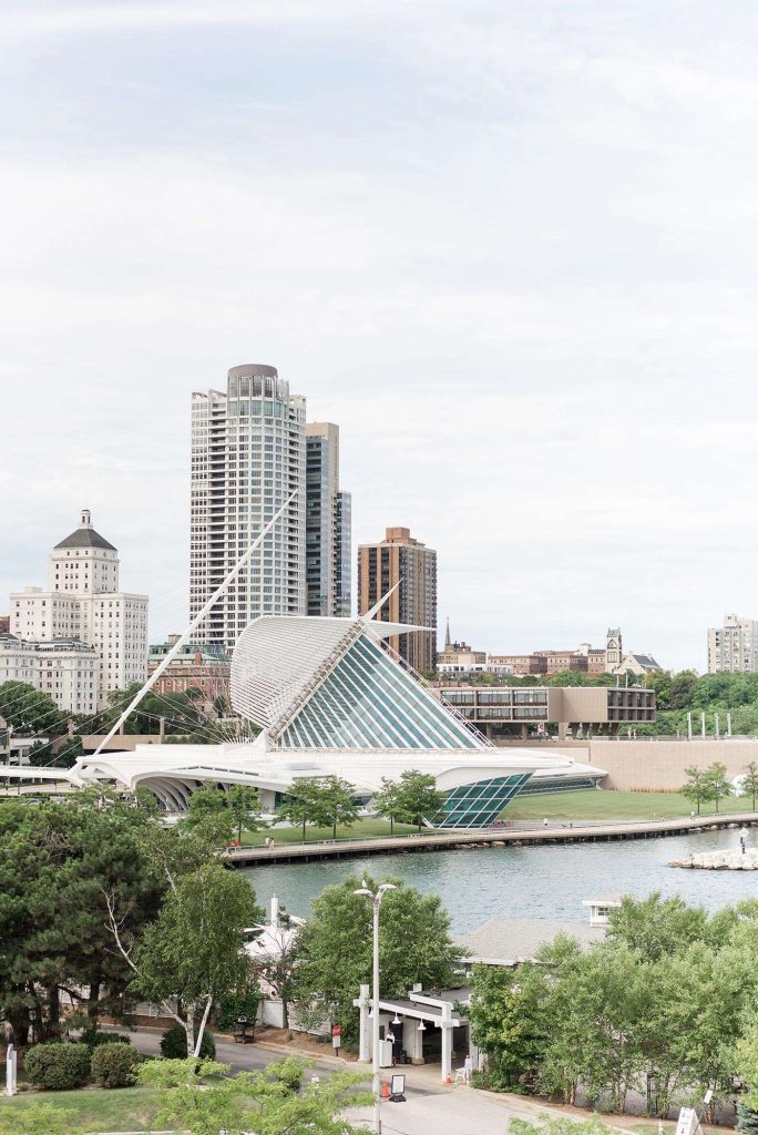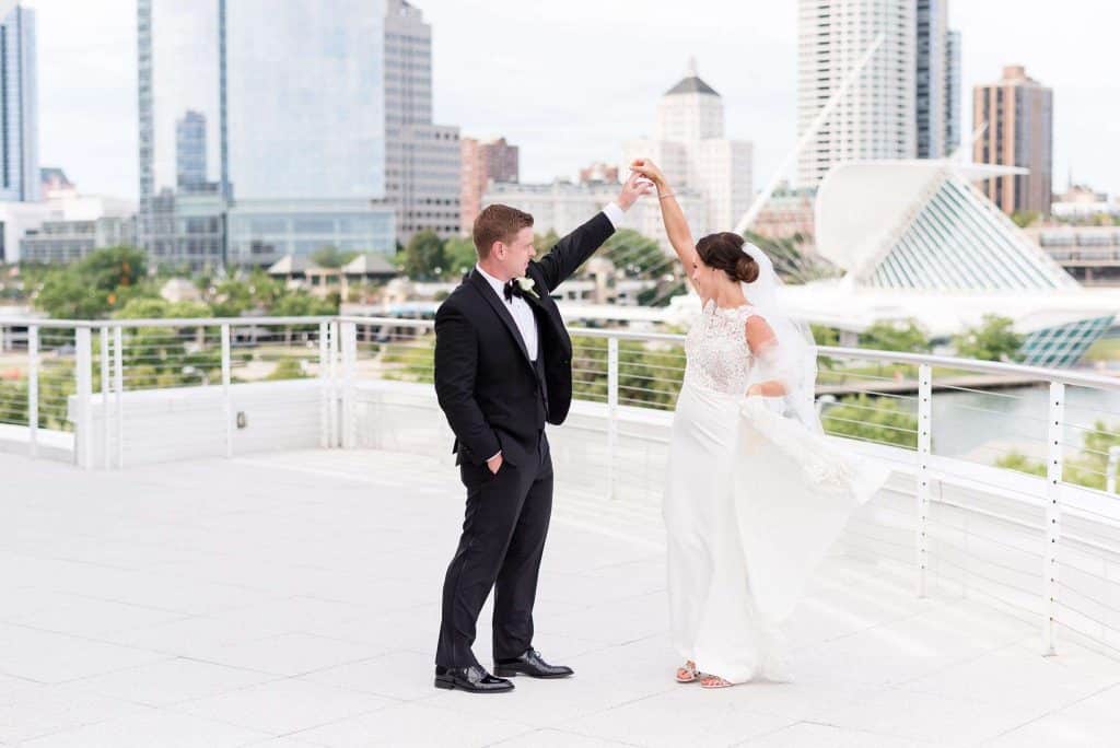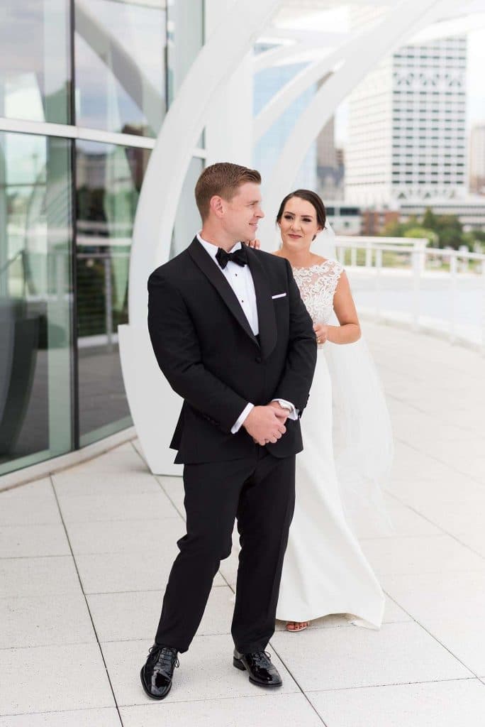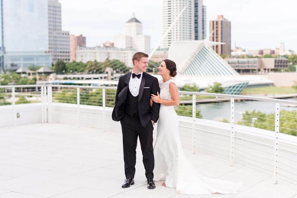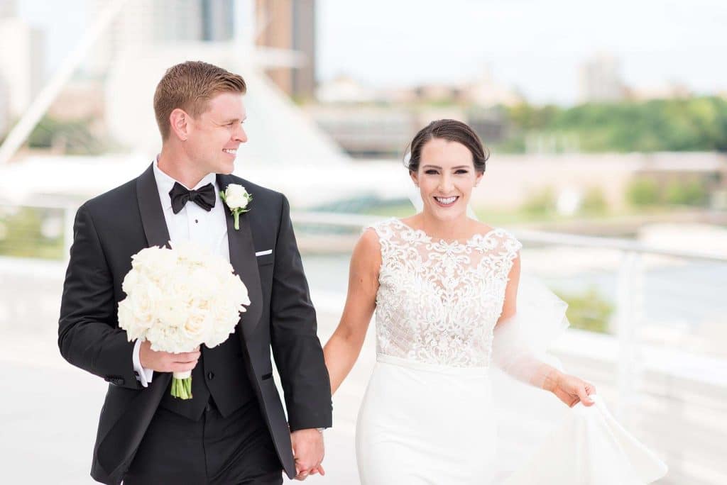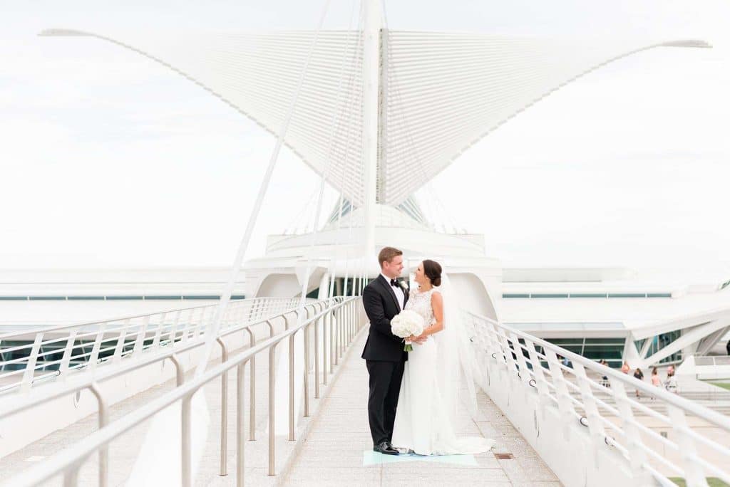 Kyle and Brooklyn picked picture locations that are both special and stunning. The first batch of photos was taken at the bride and groom’s home in Bay View, where the girls were getting ready. The fellas had photos taken at the Kimpton Journeyman Hotel in the Third Ward. Family photos were snapped at Discovery World on the patio. “Kyle and I also snuck away to take some photos on the Reiman Footbridge in front of the Milwaukee Art Museum.”