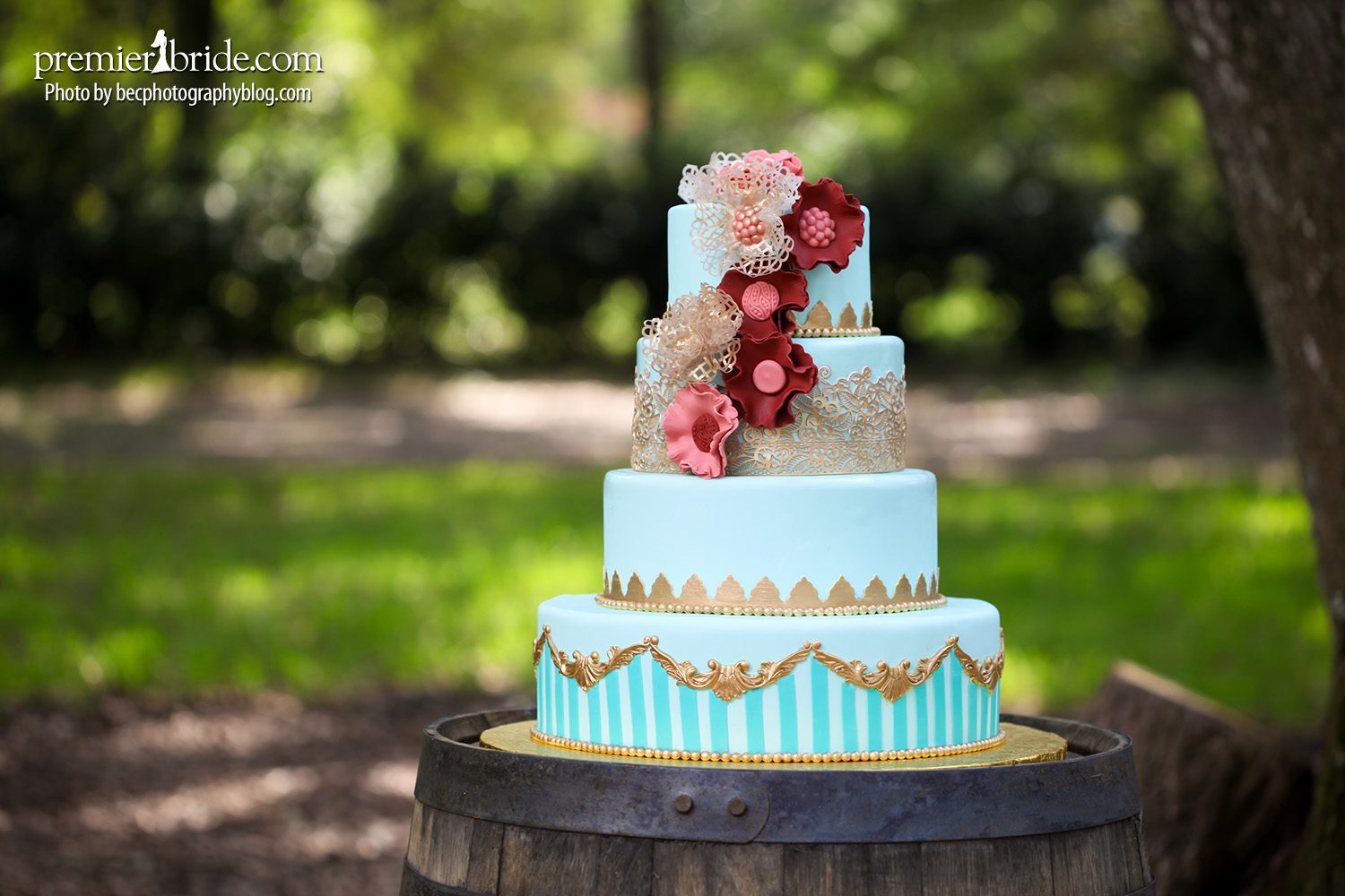 The cake was created by Edgewood Bakery. They used our color palette and incorporated patterns and designs seen in “Vintage Carnival” memorabilia like stripes, gold ribbons, and lacy flowers.