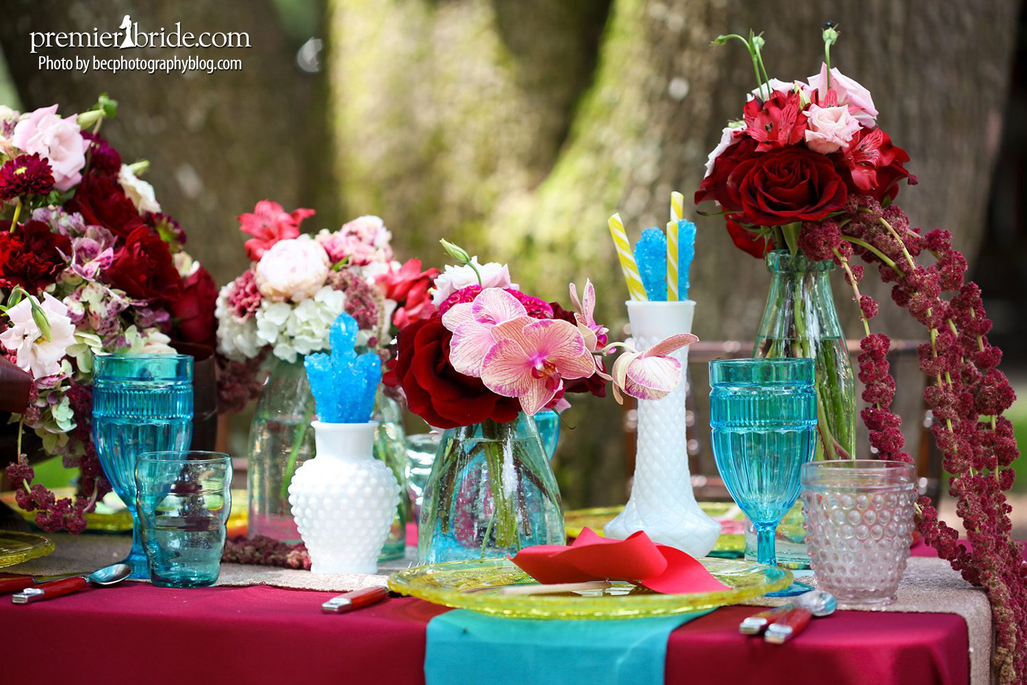 Anything with Plants and Flowers and Coastal Coordination created our second table scape. They used the deep reds and teals as the propionate colors in their design. Their interpretation of “Vintage Carnival” was incorporating vintage rock candy and sticks.