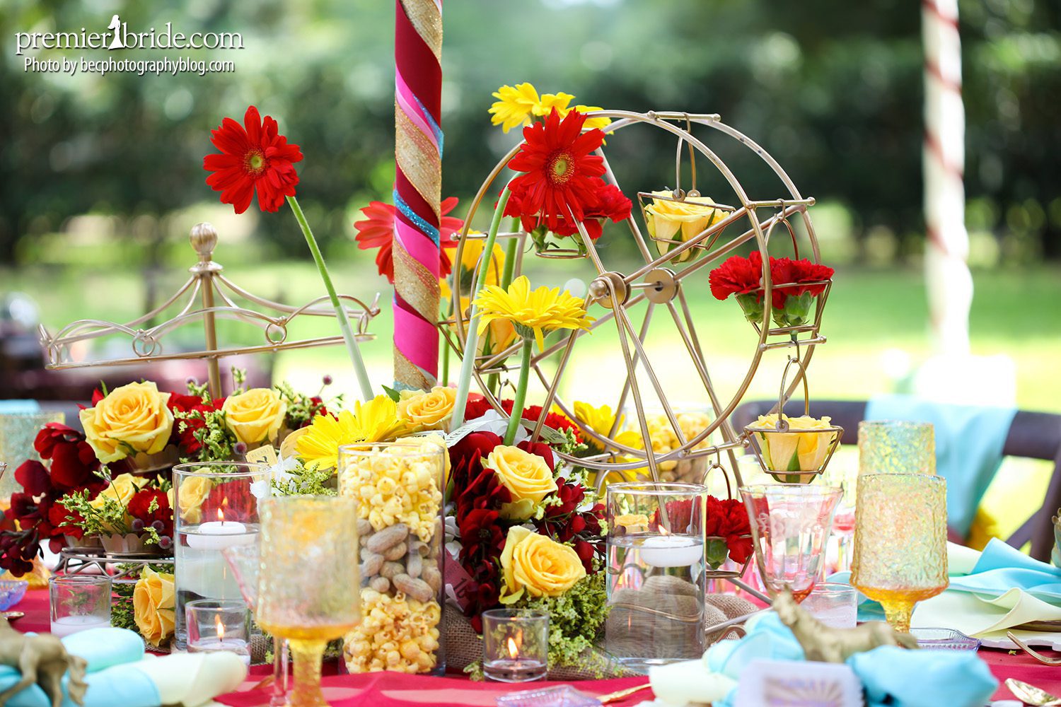 Destination Planning used many of the traditional “Vintage Carnival” elements in their design, like Ferris wheels and carousals. They also used peanuts and popcorn as a snack and part of the table décor. Brightly colored flowers added the pop of color to their table.
