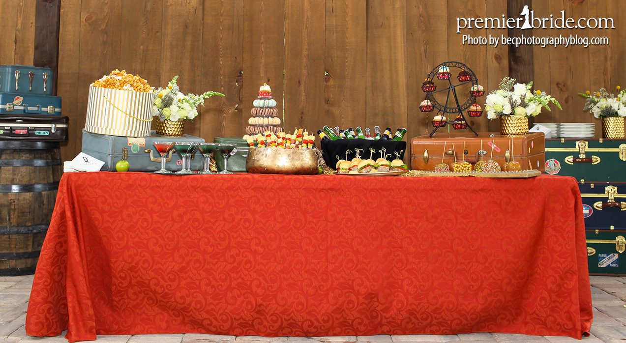 Mathew’s Catering created a cocktail hour spread of caramel apples, deconstructed hot dogs, cotton candy martini’s, popcorn, vintage sodas and sliders.