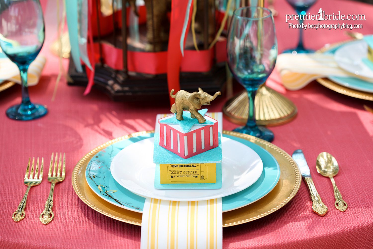 This table scape was designed by “I do Weddings by Cindy,” she encompassed the coral table cloths with dishes and steam wear in the teals and gold accent pieces. She had subtle hints of “Vintage Carnival” with gold elephants and vintage tickets as accent pieces.